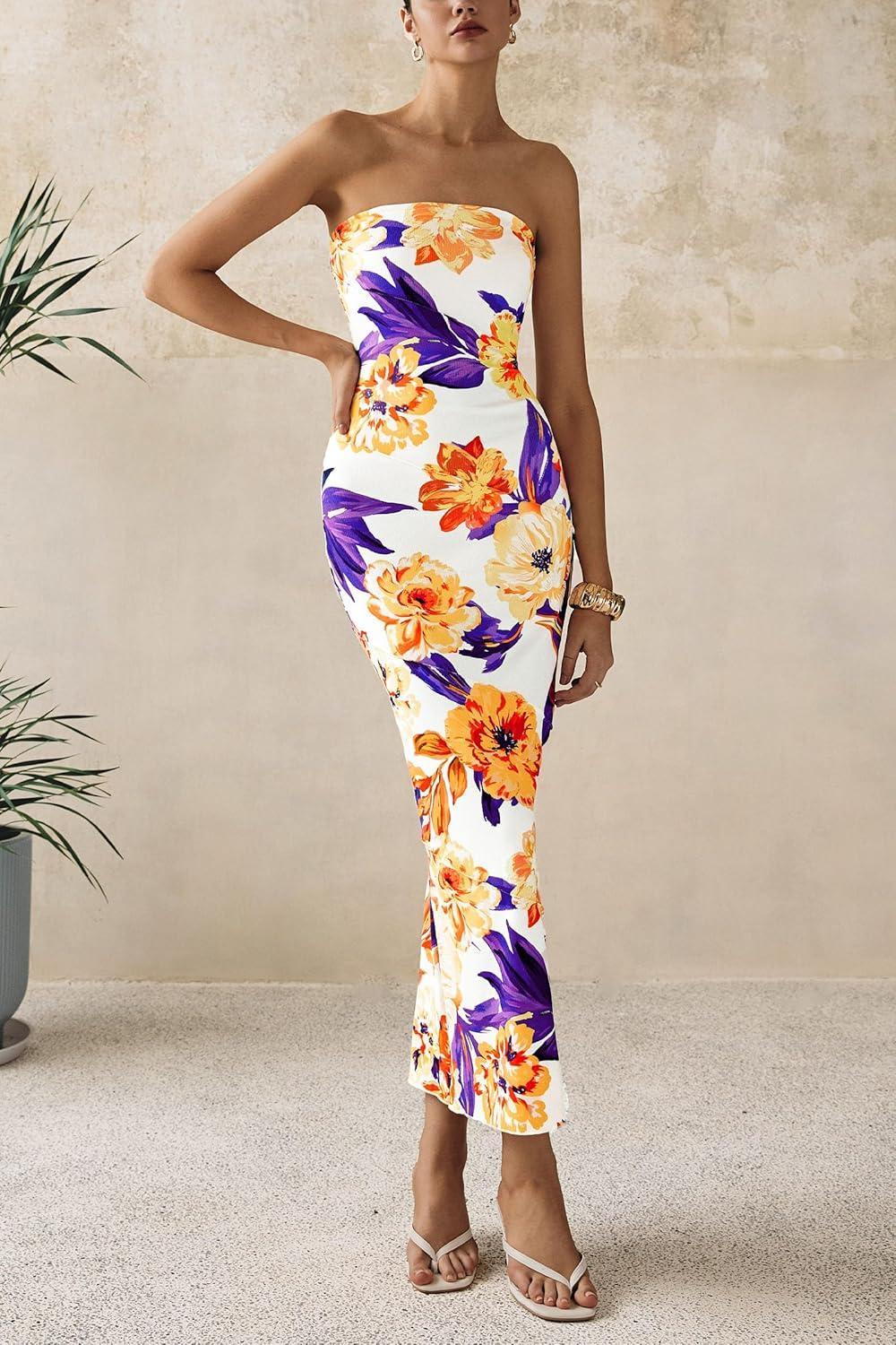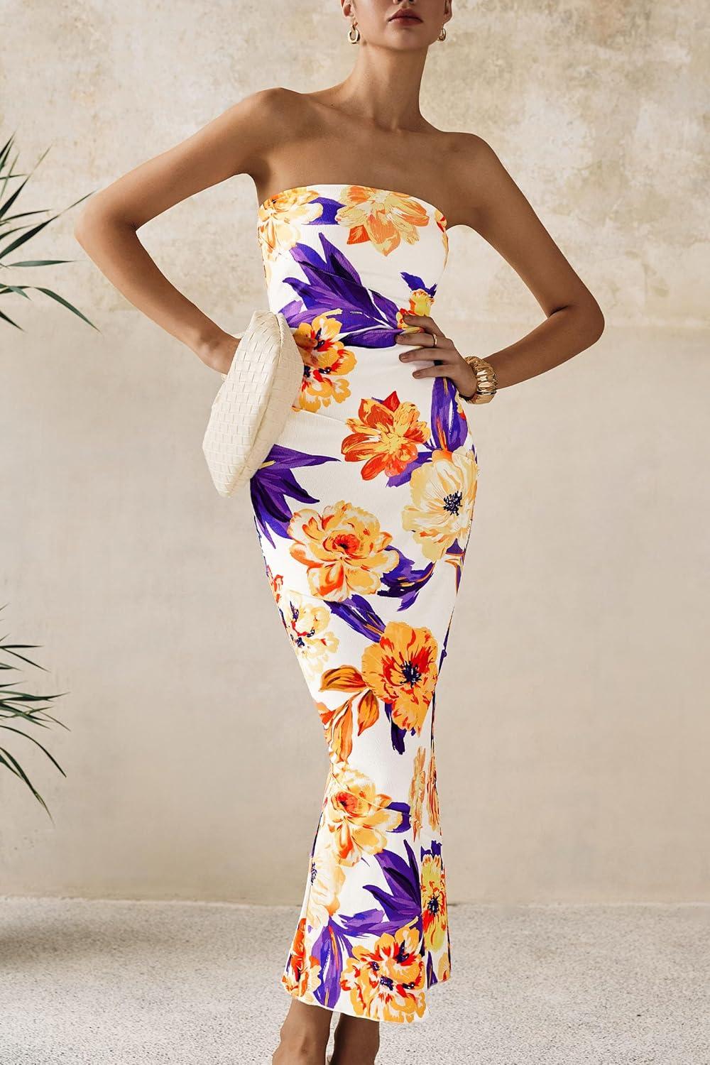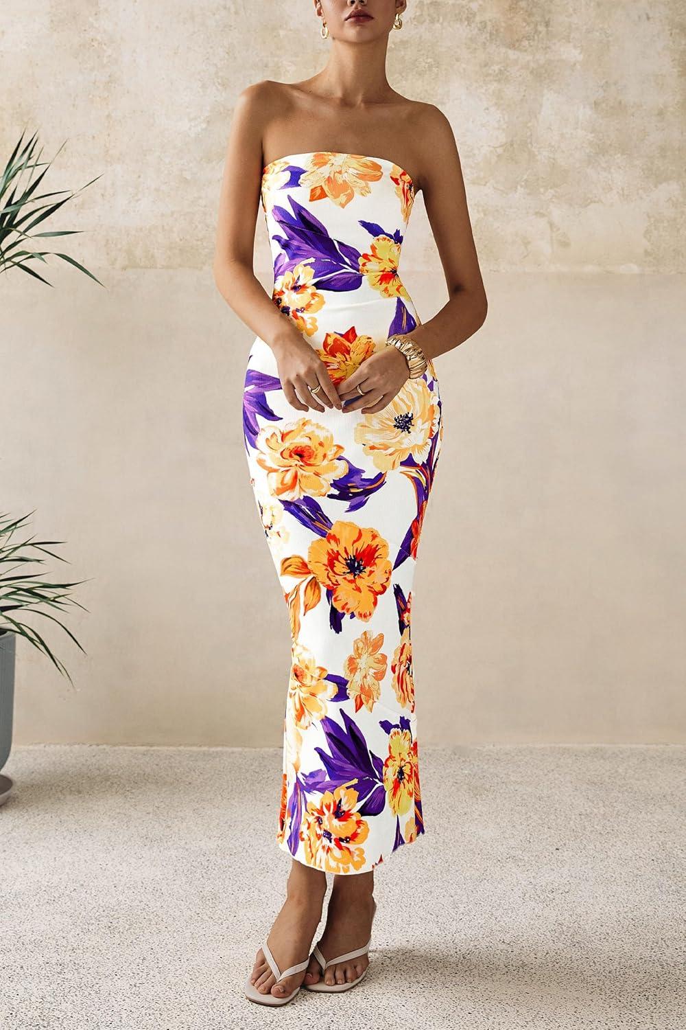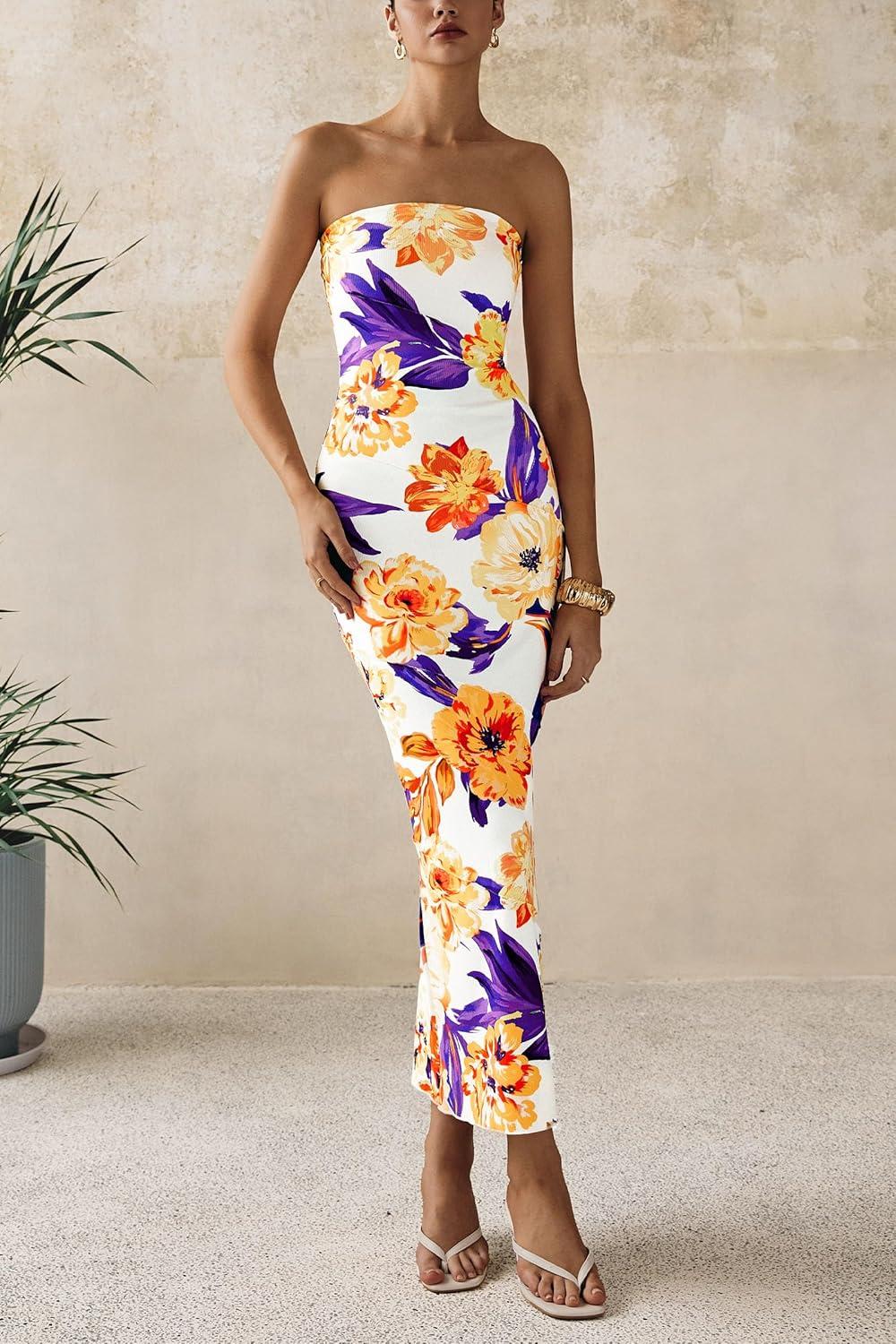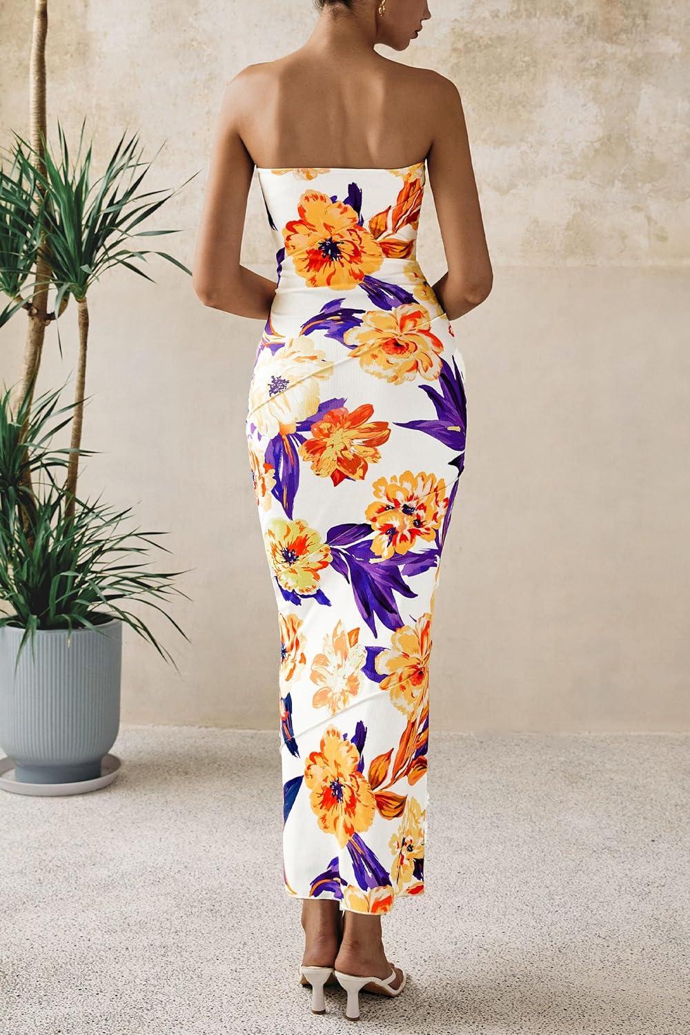 PRETTYGARDEN Women's 2025 Summer Floral Bodycon Maxi Dresses Ribbed Strapless Tube Casual Boho Party Long Dress(Floral White Yellow)