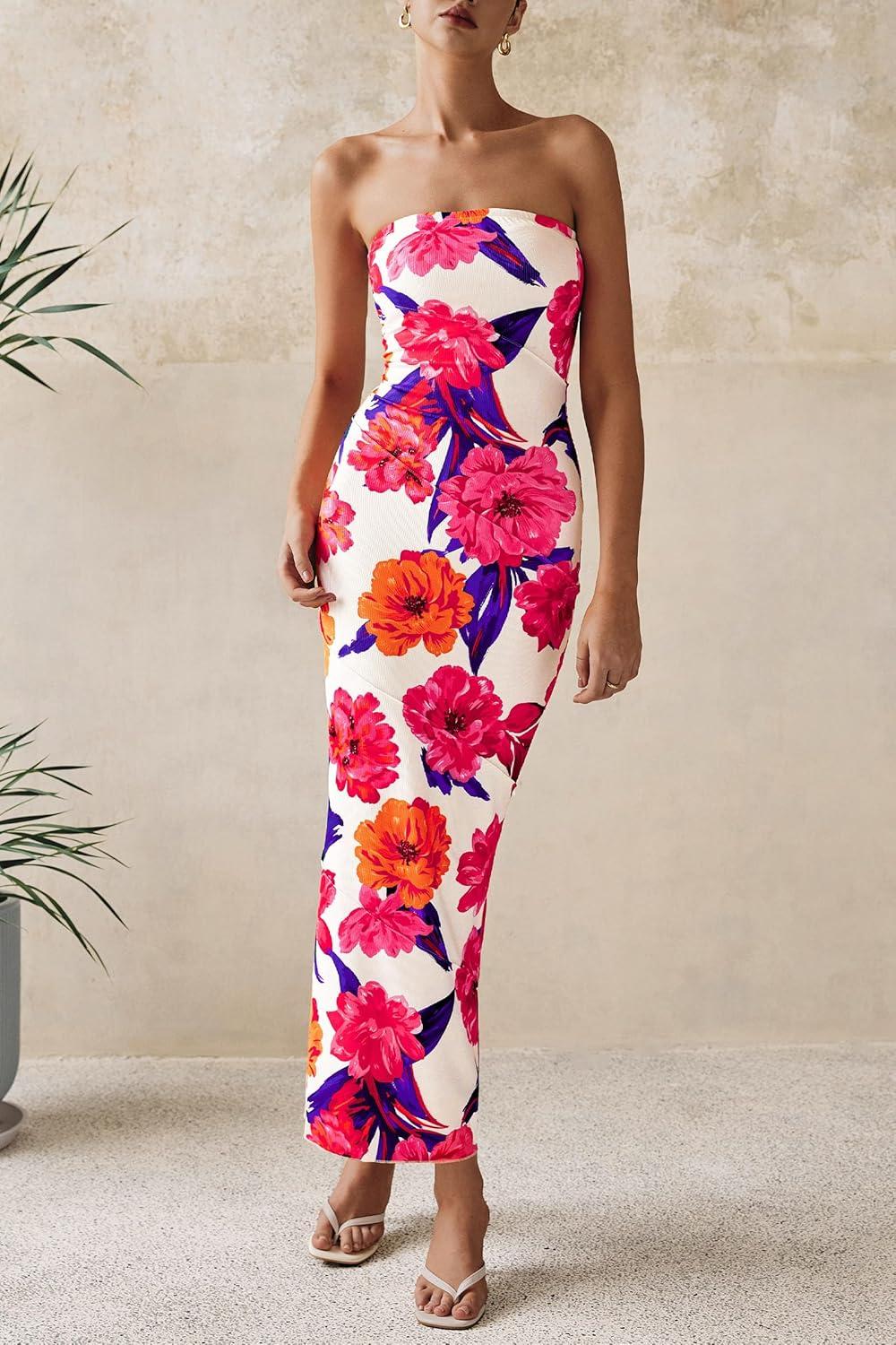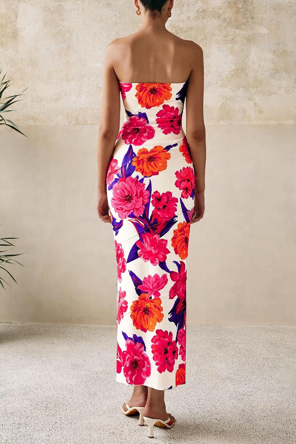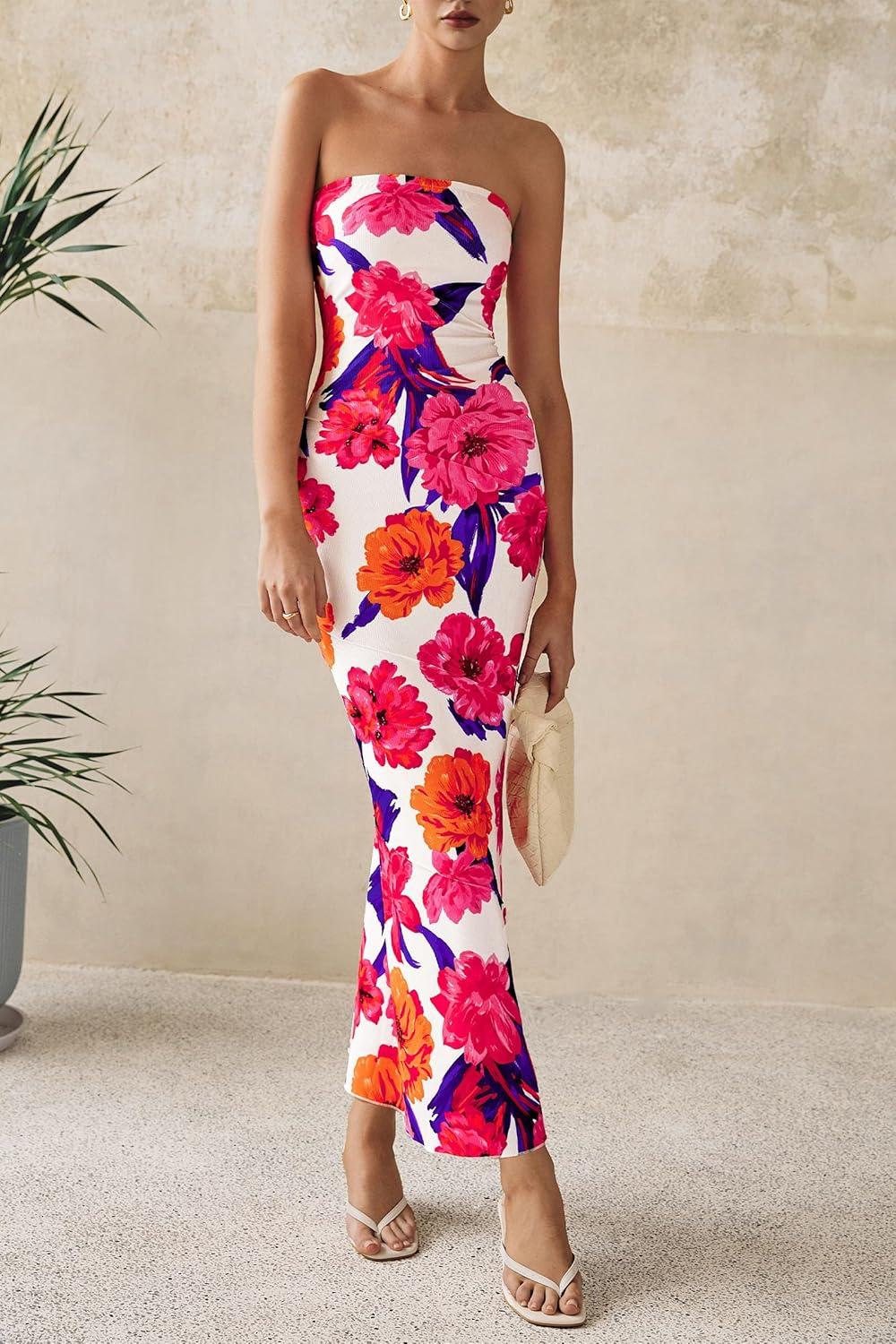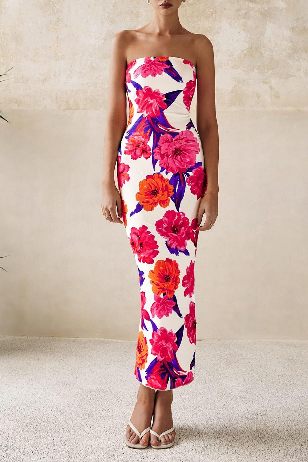 PRETTYGARDEN Women’s 2025 Summer Floral Bodycon Maxi Dresses Ribbed Strapless Tube Casual Boho Party Long Dress(Floral Pink Red)