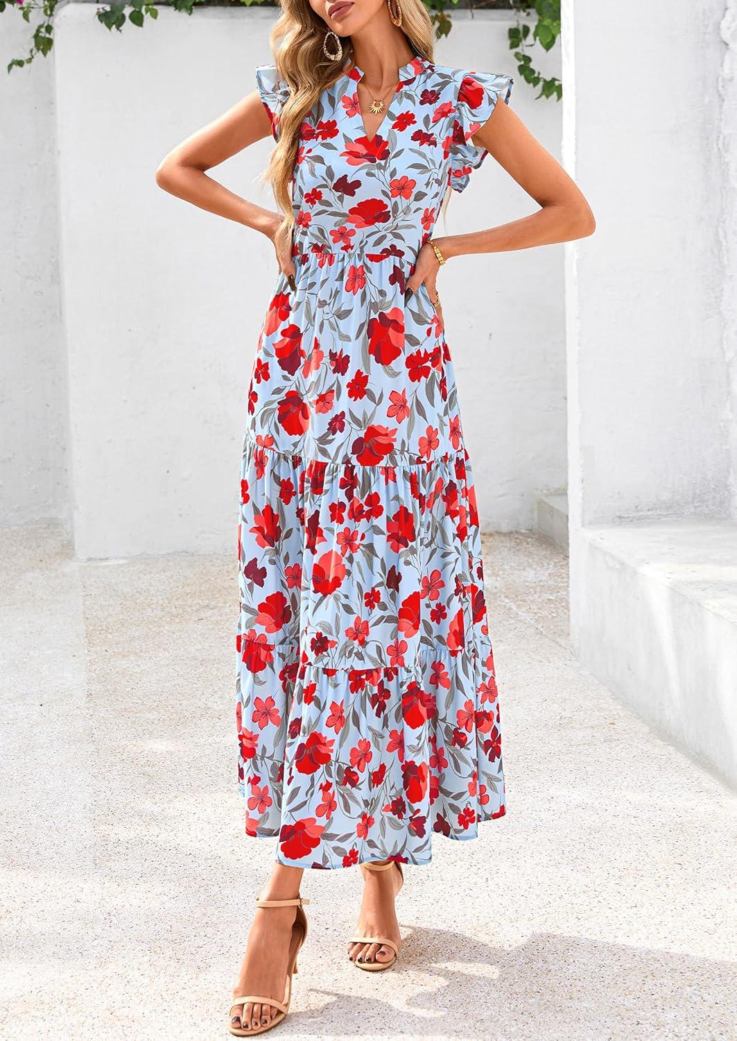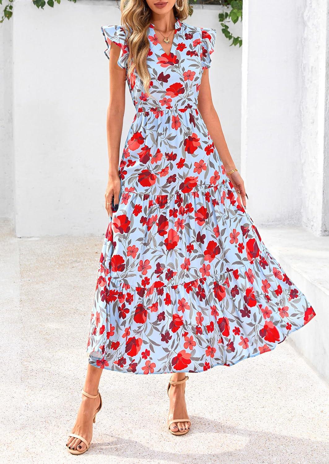 PRETTYGARDEN Women's 2025 Summer Floral Midi Dress Cap Sleeve V Neck Ruffle Long Flowy Boho Casual Beach Vacation Dresses(Floral Blue Red)
