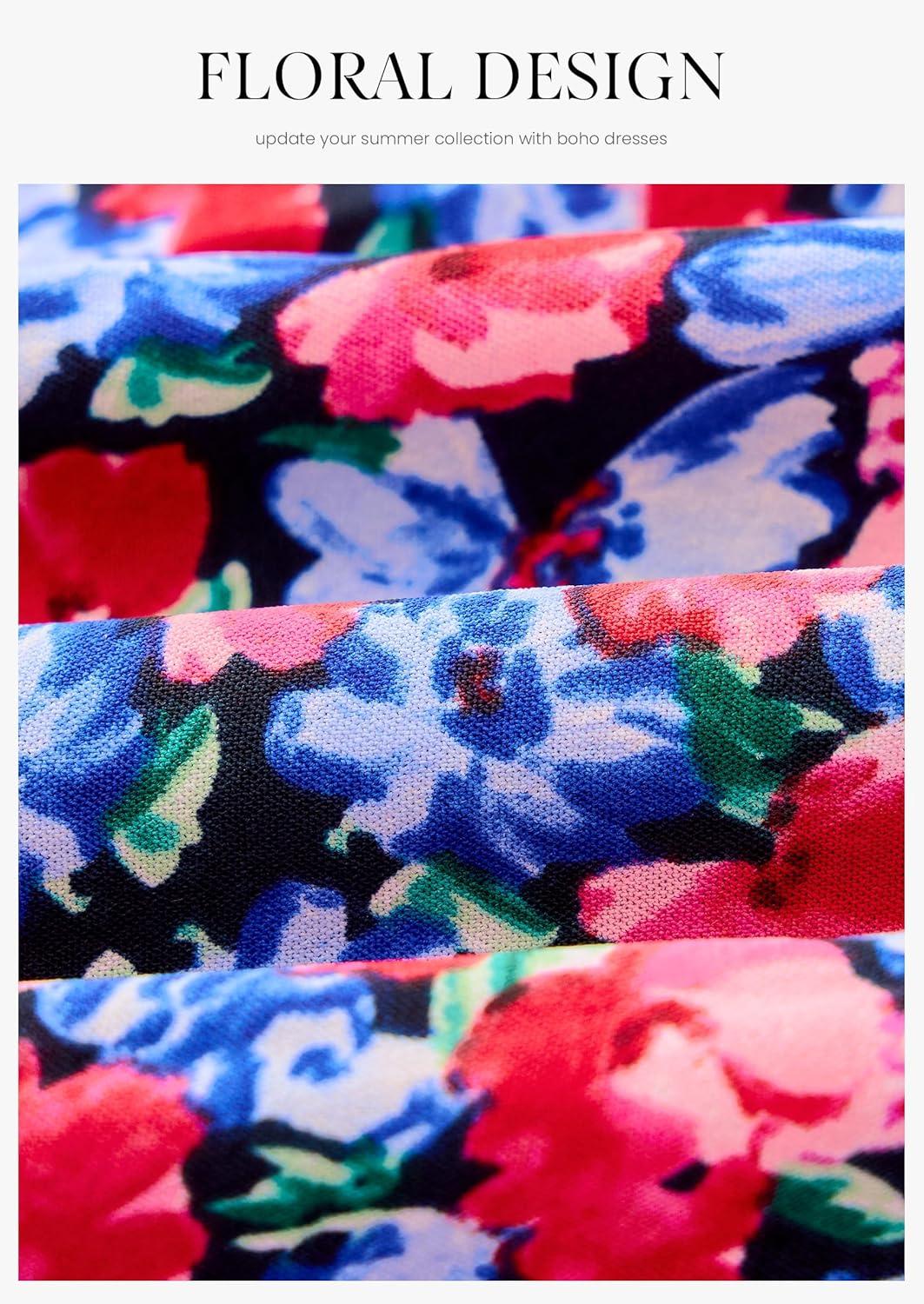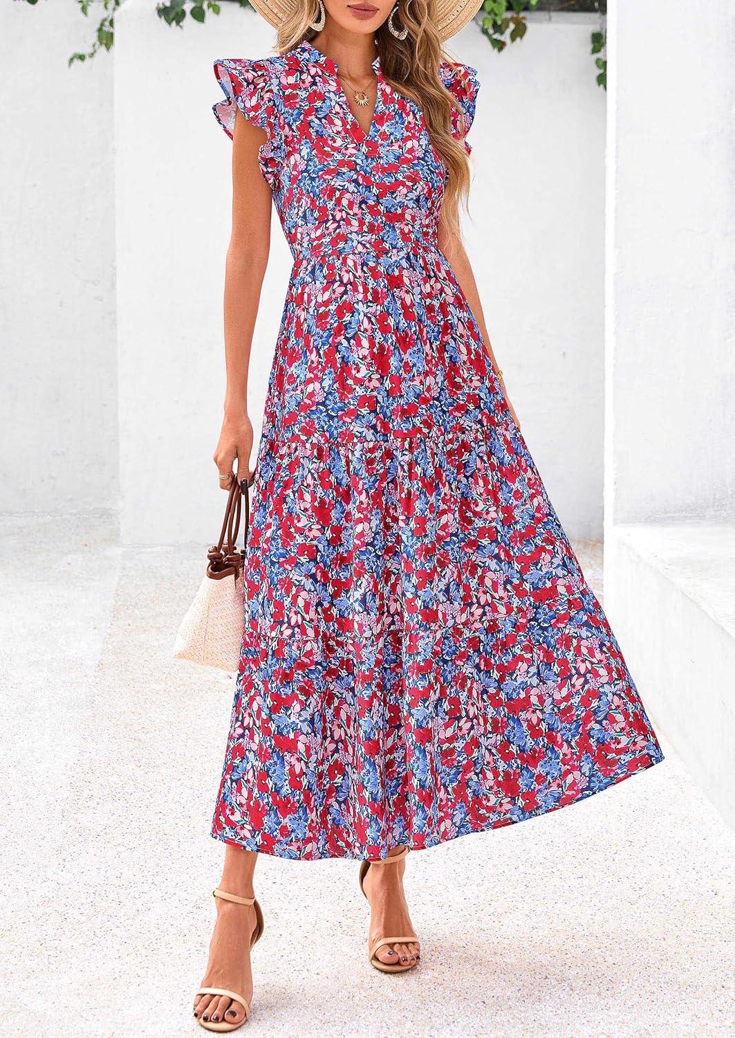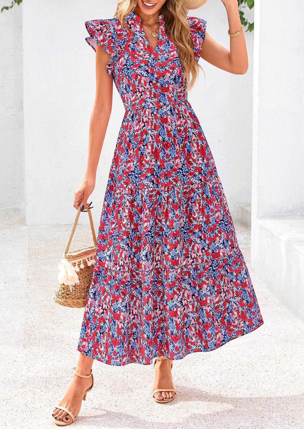 PRETTYGARDEN Women's 2025 Summer Floral Midi Dress Cap Sleeve V Neck Ruffle Long Flowy Boho Casual Beach Vacation Dresses(Floral Navy Red)