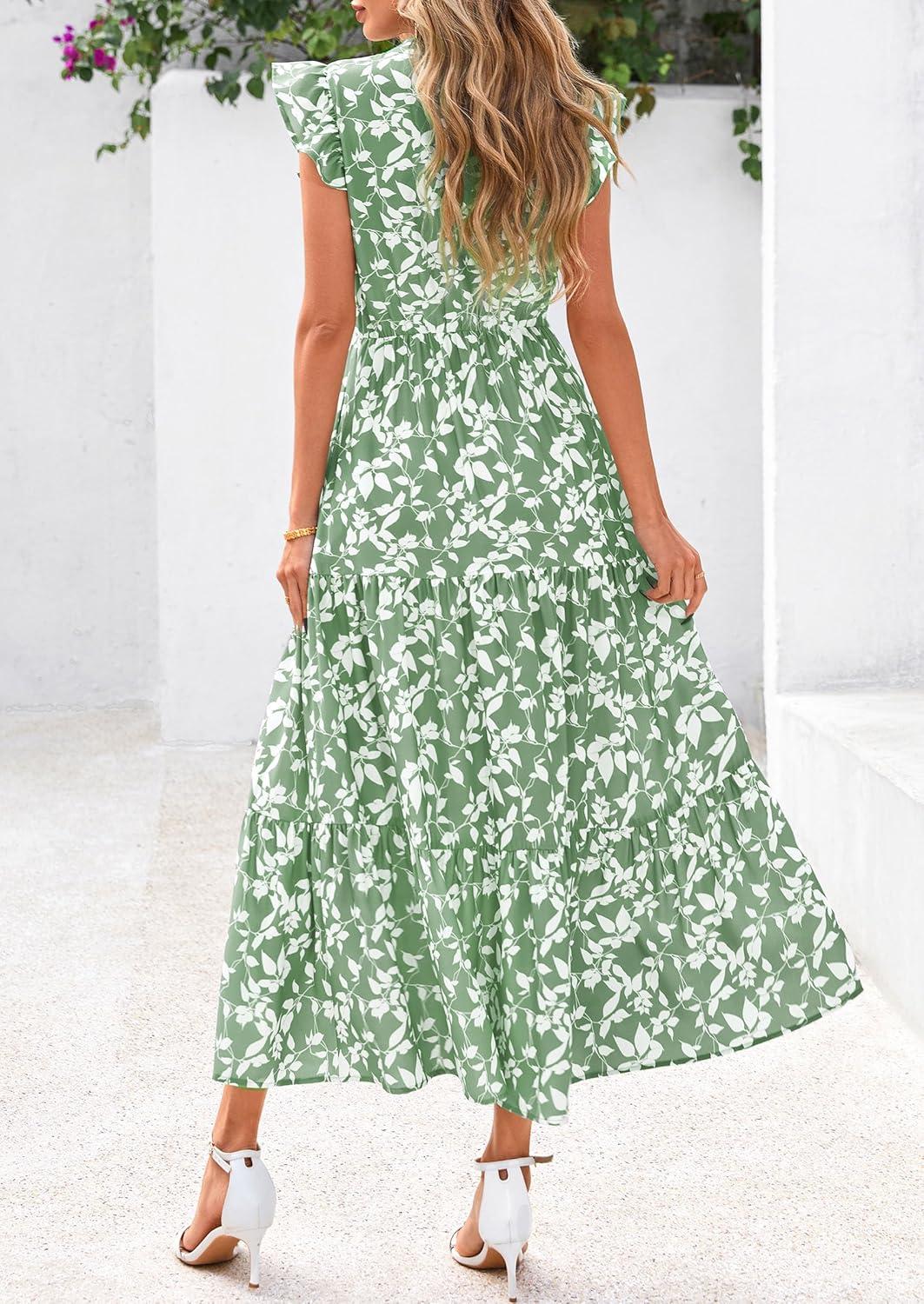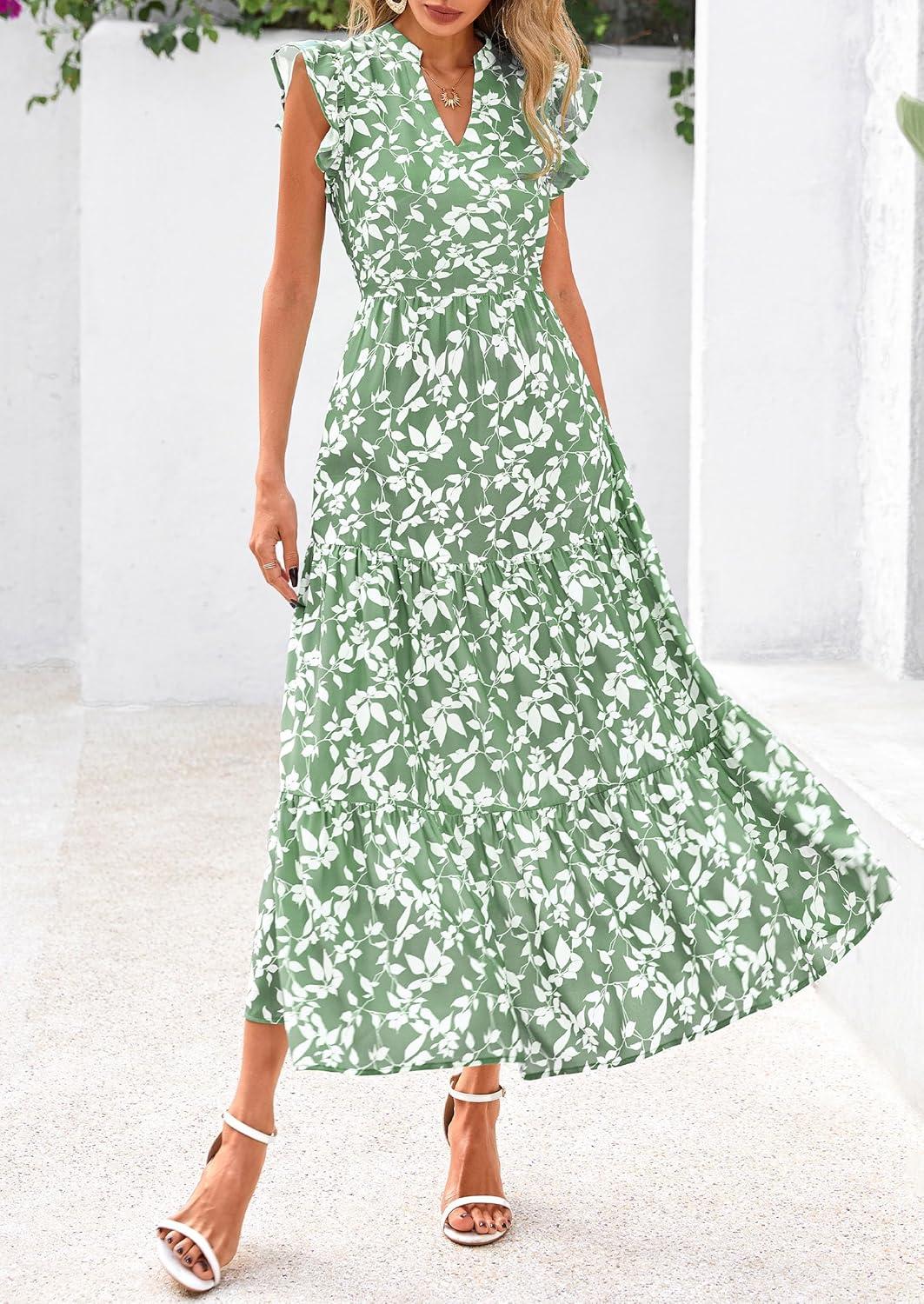 PRETTYGARDEN Women's 2025 Summer Floral Midi Dress Cap Sleeve V Neck Ruffle Long Flowy Boho Casual Beach Vacation Dresses(Leaves Light Green)