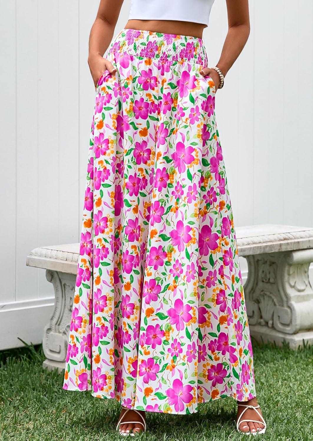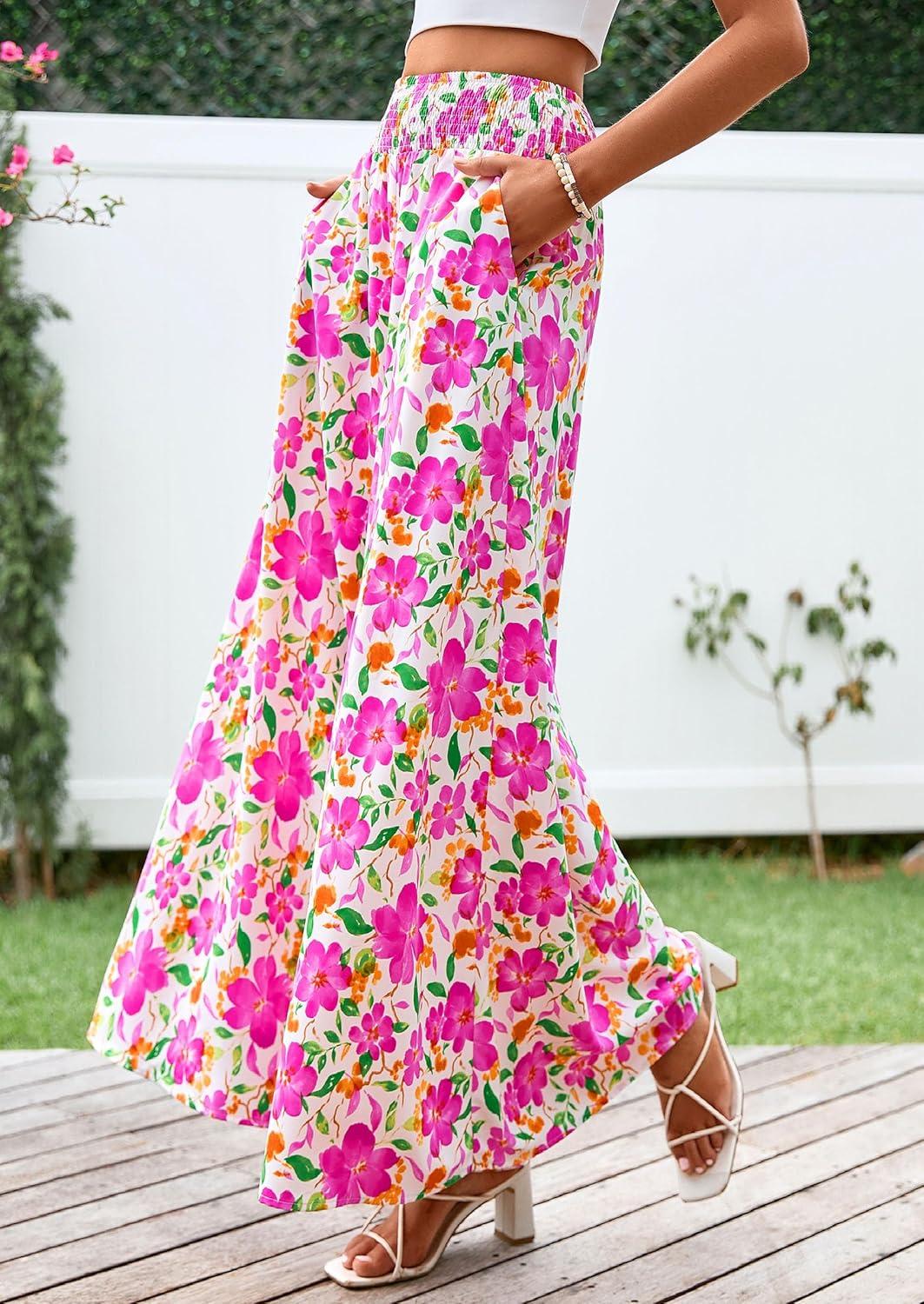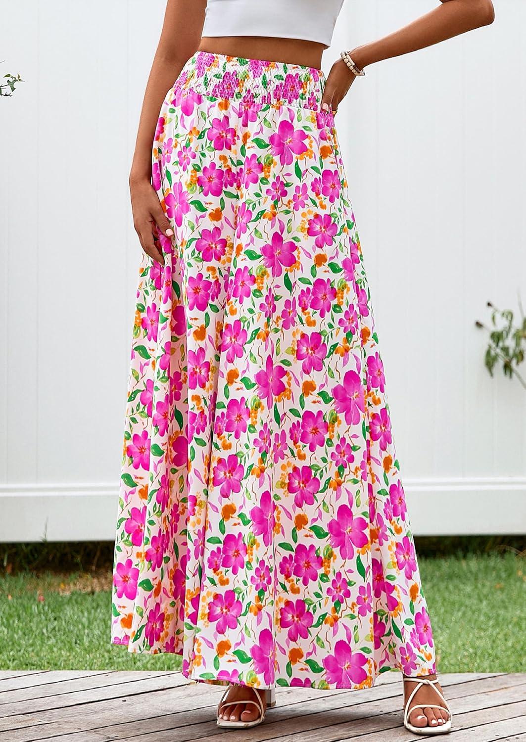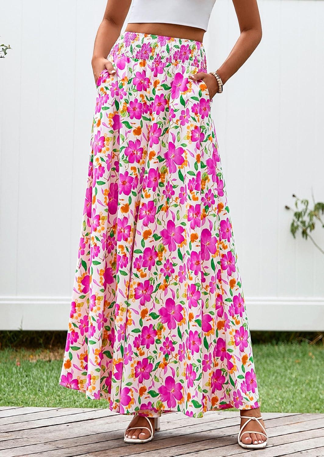 PRETTYGARDEN Women’s 2025 Summer Flowy Wide Leg Palazzo Pants Dressy Casual Elastic High Waisted Pockets Boho Beach Trousers(Floral White Multicolored)