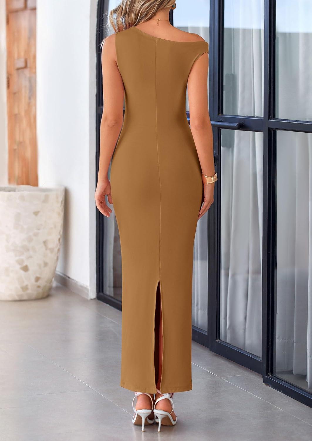 PRETTYGARDEN Women’s 2025 Summer Formal Maxi Dresses Sleeveless One Shoulder Bodycon Ruched Mesh Wedding Guest Cocktail Dress(Caramel)