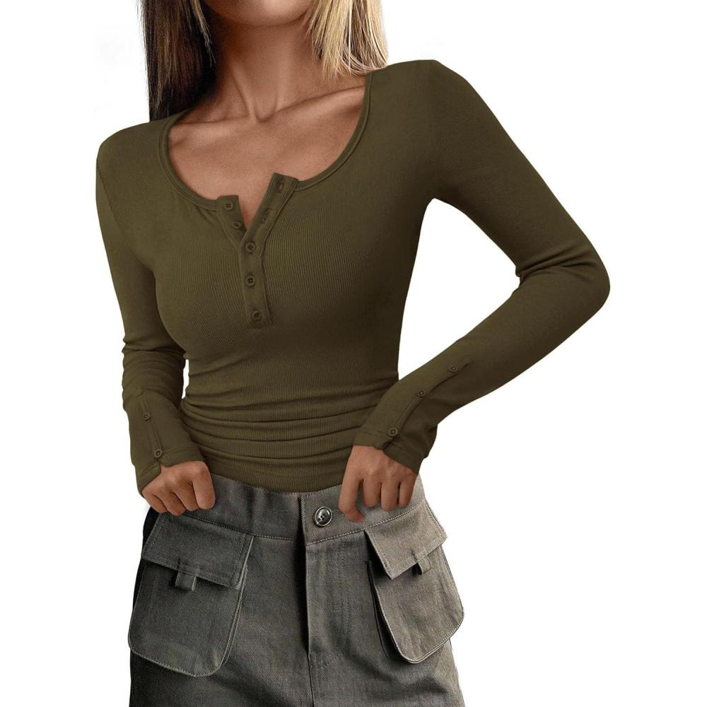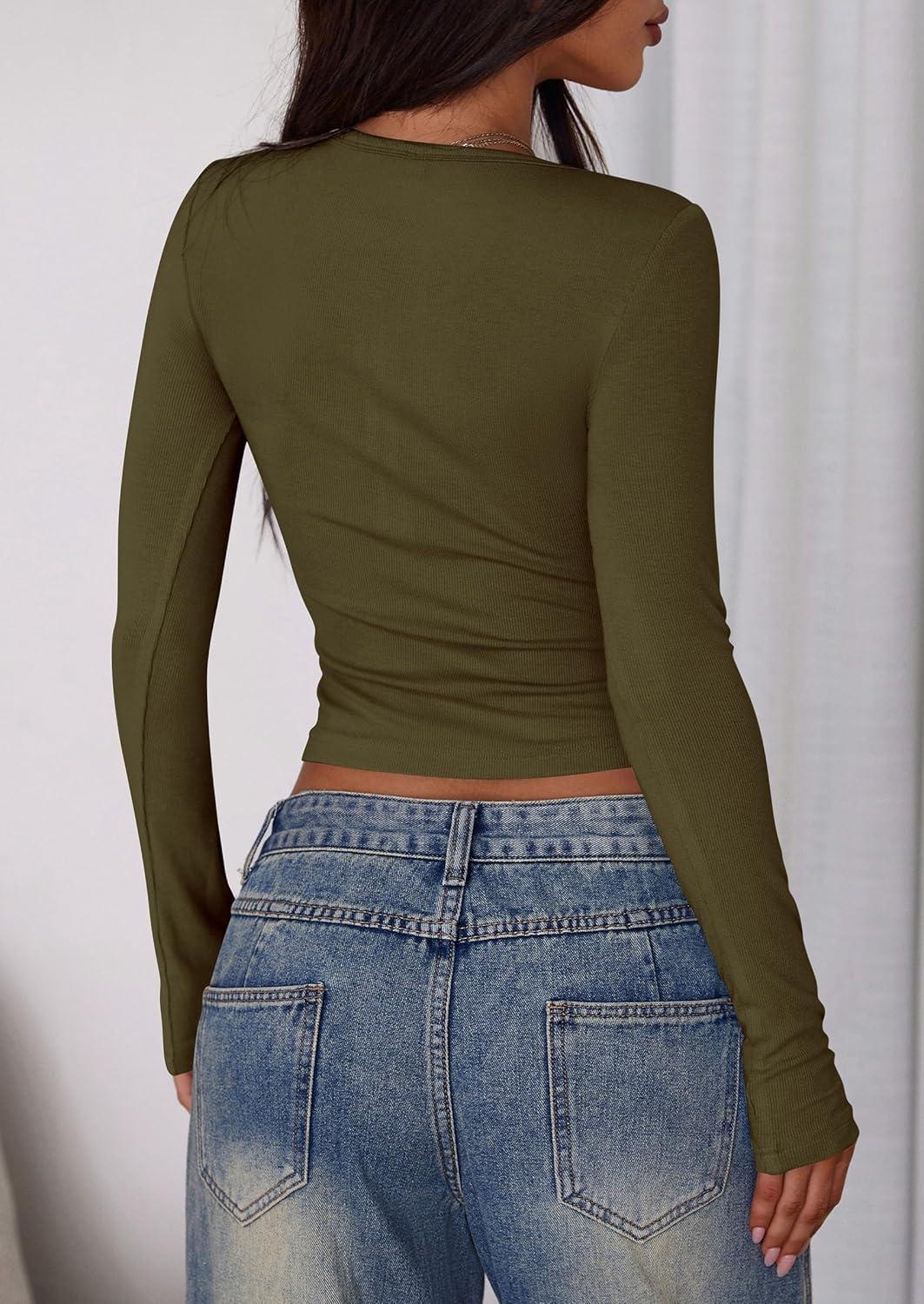 PRETTYGARDEN Women's 2025 Summer Long Sleeve Henley T Shirts Ribbed Knit Button Slim Fitted Basic Casual Going Out Fall Tops(Army Green)