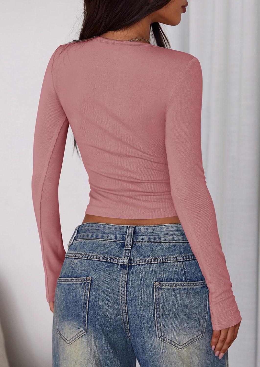 PRETTYGARDEN Women's 2025 Summer Long Sleeve Henley T Shirts Ribbed Knit Button Slim Fitted Basic Casual Going Out Fall Tops(Grey Pink)