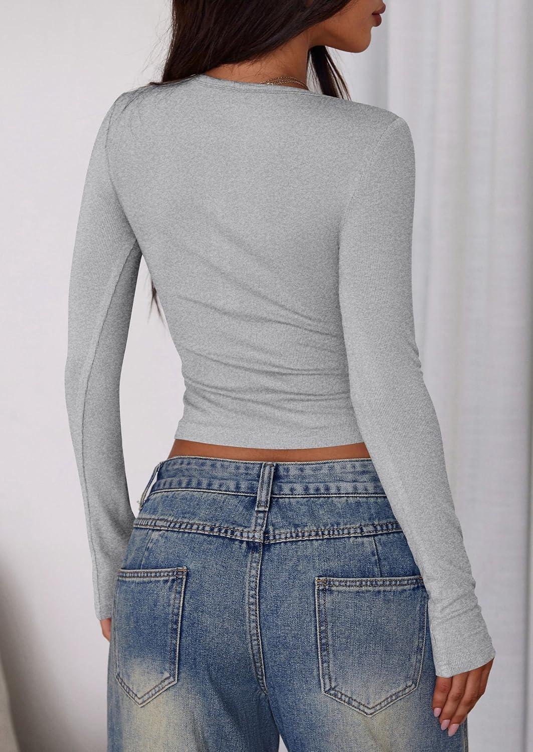 PRETTYGARDEN Women's 2025 Summer Long Sleeve Henley T Shirts Ribbed Knit Button Slim Fitted Basic Casual Going Out Fall Tops(Grey)