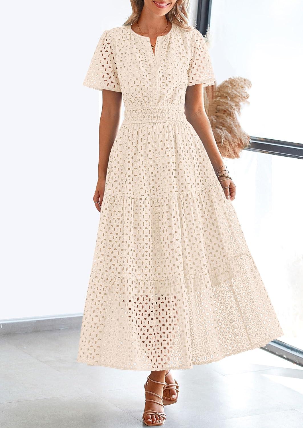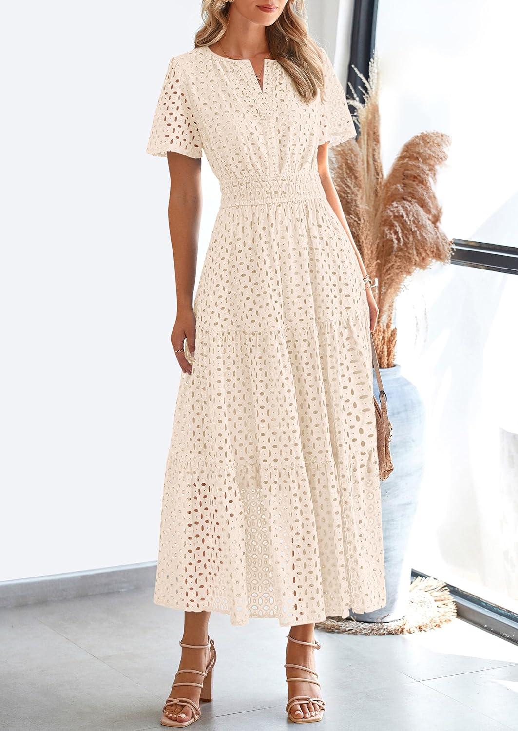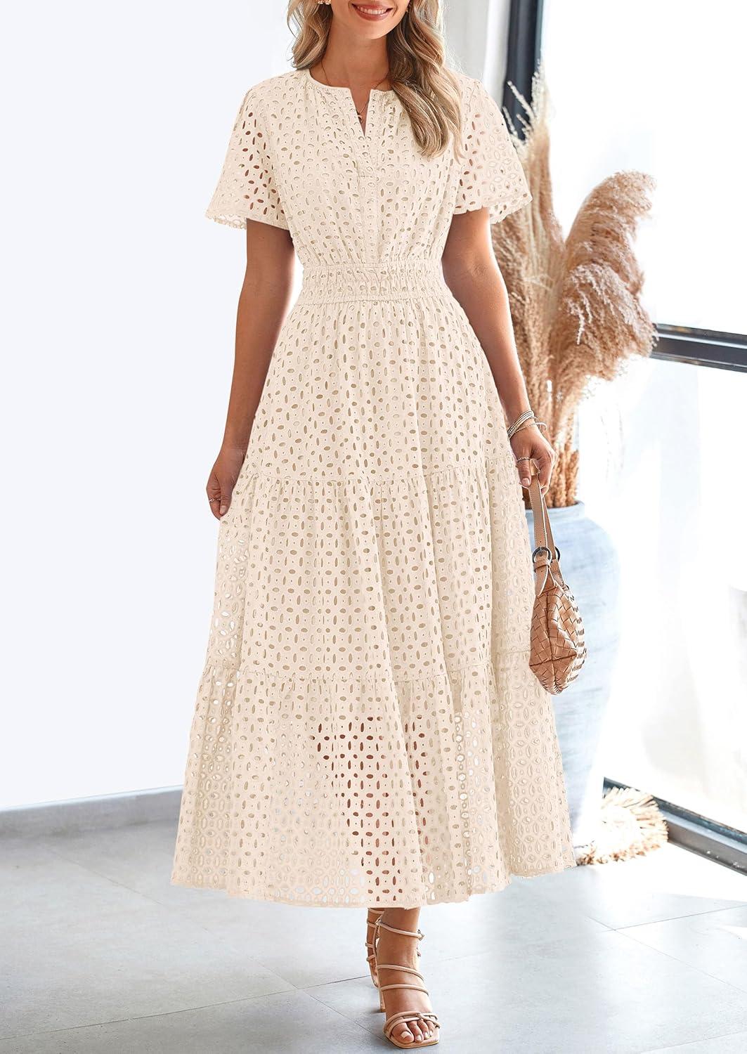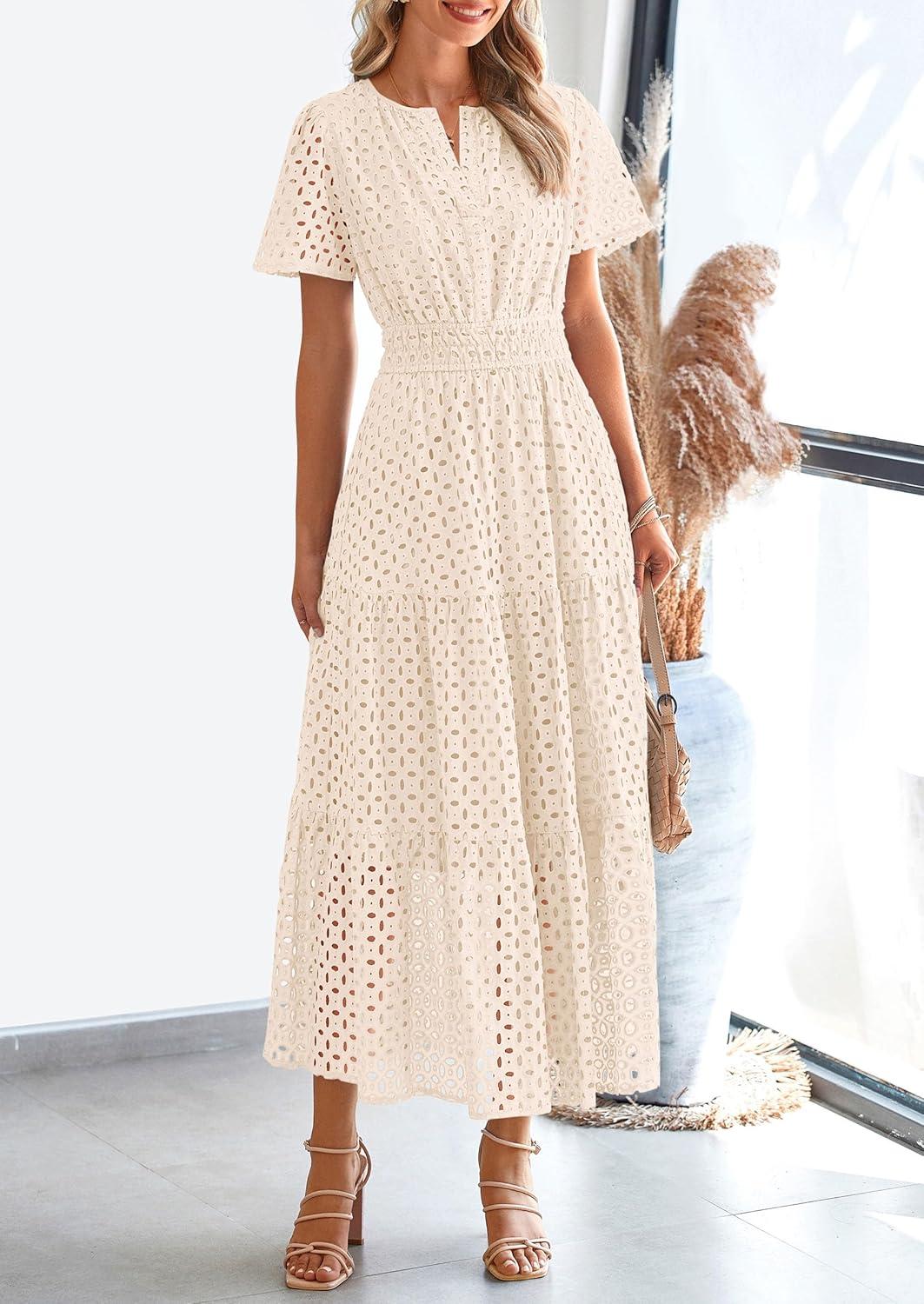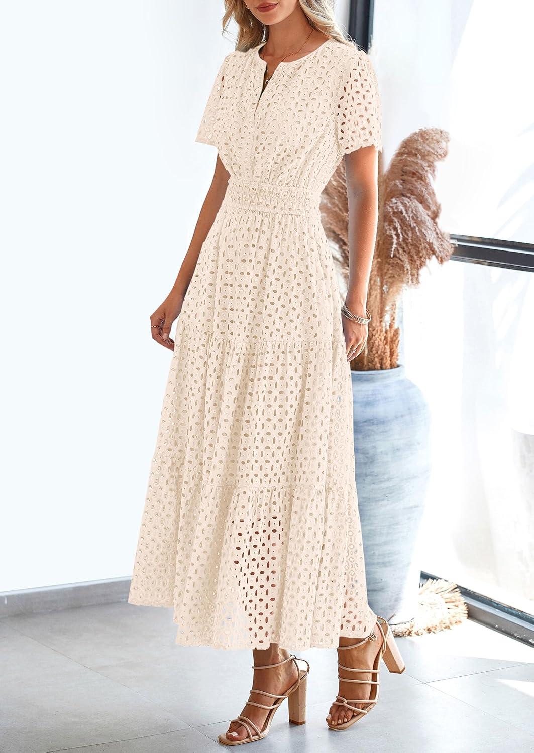PRETTYGARDEN Womens 2025 Summer Maxi Dress Short Sleeve V Neck Hollow Out Eyelet A Line Long Flowy Beach Vacation Dresses(Beige)