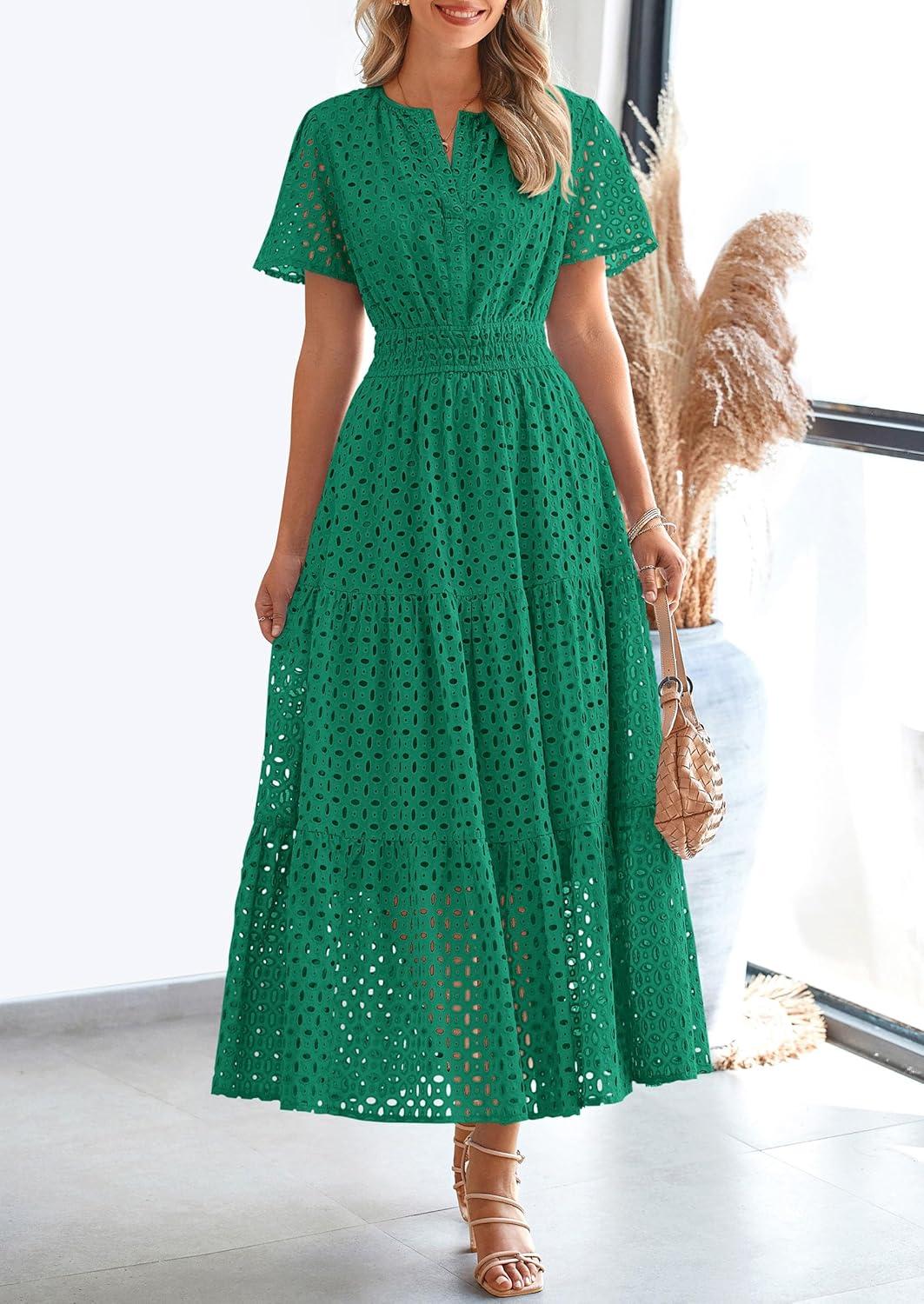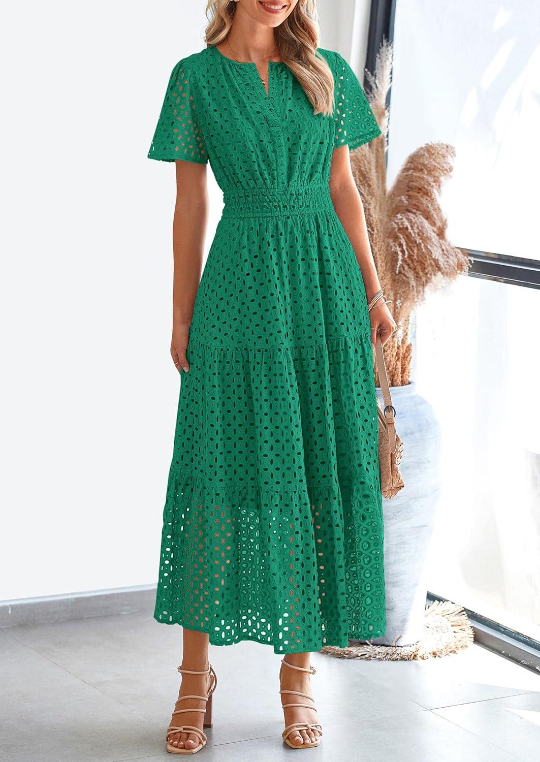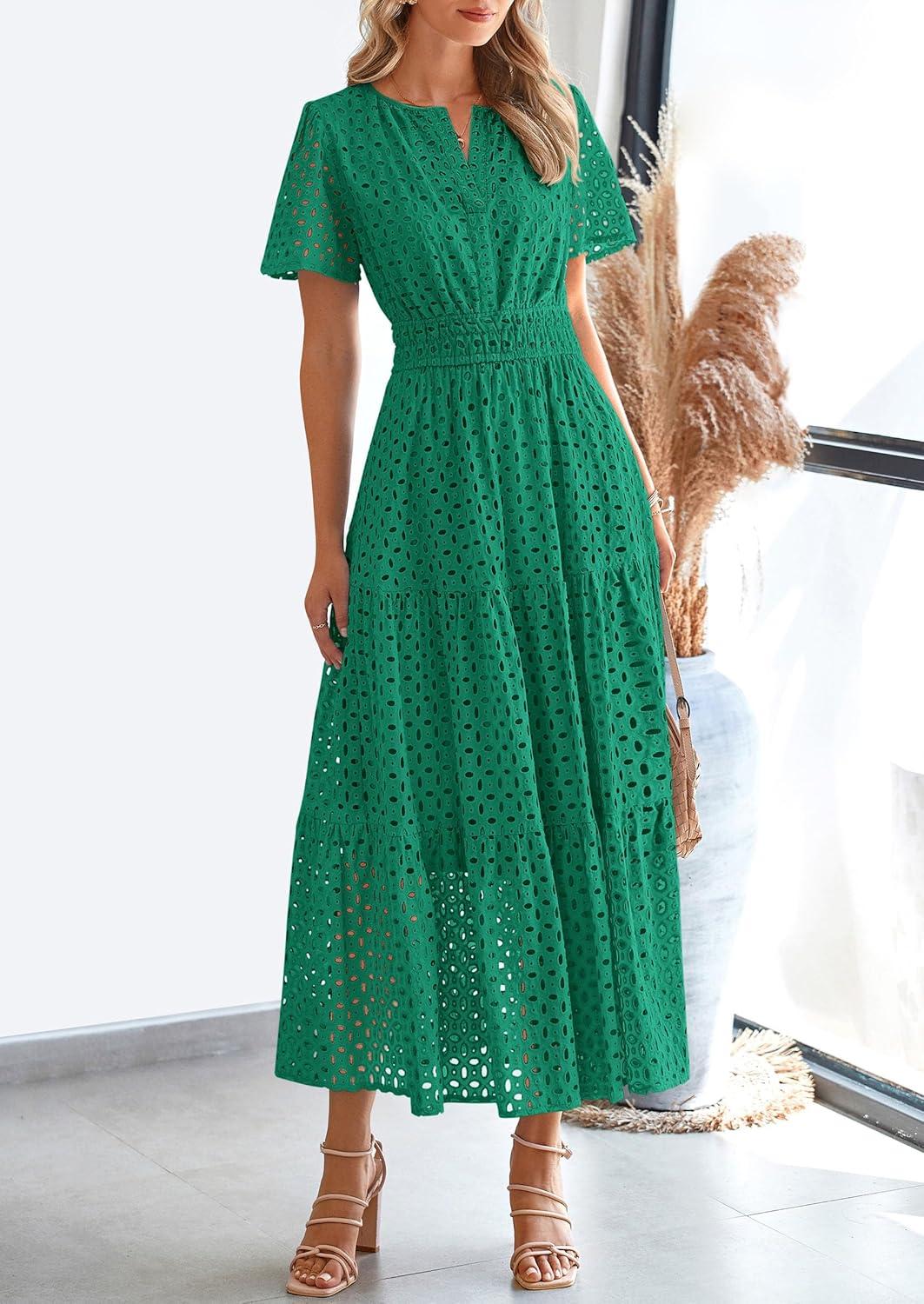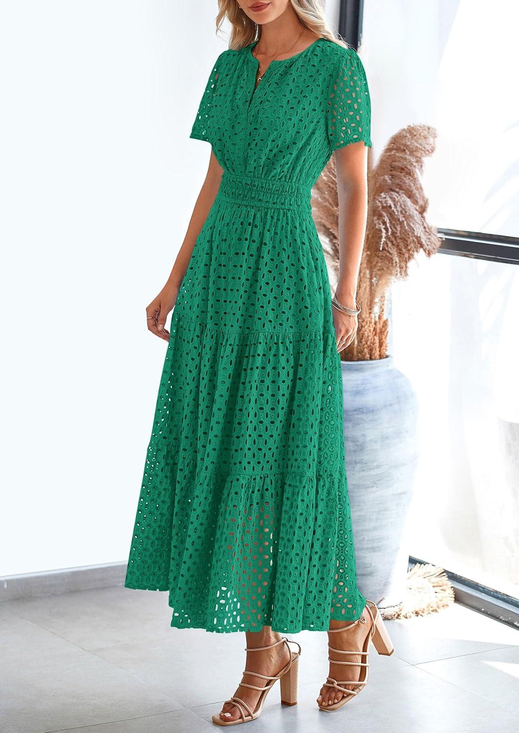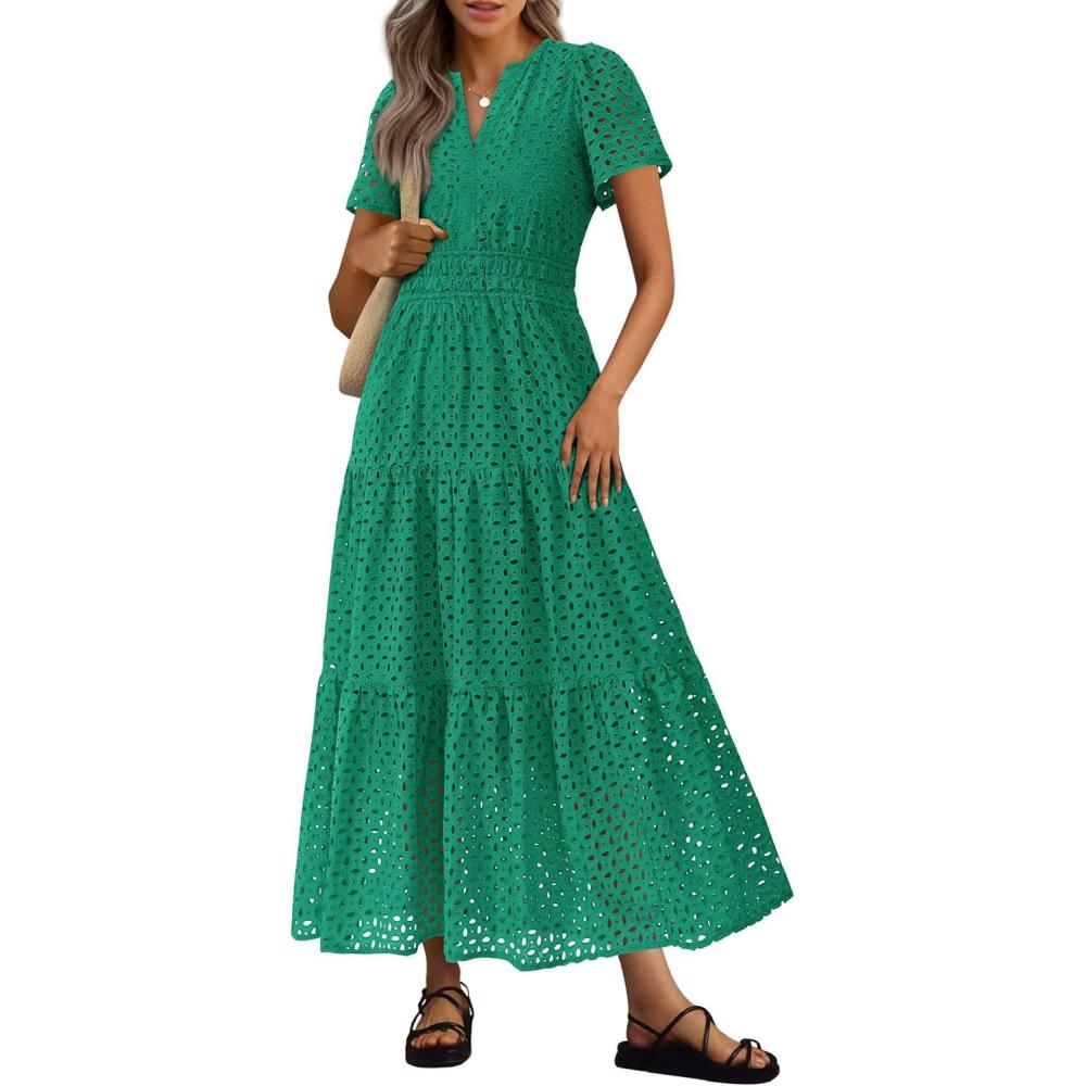 PRETTYGARDEN Womens 2025 Summer Maxi Dress Short Sleeve V Neck Hollow Out Eyelet A Line Long Flowy Beach Vacation Dresses(Green)