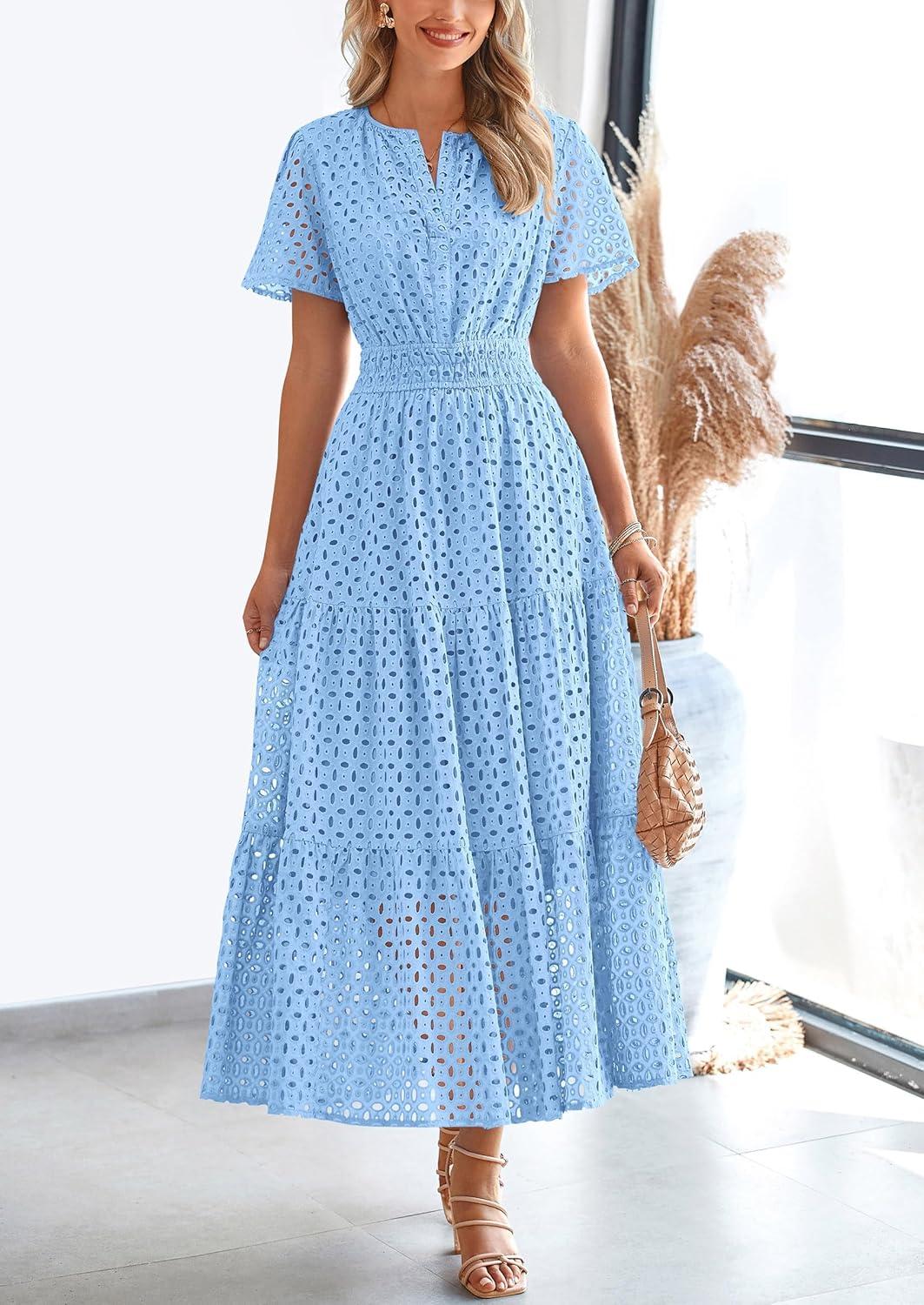 PRETTYGARDEN Womens 2025 Summer Maxi Dress Short Sleeve V Neck Hollow Out Eyelet A Line Long Flowy Beach Vacation Dresses(Light Blue)