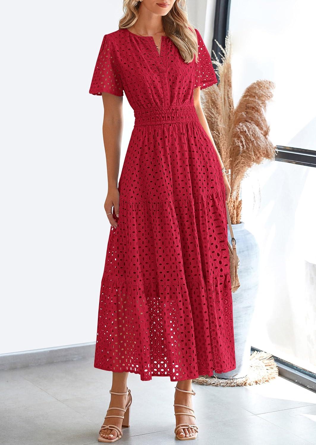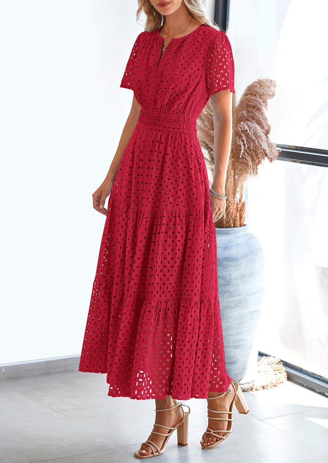 PRETTYGARDEN Womens 2025 Summer Maxi Dress Short Sleeve V Neck Hollow Out Eyelet A Line Long Flowy Beach Vacation Dresses(Red)