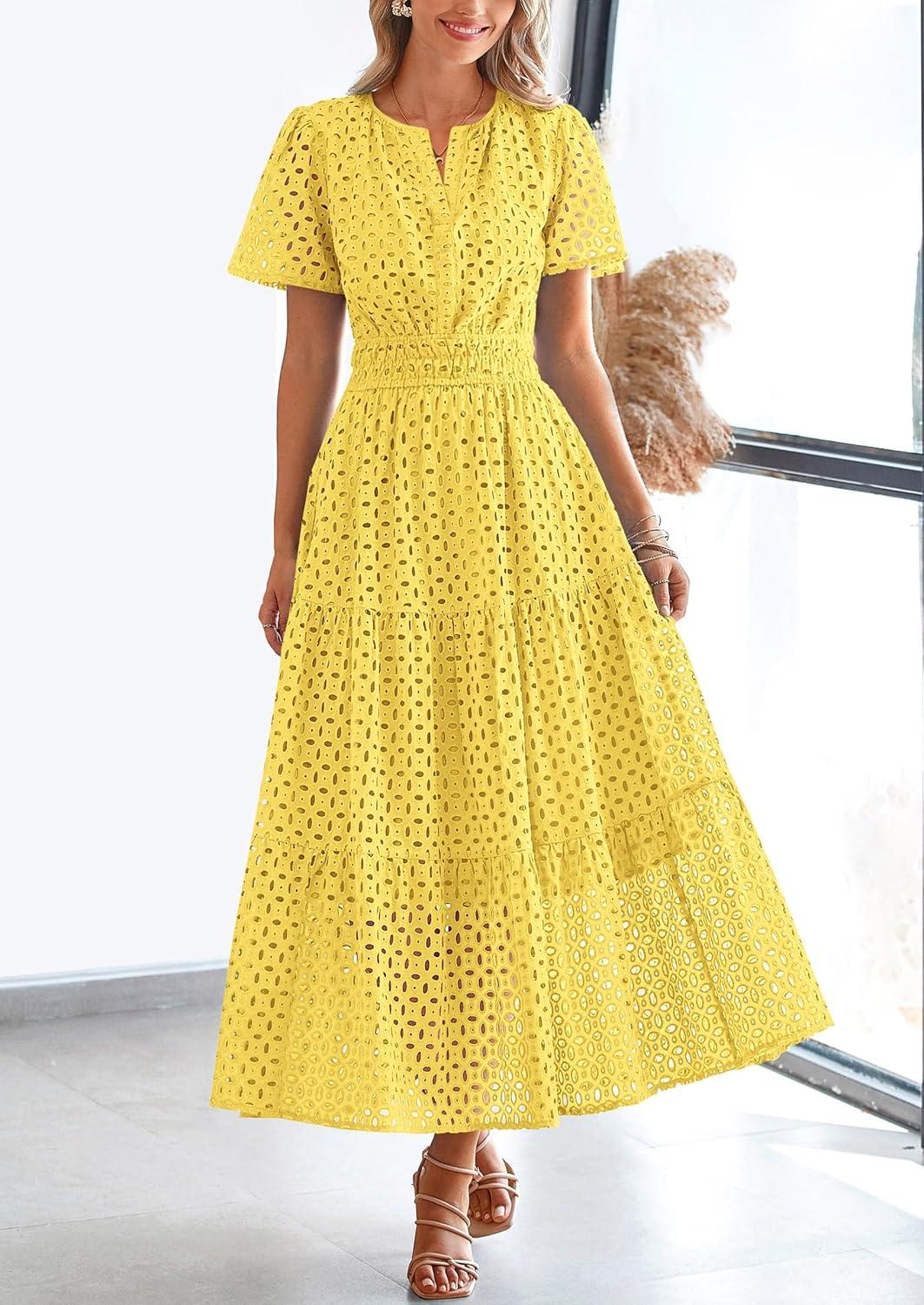 PRETTYGARDEN Womens 2025 Summer Maxi Dress Short Sleeve V Neck Hollow Out Eyelet A Line Long Flowy Beach Vacation Dresses(Yellow)