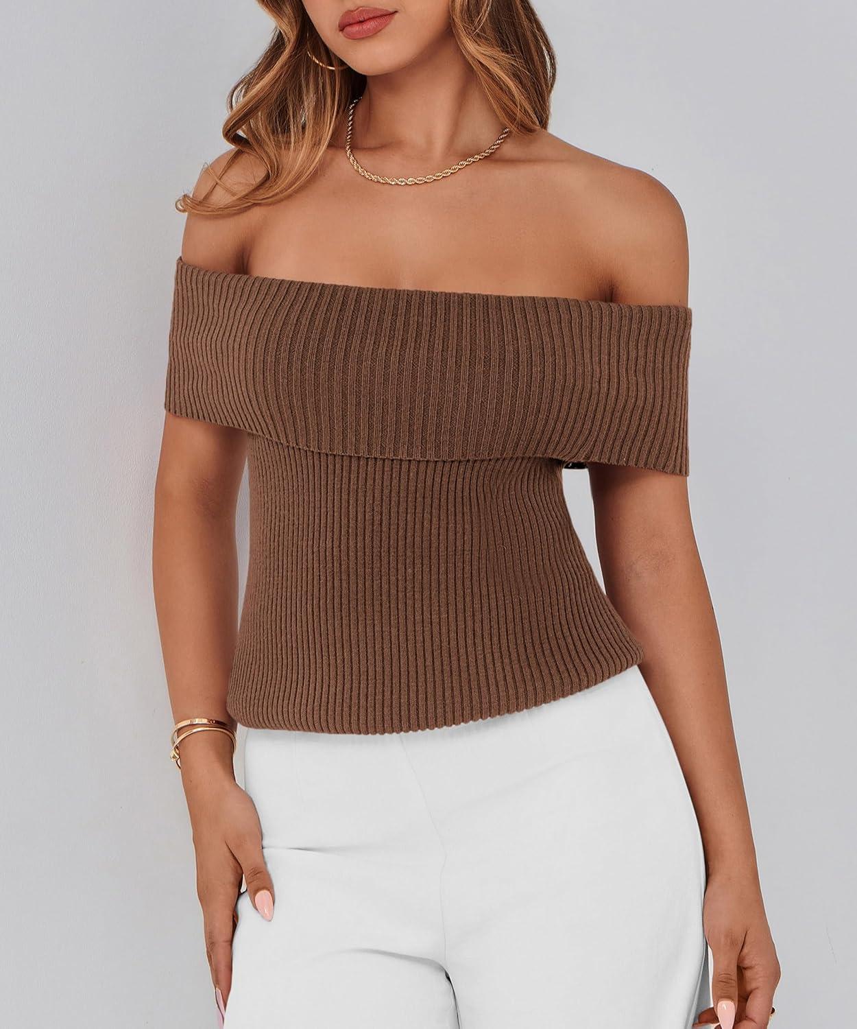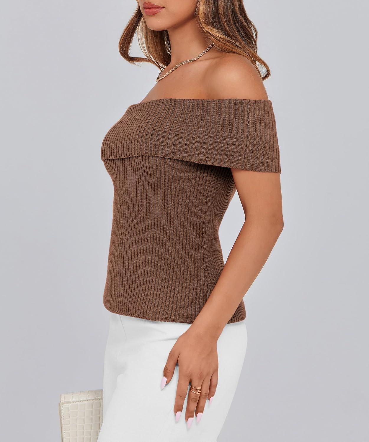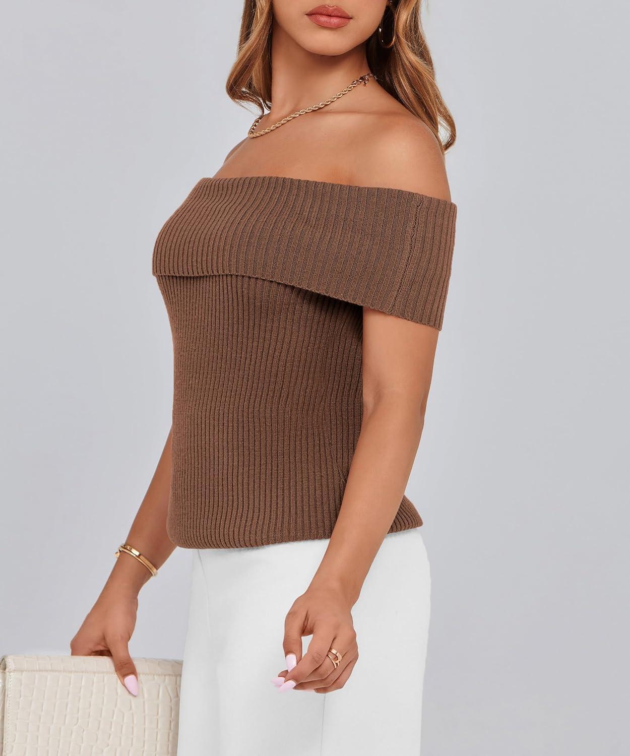 PRETTYGARDEN Women's 2025 Summer Off Shoulder Sweater Tops Ribbed Knit Short Sleeve Trendy Going Out Date Night Blouse(Coffee)