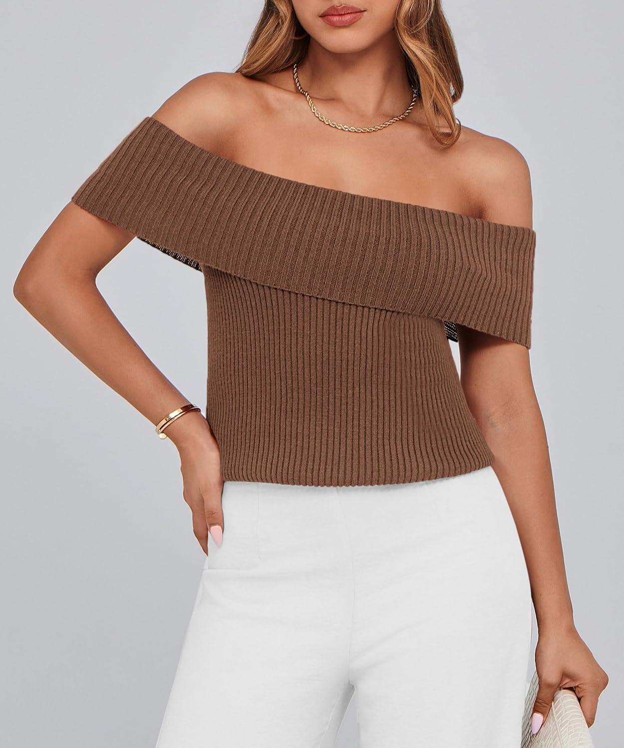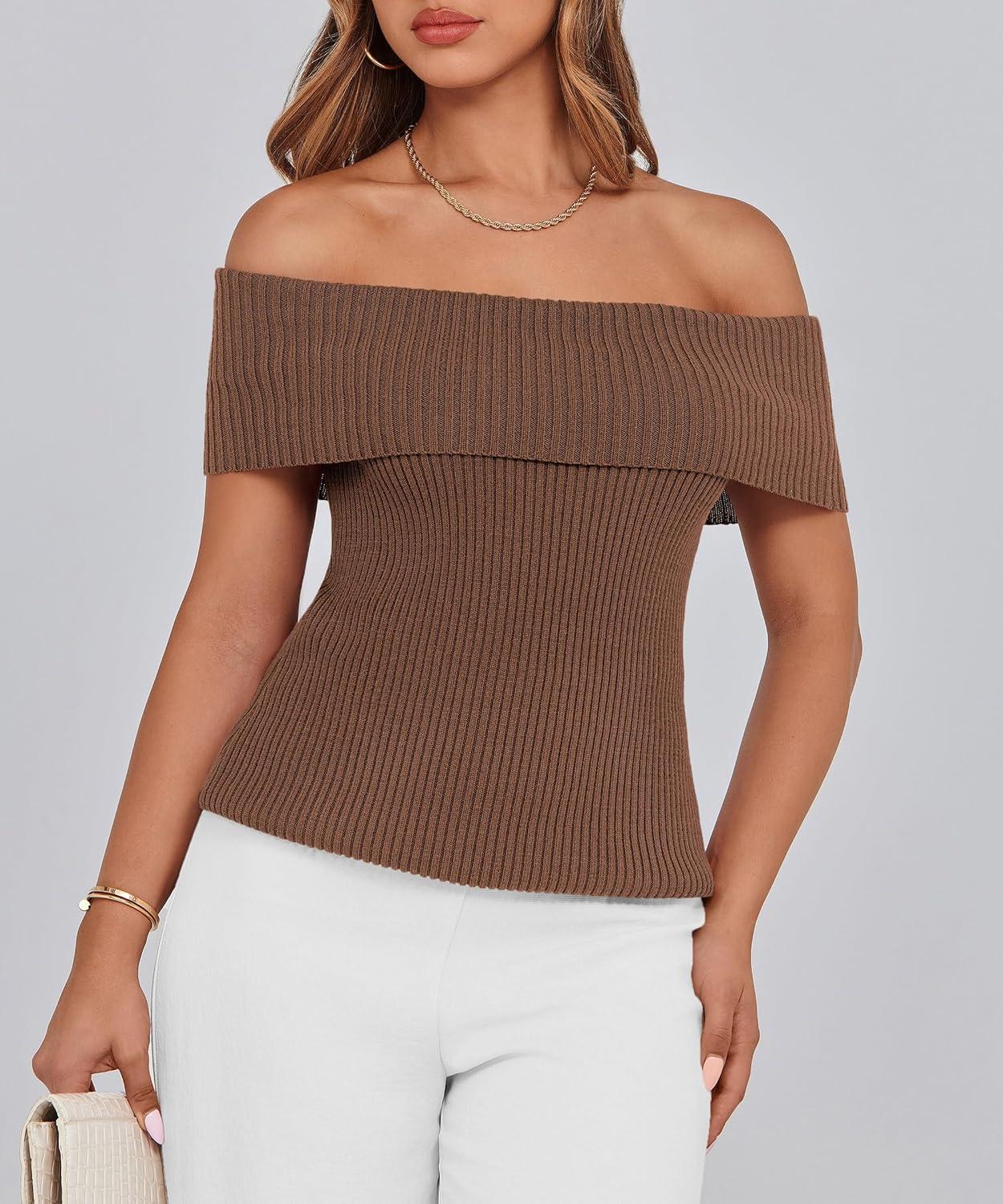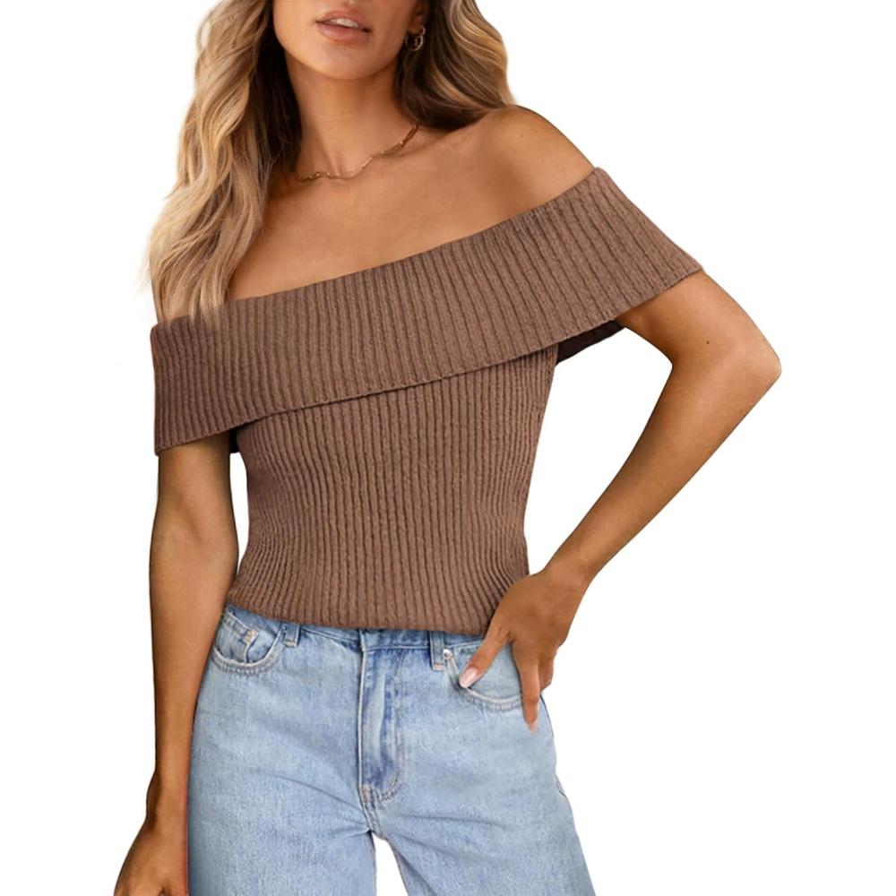 PRETTYGARDEN Women's 2025 Summer Off Shoulder Sweater Tops Ribbed Knit Short Sleeve Trendy Going Out Date Night Blouse(Coffee)
