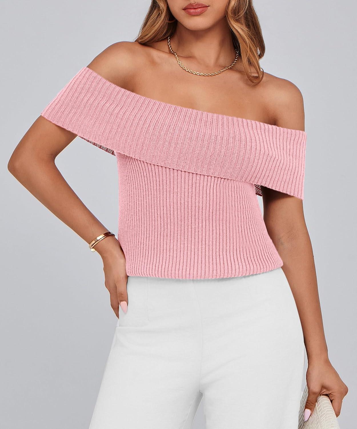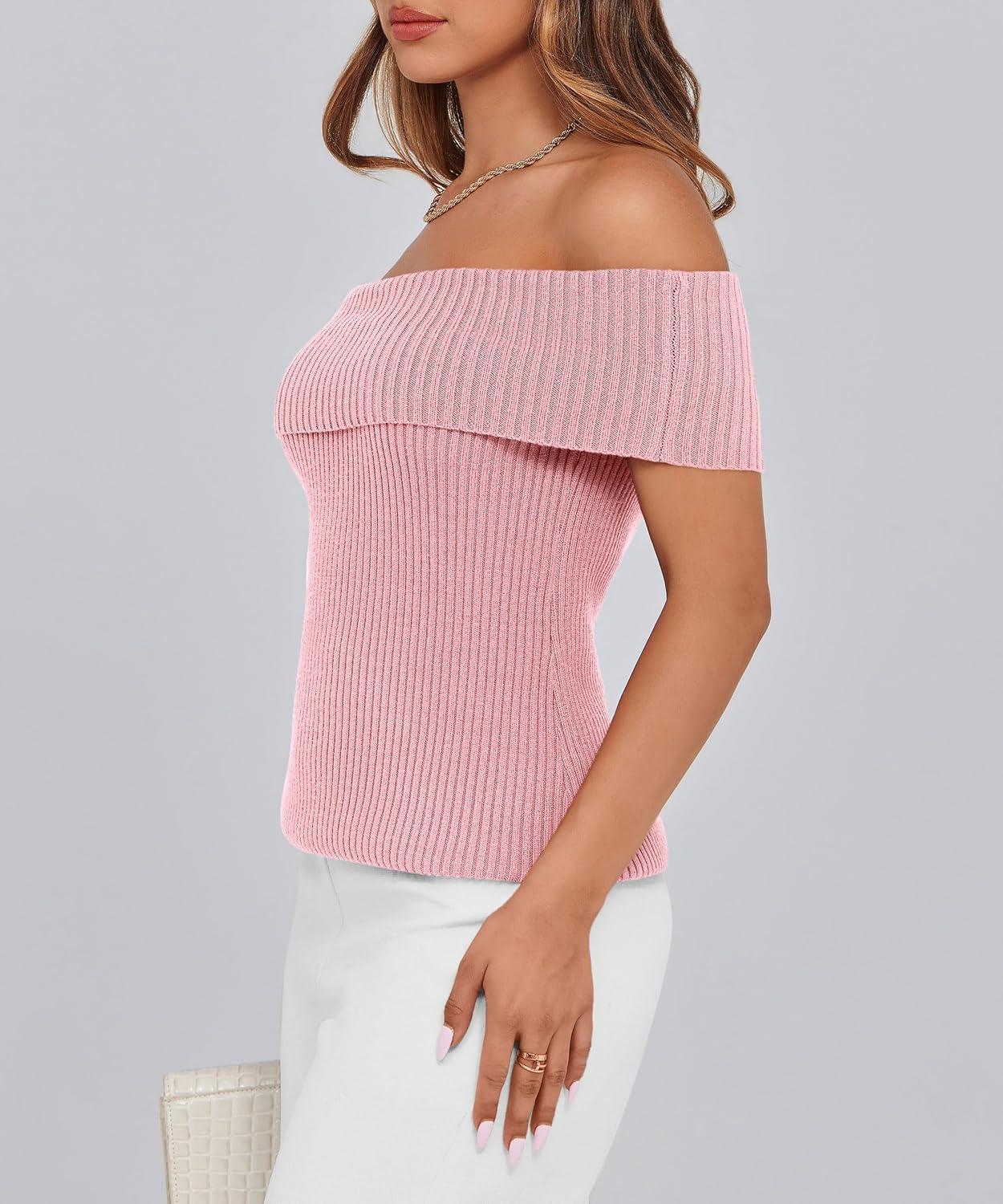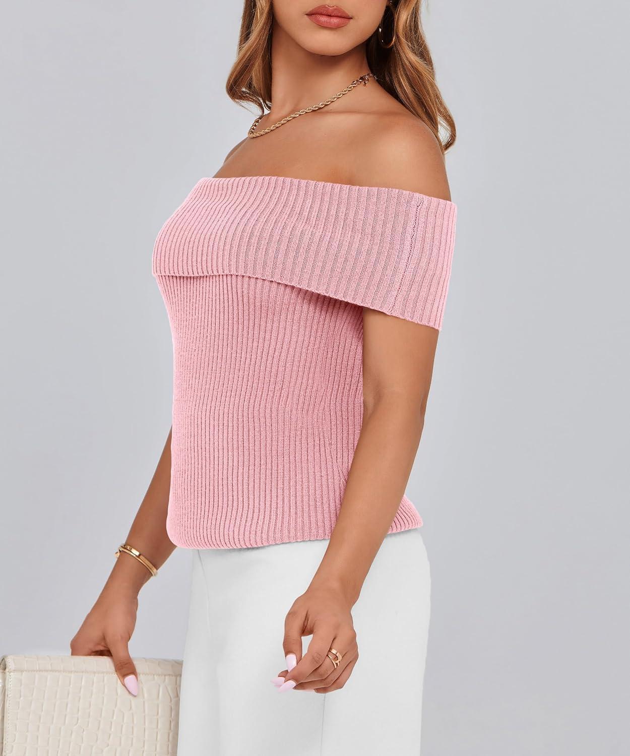 PRETTYGARDEN Women’s 2025 Summer Off Shoulder Sweater Tops Ribbed Knit Short Sleeve Trendy Going Out Date Night Blouse(Pink)