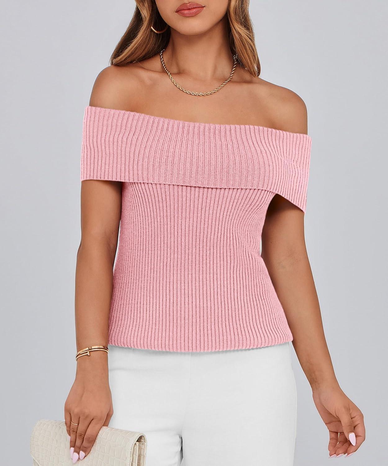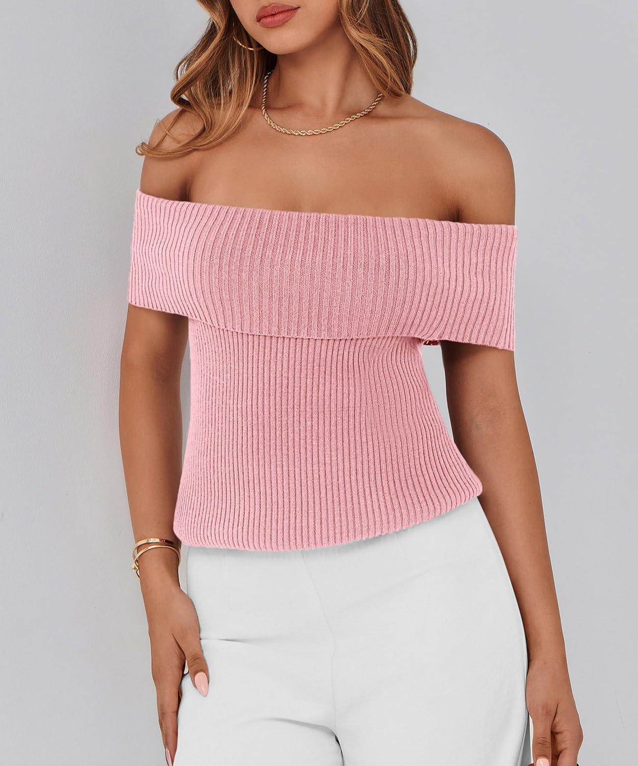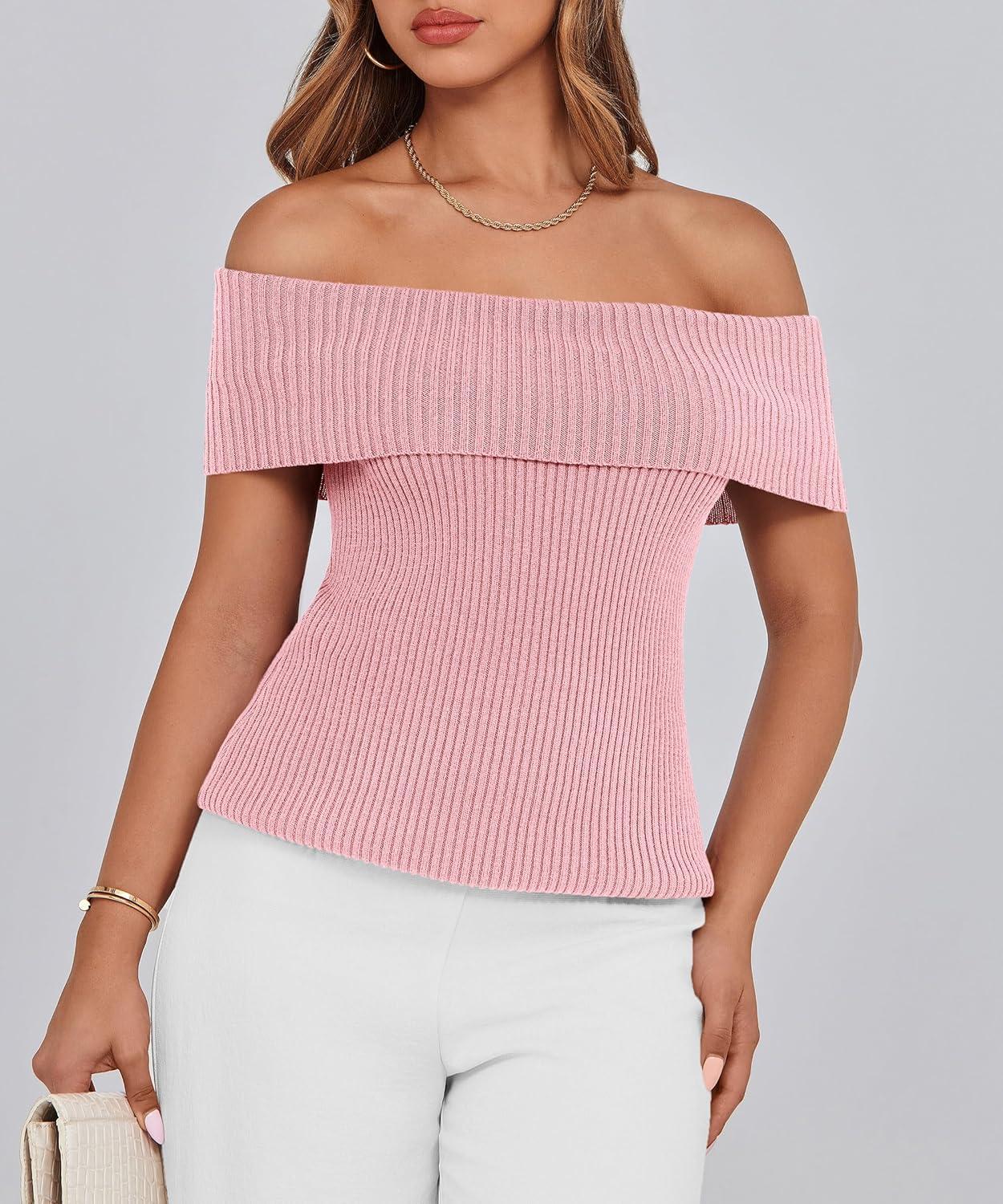 PRETTYGARDEN Women’s 2025 Summer Off Shoulder Sweater Tops Ribbed Knit Short Sleeve Trendy Going Out Date Night Blouse(Pink)