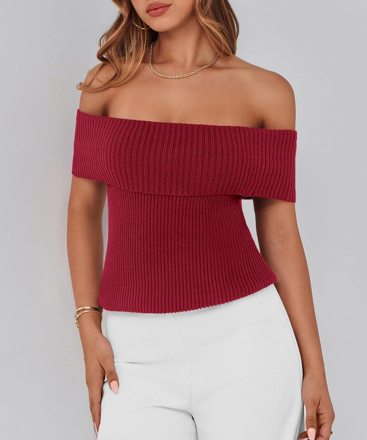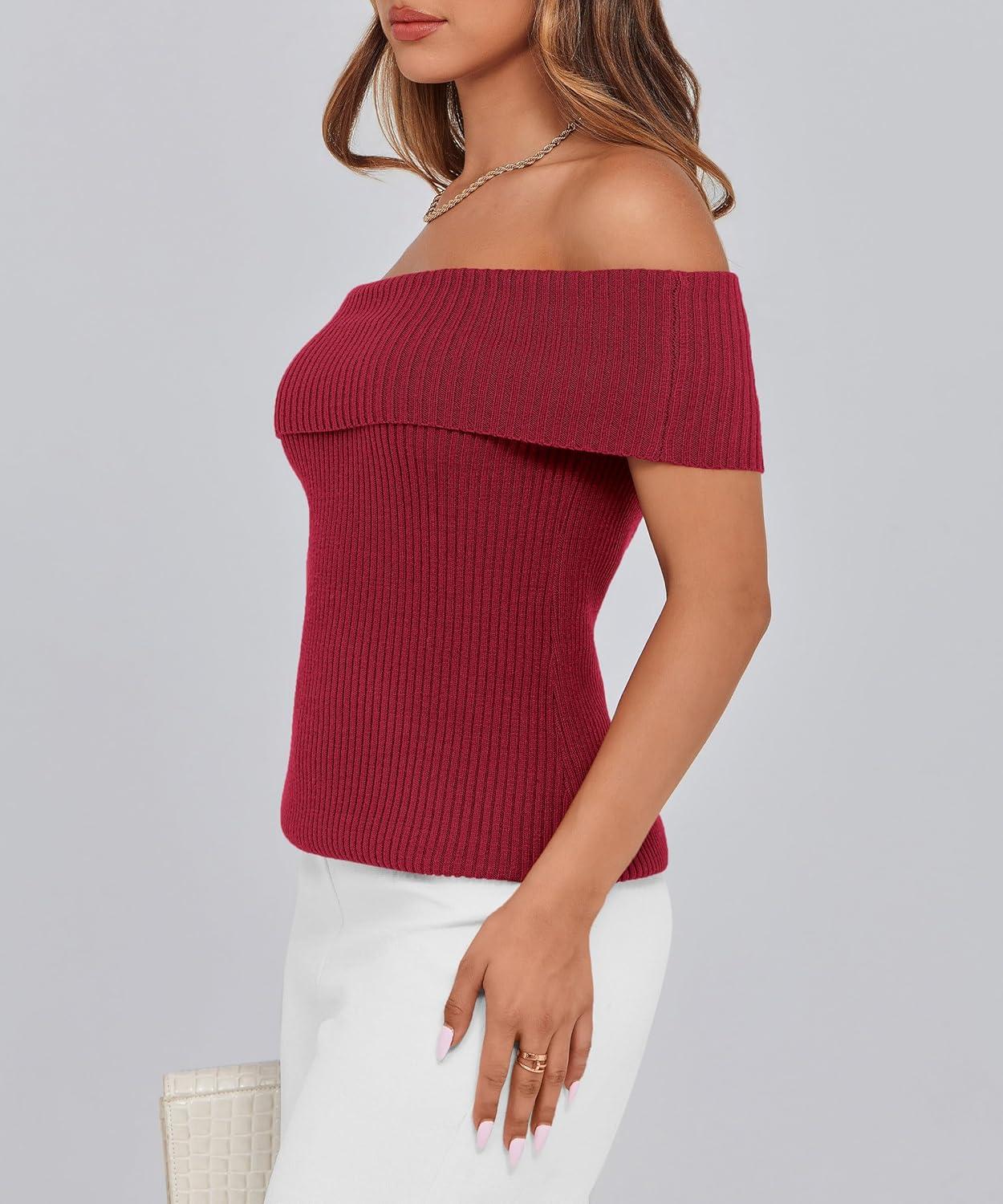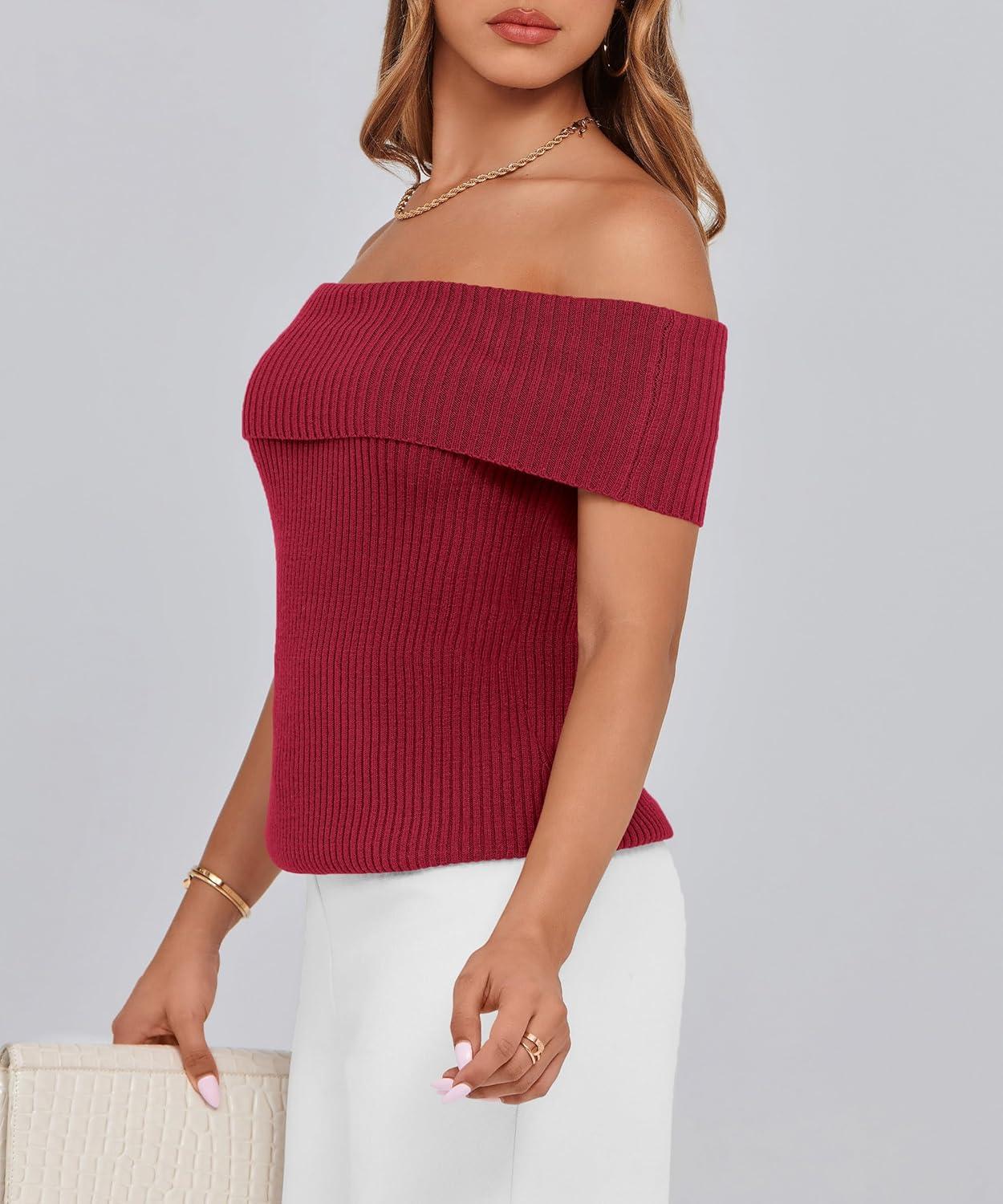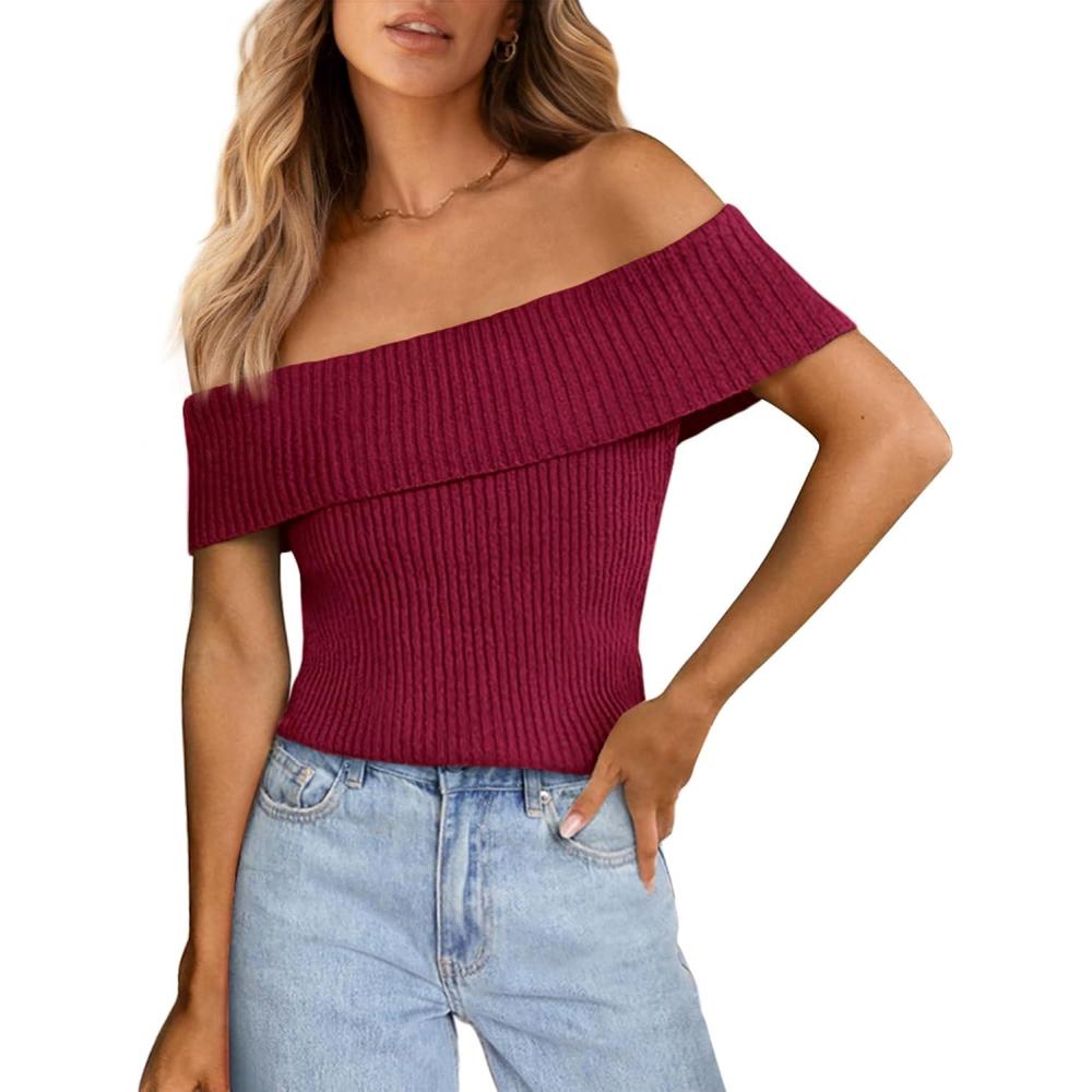 PRETTYGARDEN Women's 2025 Summer Off Shoulder Sweater Tops Ribbed Knit Short Sleeve Trendy Going Out Date Night Blouse(Wine Red)