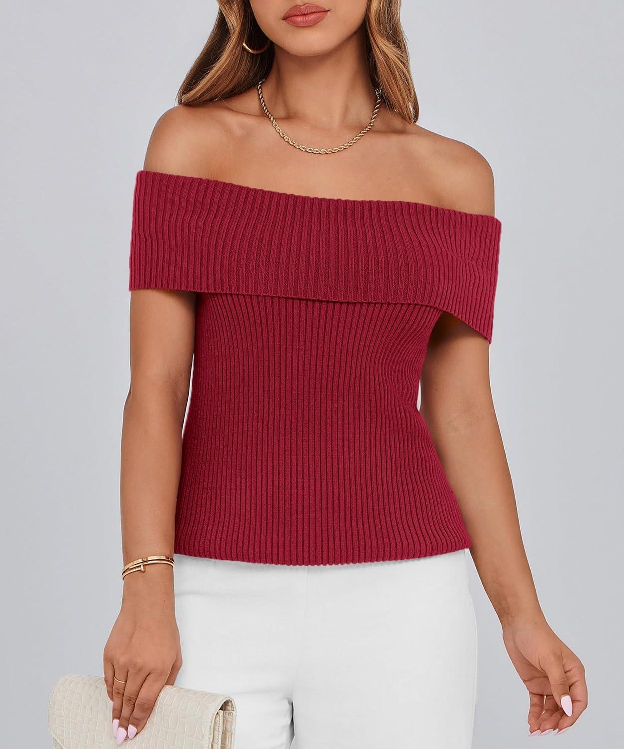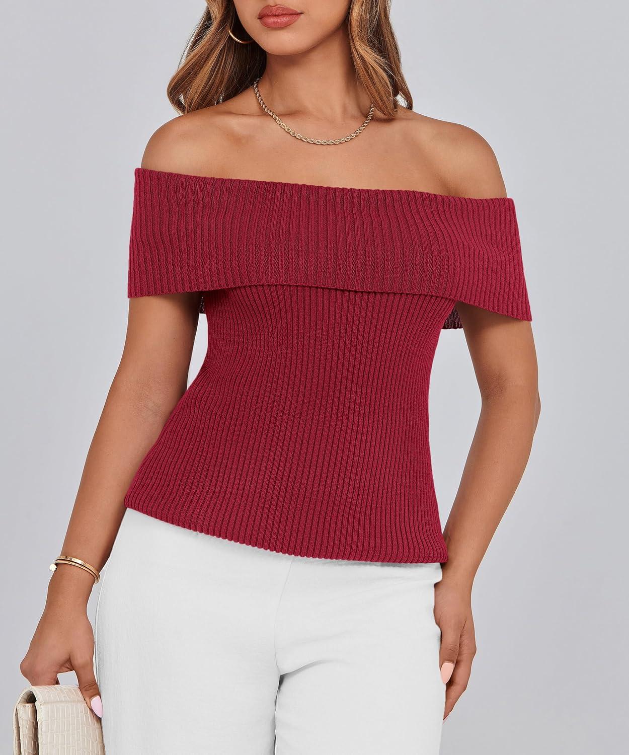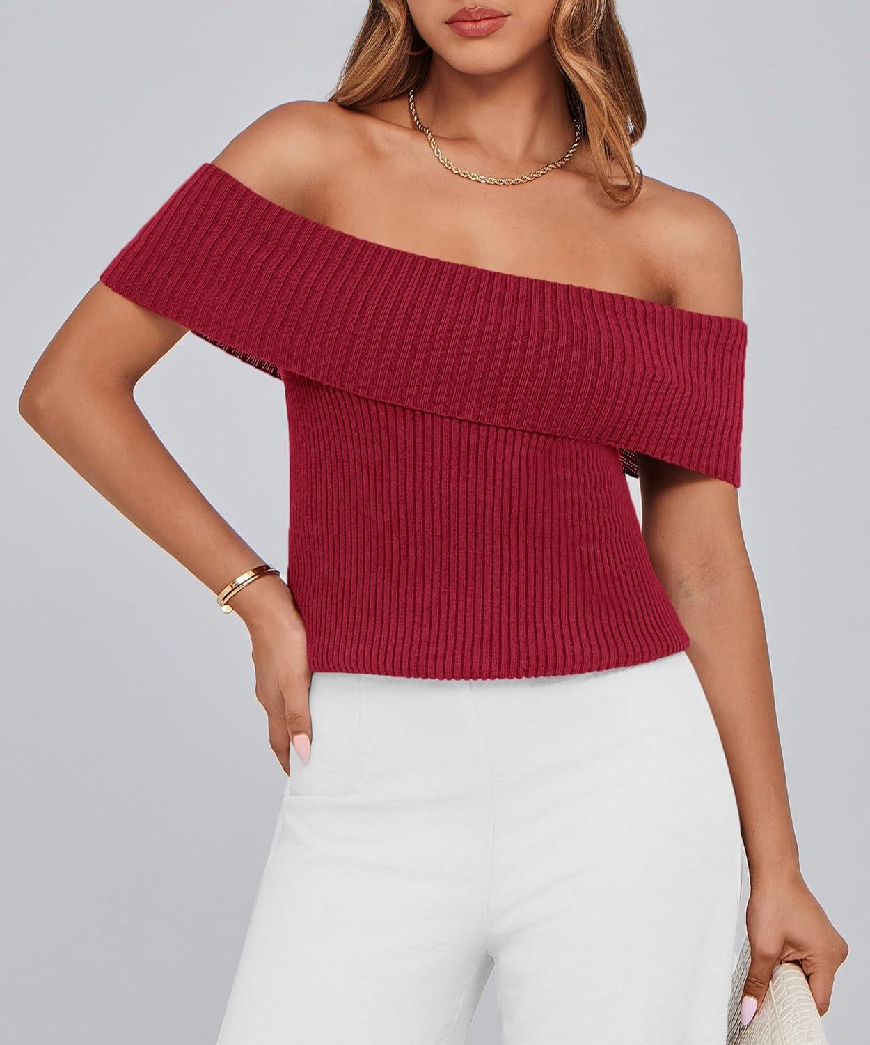 PRETTYGARDEN Women's 2025 Summer Off Shoulder Sweater Tops Ribbed Knit Short Sleeve Trendy Going Out Date Night Blouse(Wine Red)