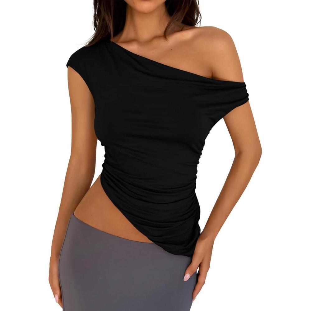 PRETTYGARDEN Womens 2025 Summer Off The Shoulder Crop Tops Sleeveless One Shoulder Ruched Asymmetrical Y2K Going Out Tank Top(Black)