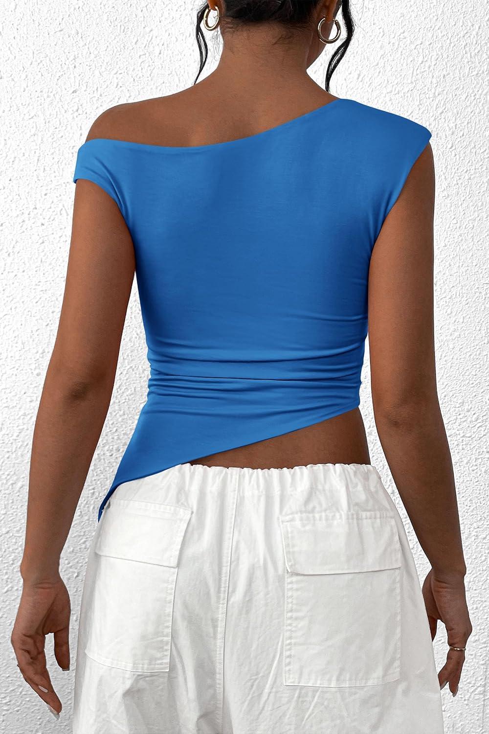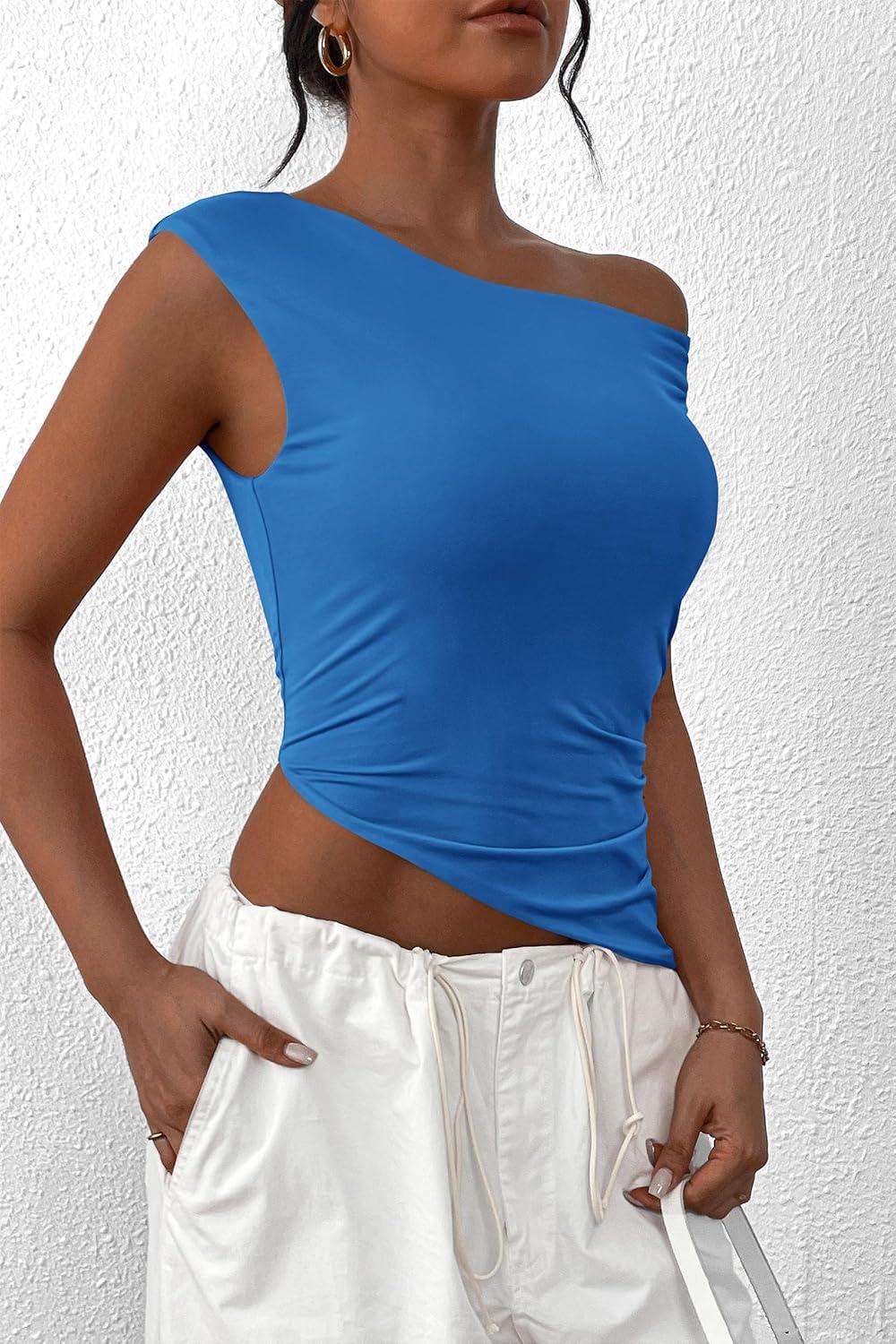 PRETTYGARDEN Womens 2025 Summer Off The Shoulder Crop Tops Sleeveless One Shoulder Ruched Asymmetrical Y2K Going Out Tank Top(Blue)