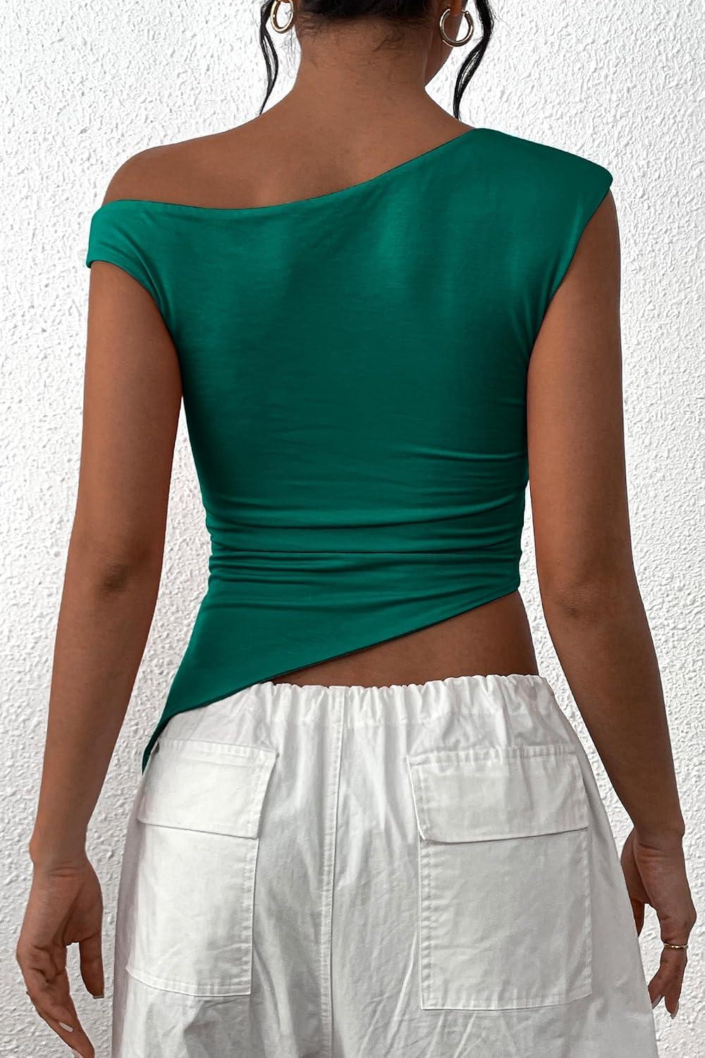 PRETTYGARDEN Womens 2025 Summer Off The Shoulder Crop Tops Sleeveless One Shoulder Ruched Asymmetrical Y2K Going Out Tank Top(Dark Green)