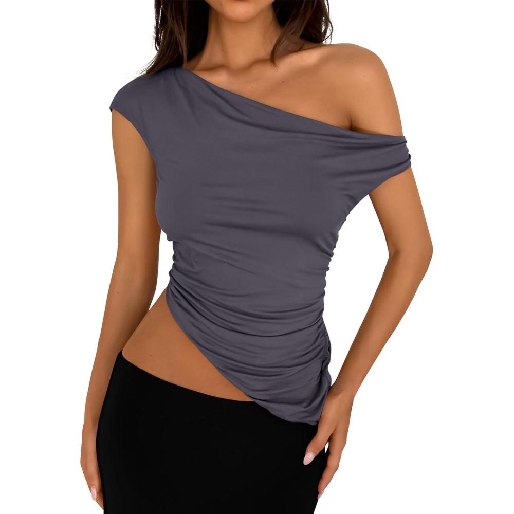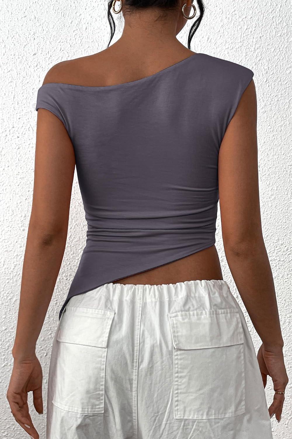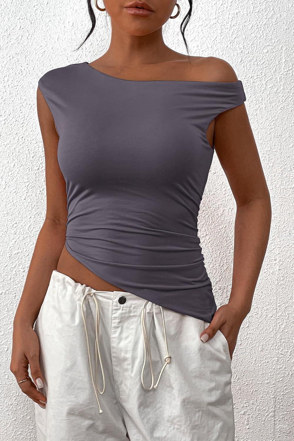 PRETTYGARDEN Womens 2025 Summer Off The Shoulder Crop Tops Sleeveless One Shoulder Ruched Asymmetrical Y2K Going Out Tank Top(Dark Grey)
