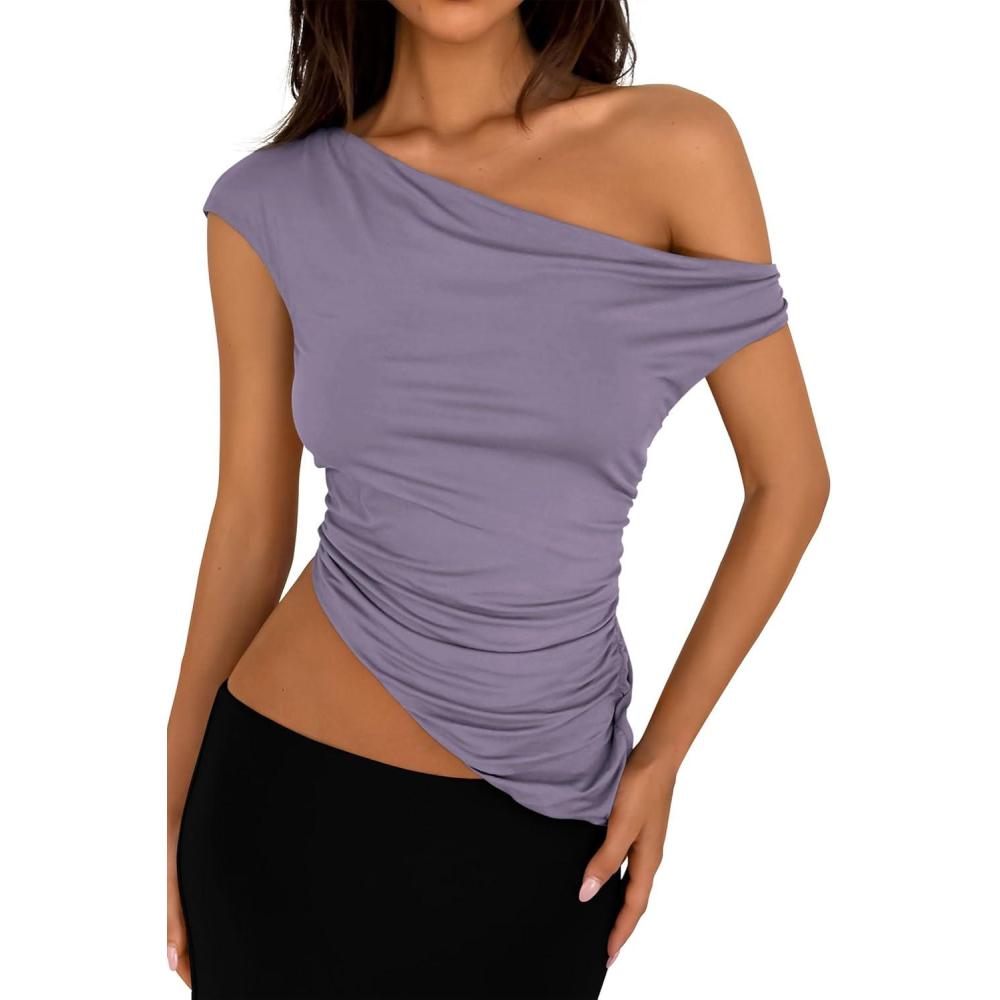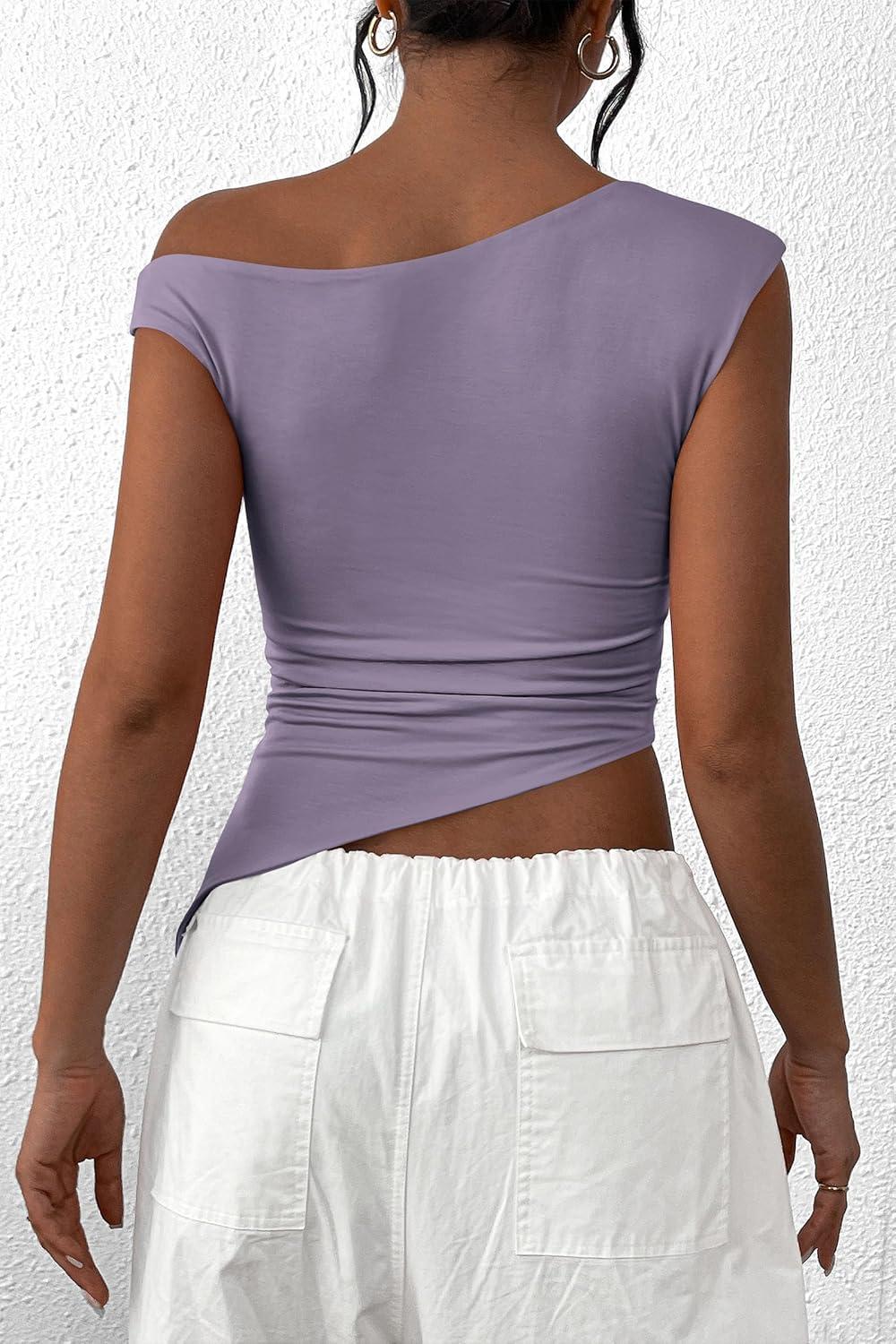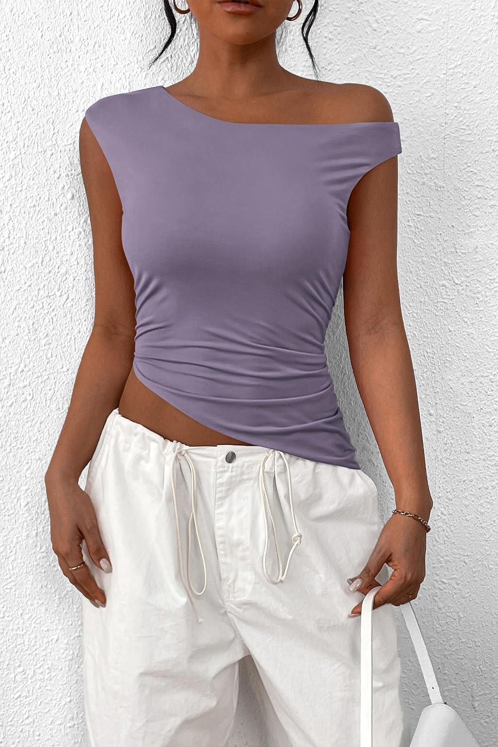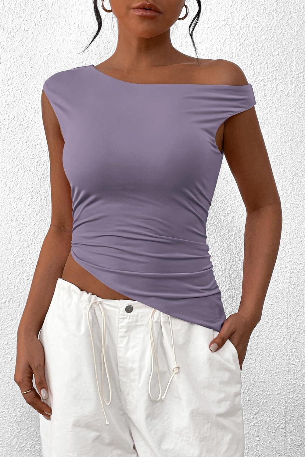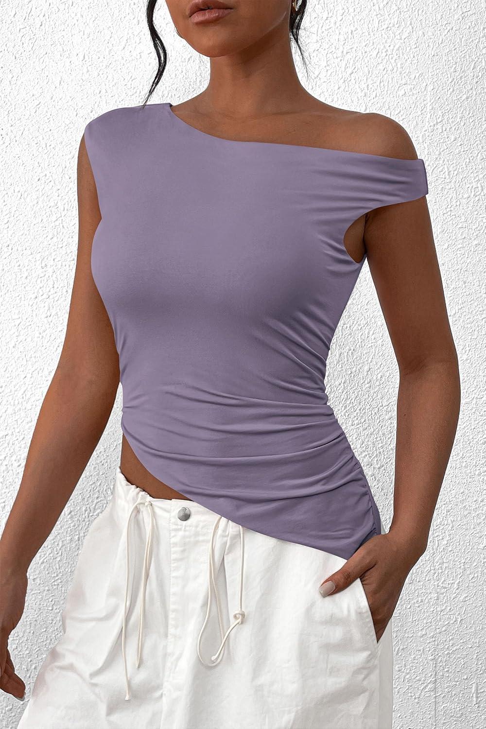 PRETTYGARDEN Womens 2025 Summer Off The Shoulder Crop Tops Sleeveless One Shoulder Ruched Asymmetrical Y2K Going Out Tank Top(Dusty Violet)