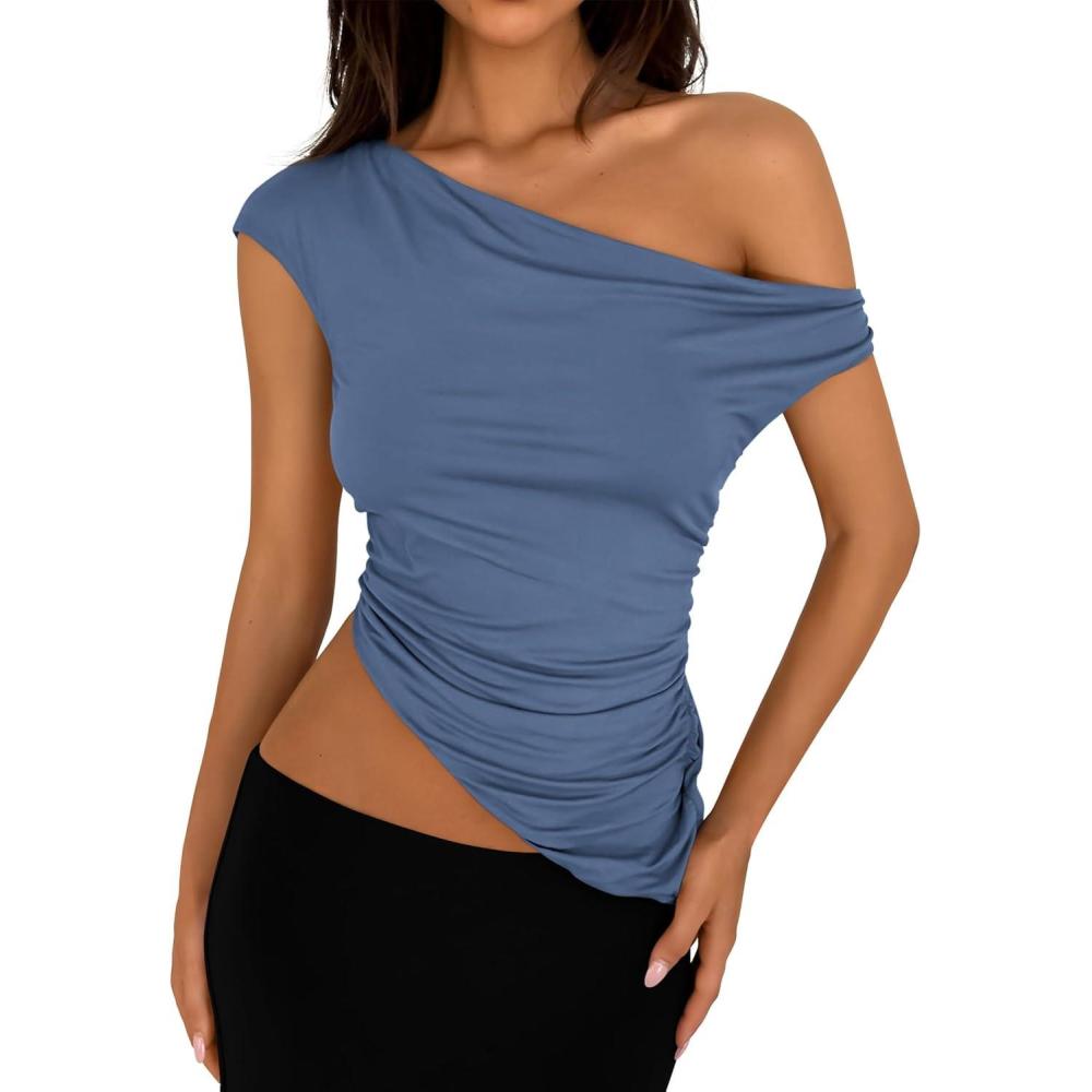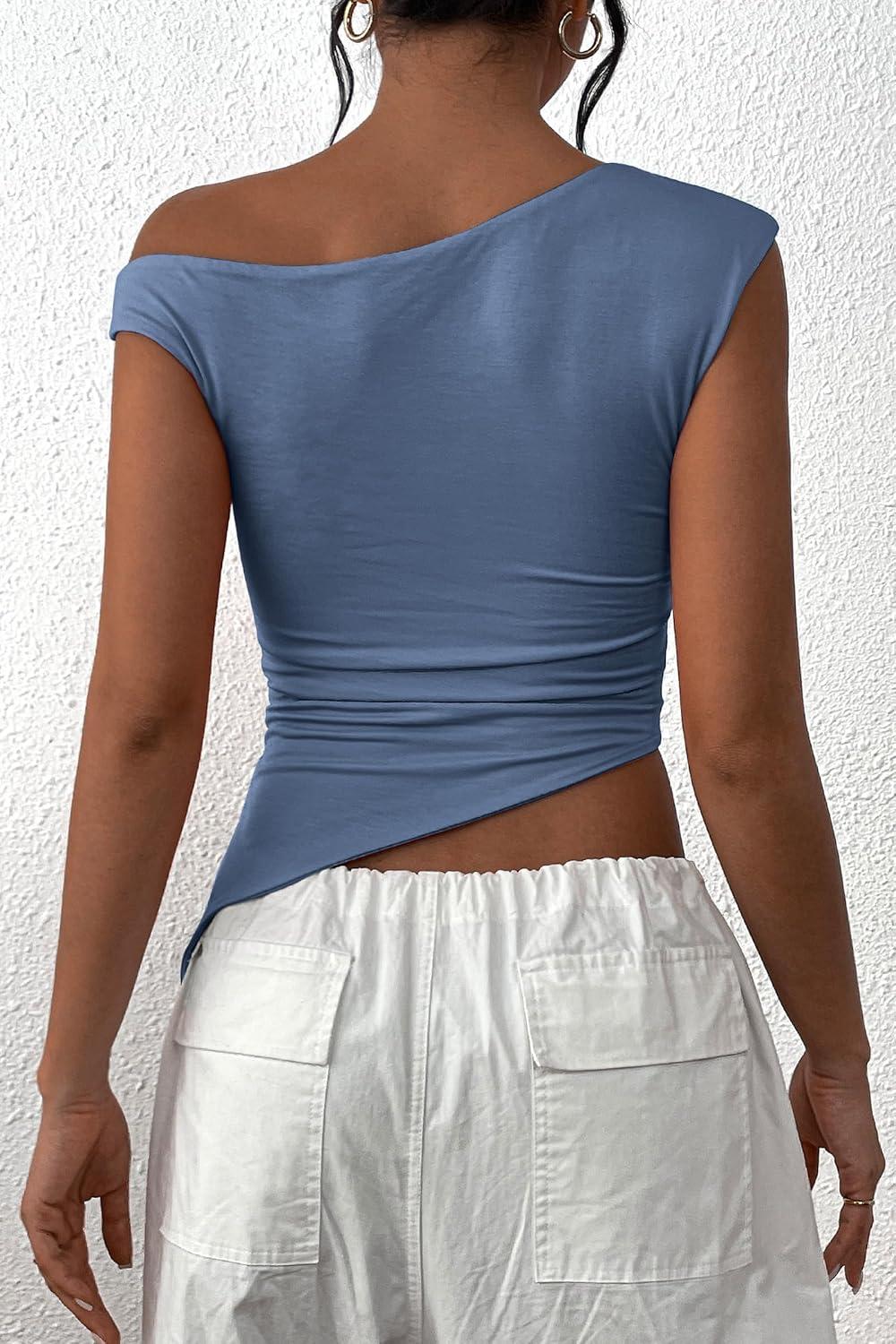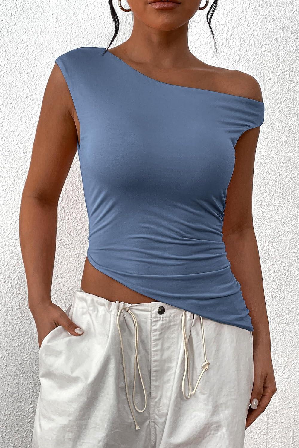 PRETTYGARDEN Womens 2025 Summer Off The Shoulder Crop Tops Sleeveless One Shoulder Ruched Asymmetrical Y2K Going Out Tank Top(Grey Blue)