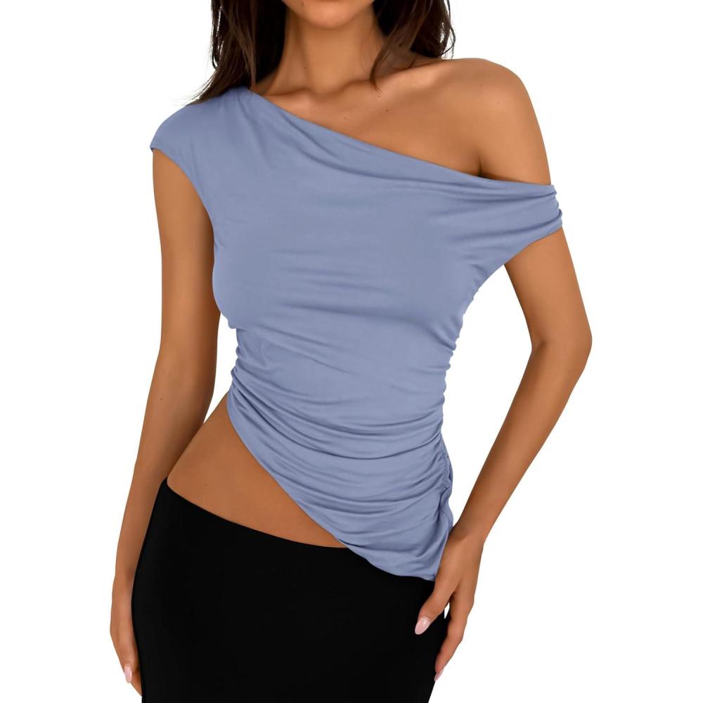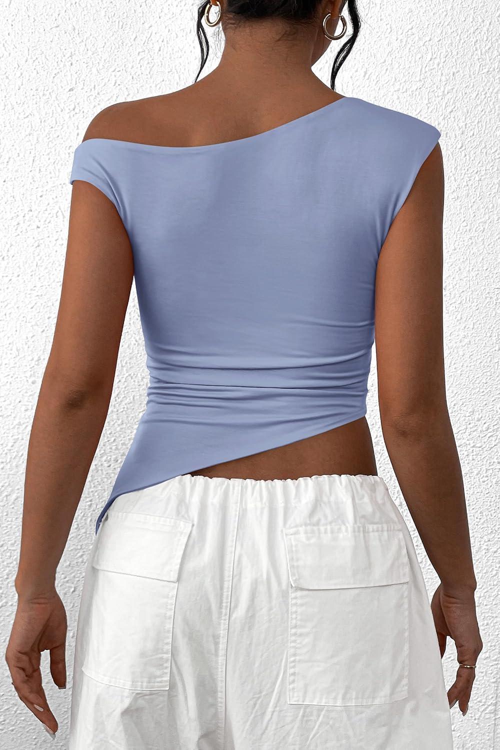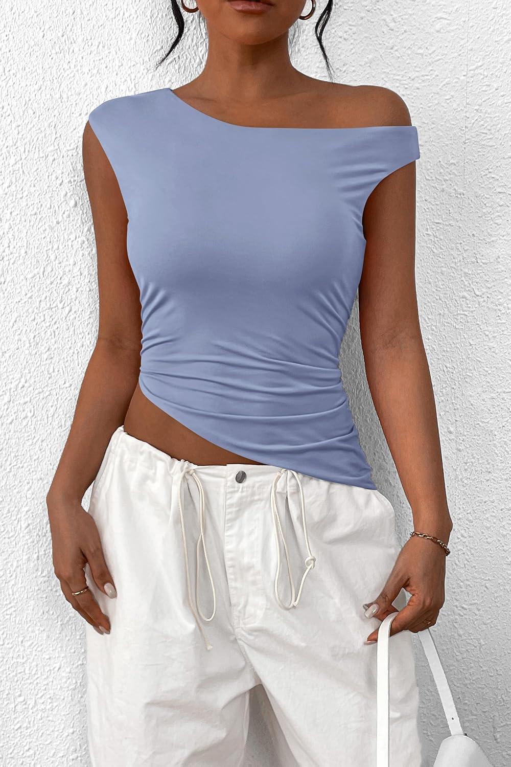 PRETTYGARDEN Womens 2025 Summer Off The Shoulder Crop Tops Sleeveless One Shoulder Ruched Asymmetrical Y2K Going Out Tank Top(Light Blue)