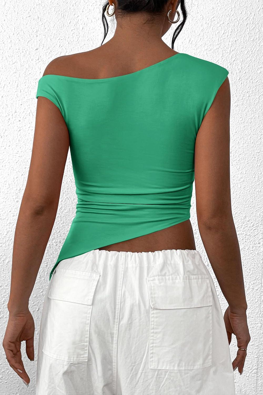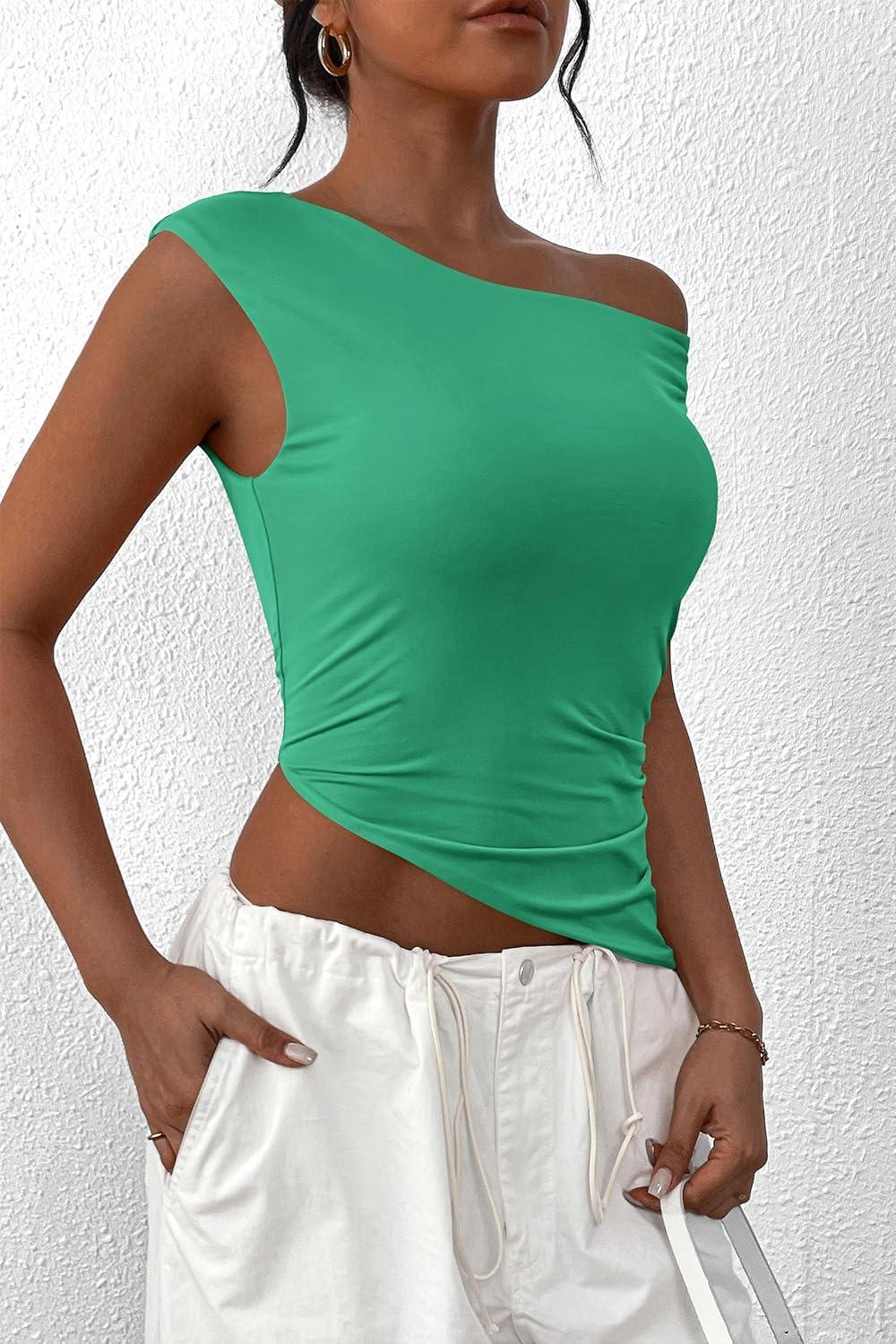PRETTYGARDEN Womens 2025 Summer Off The Shoulder Crop Tops Sleeveless One Shoulder Ruched Asymmetrical Y2K Going Out Tank Top(Light Green)
