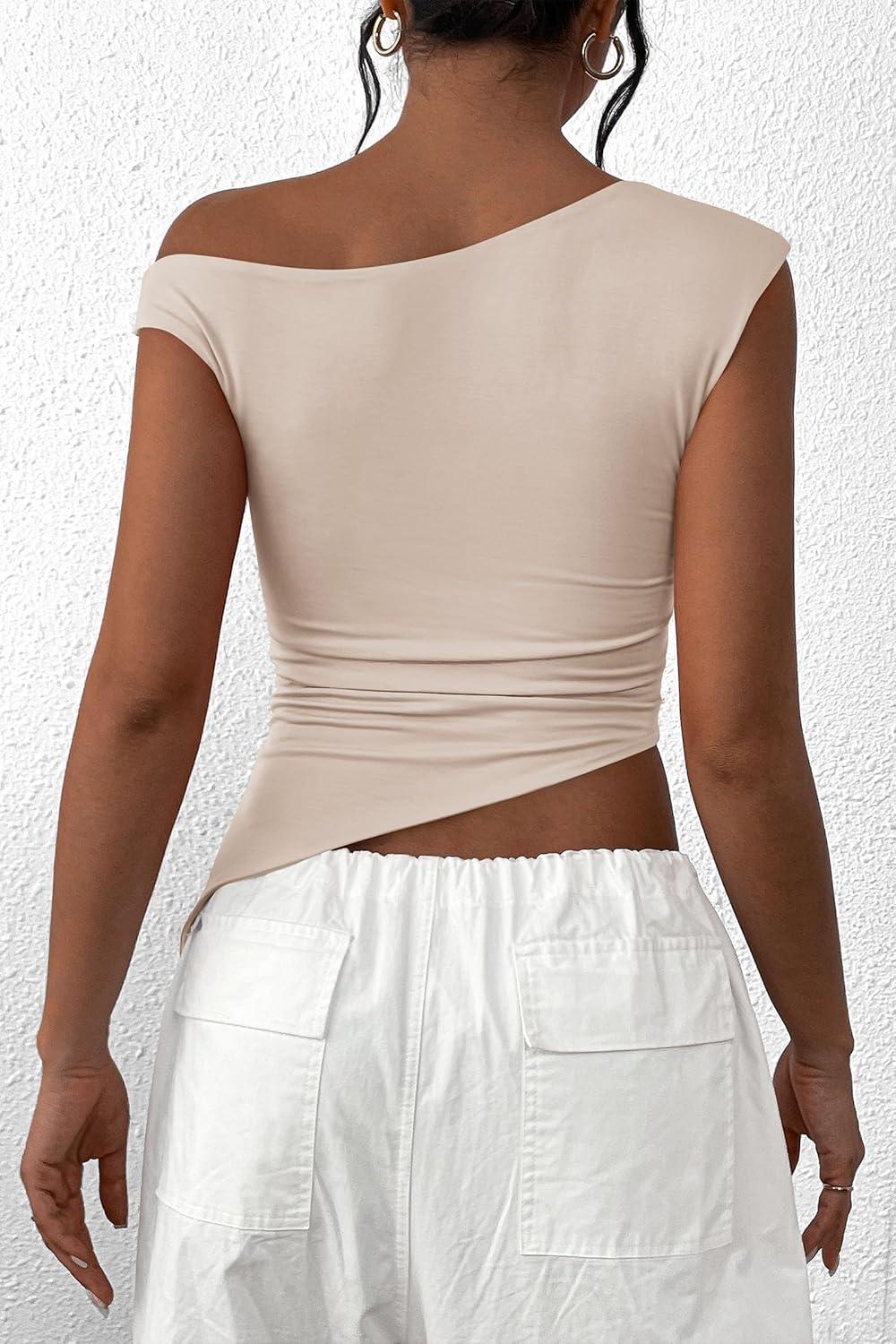 PRETTYGARDEN Womens 2025 Summer Off The Shoulder Crop Tops Sleeveless One Shoulder Ruched Asymmetrical Y2K Going Out Tank Top(Light Khaki)