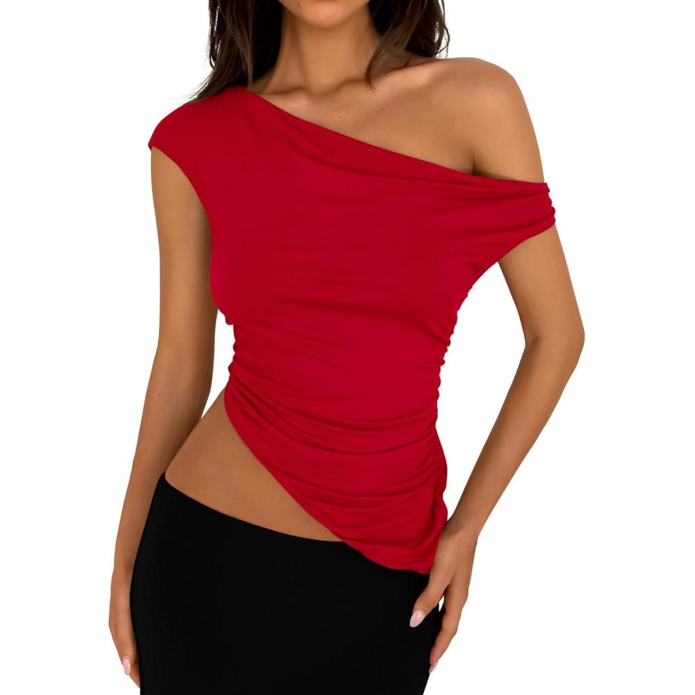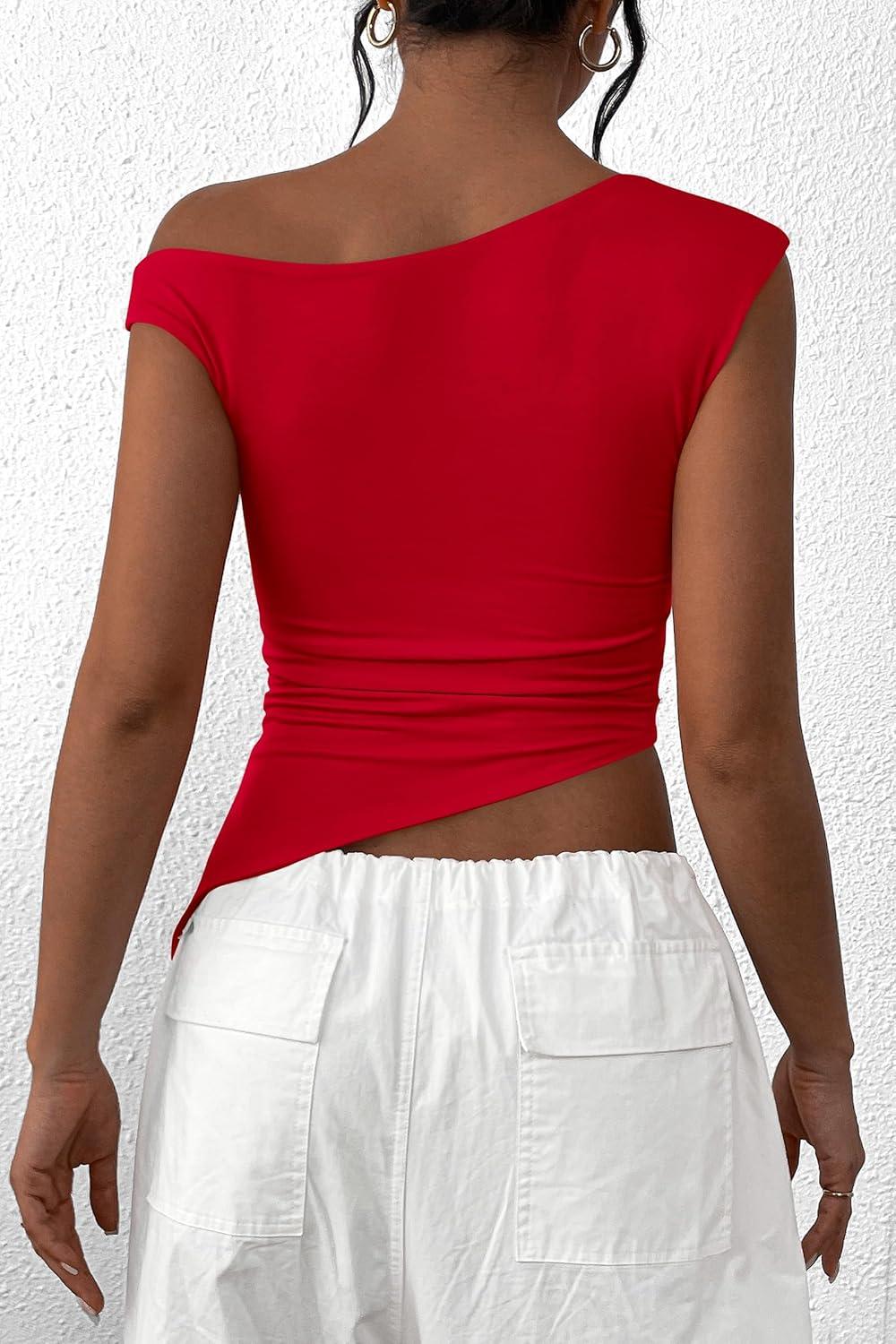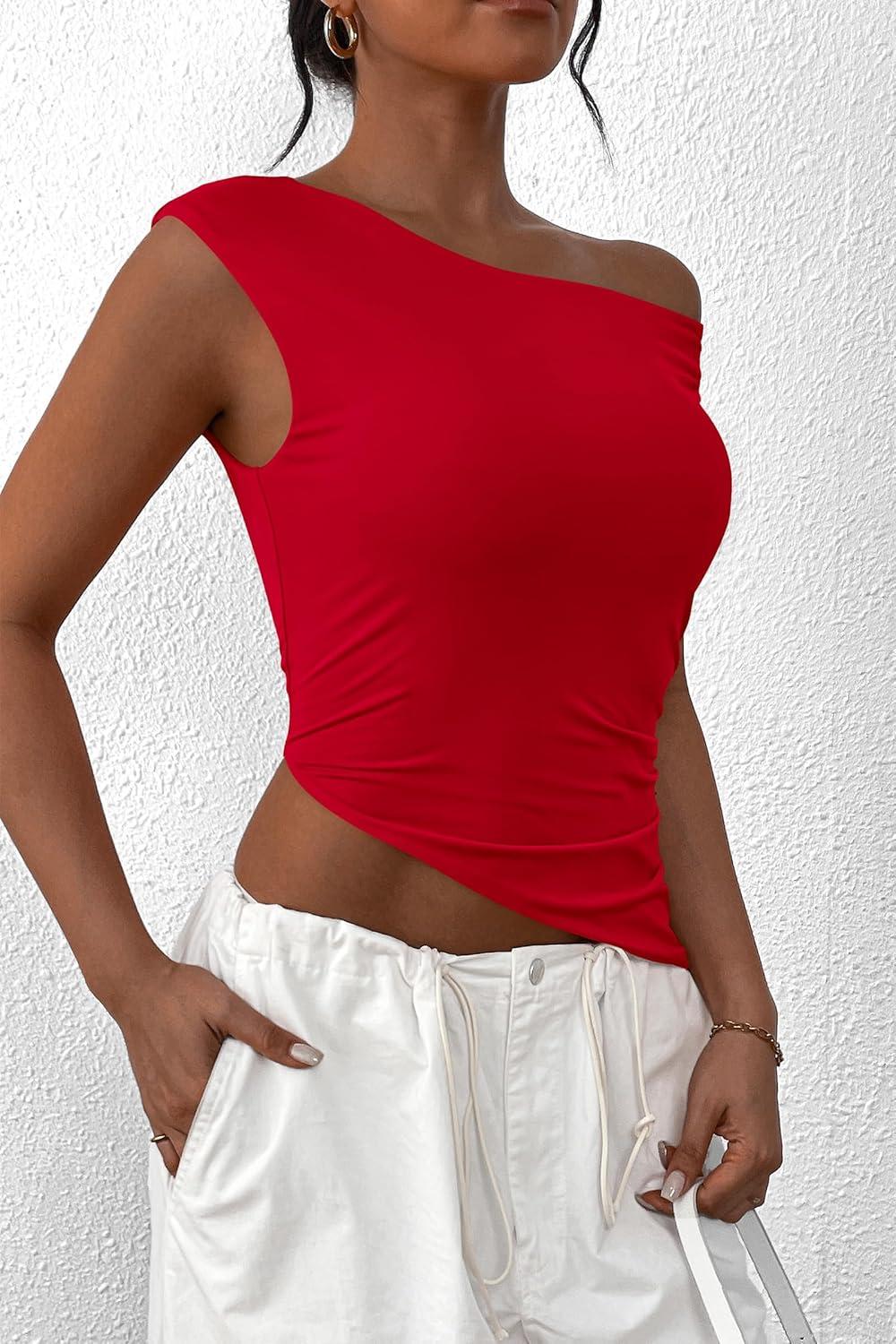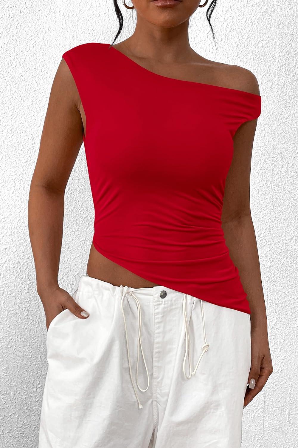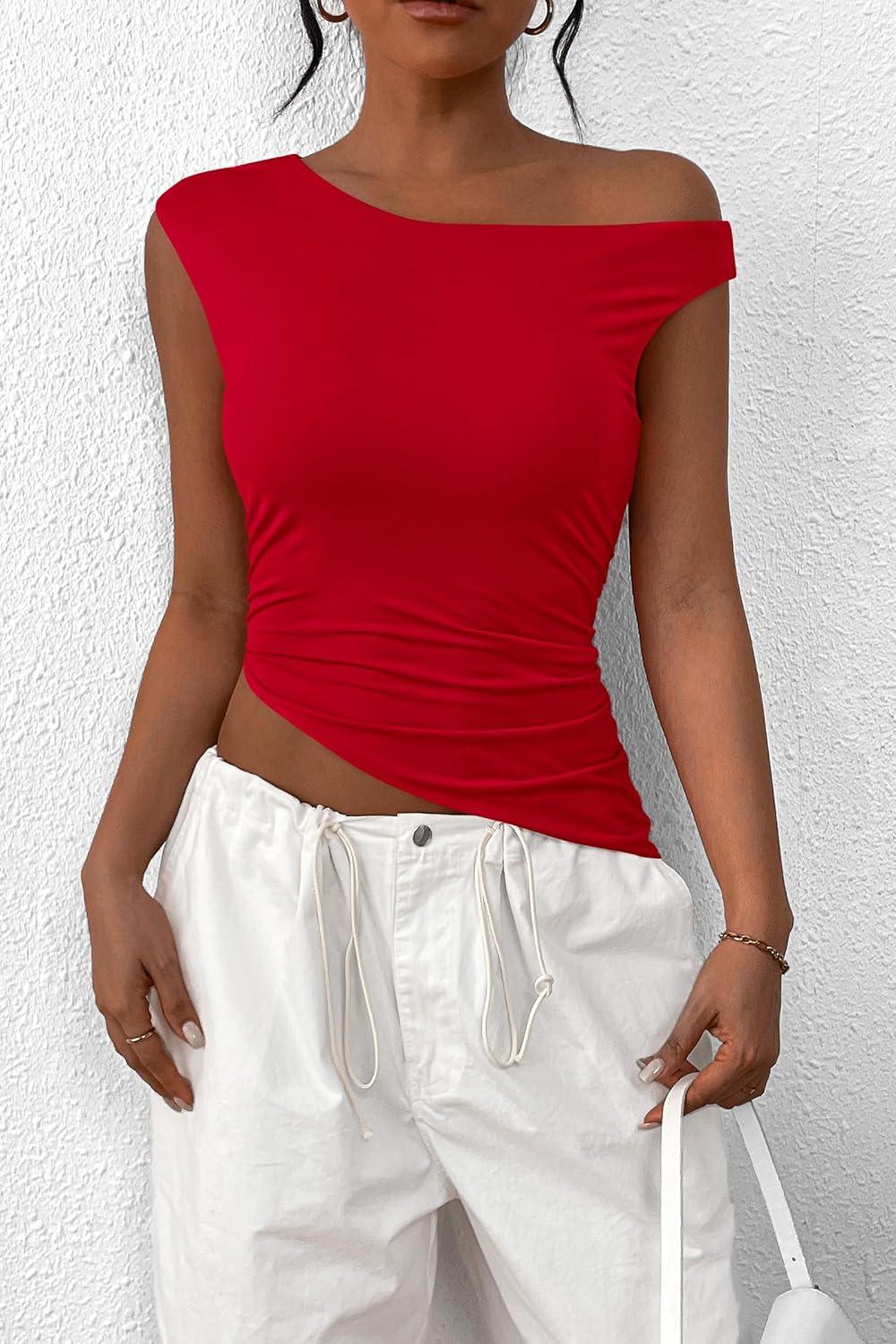 PRETTYGARDEN Womens 2025 Summer Off The Shoulder Crop Tops Sleeveless One Shoulder Ruched Asymmetrical Y2K Going Out Tank Top(Red)