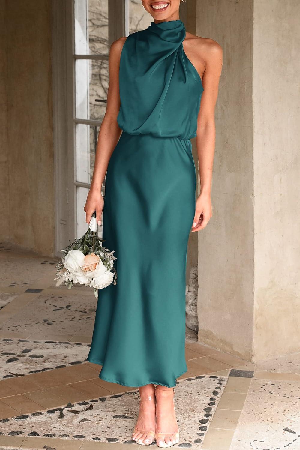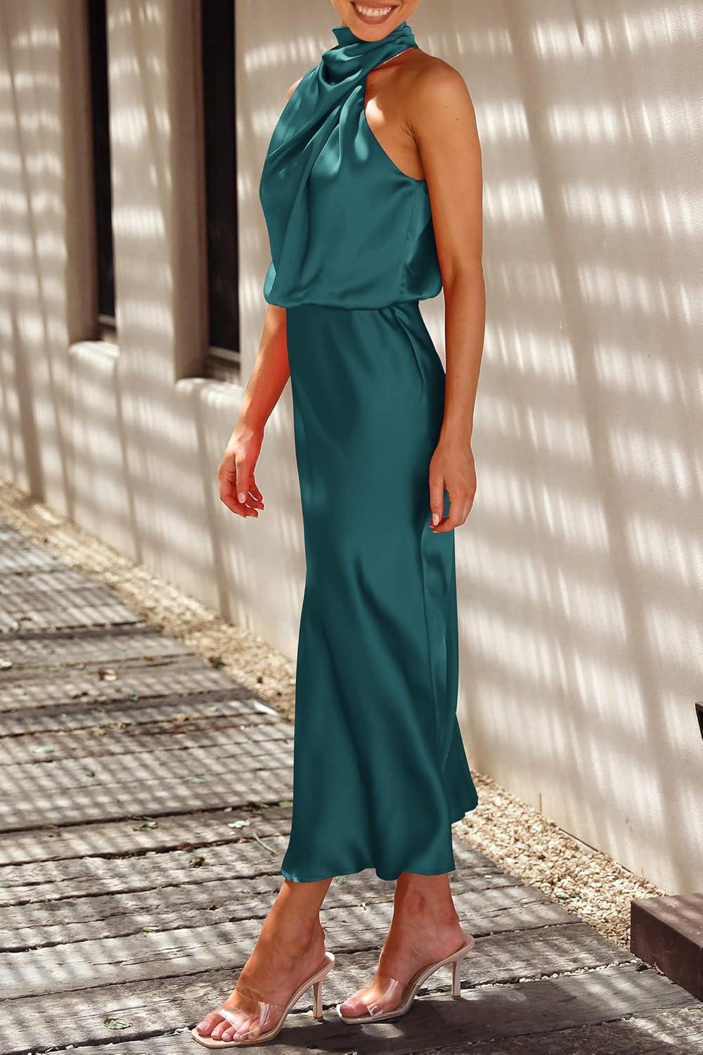 PRETTYGARDEN Women’s 2025 Summer Satin Dress Elegant Sleeveless Mock Neck Cocktail Party Maxi Dresses(Dark Green)