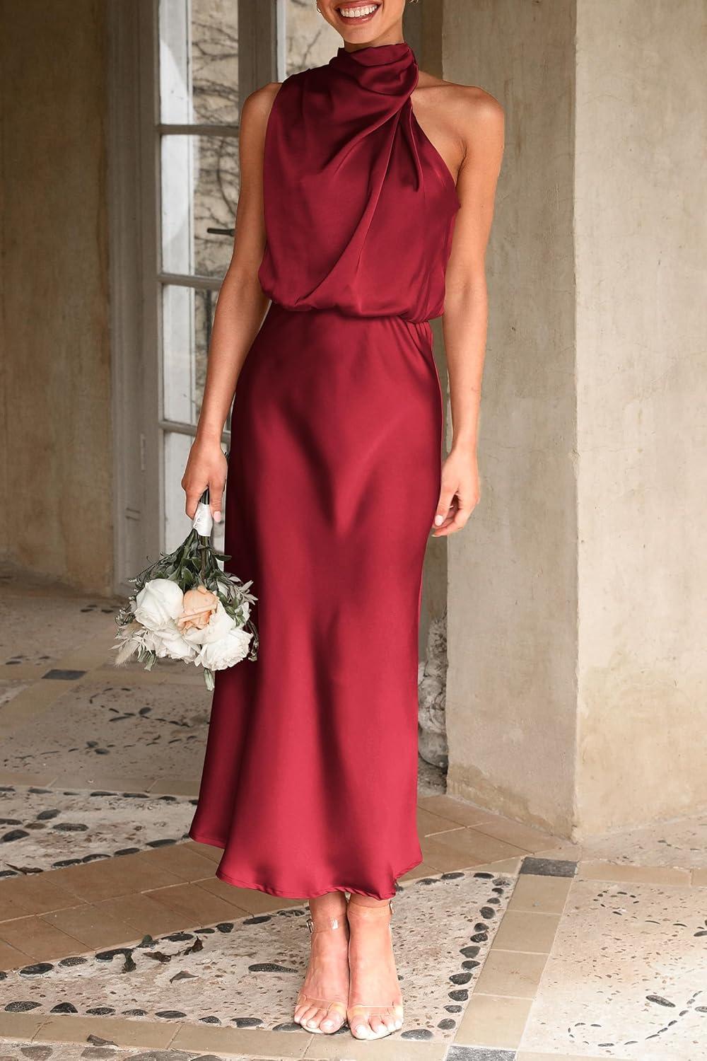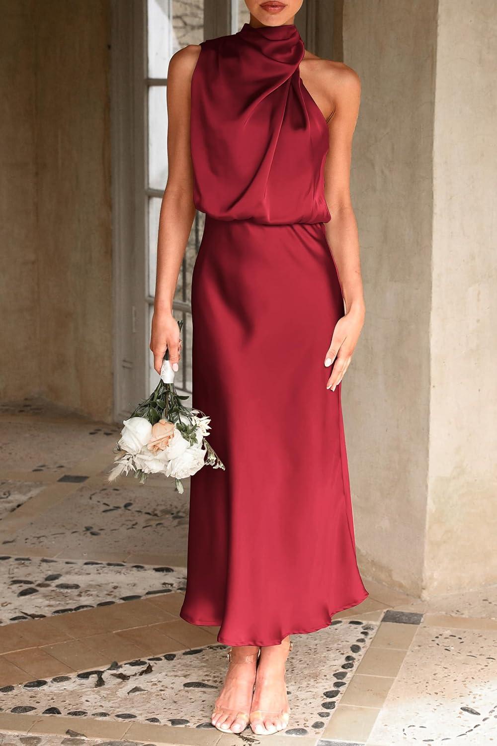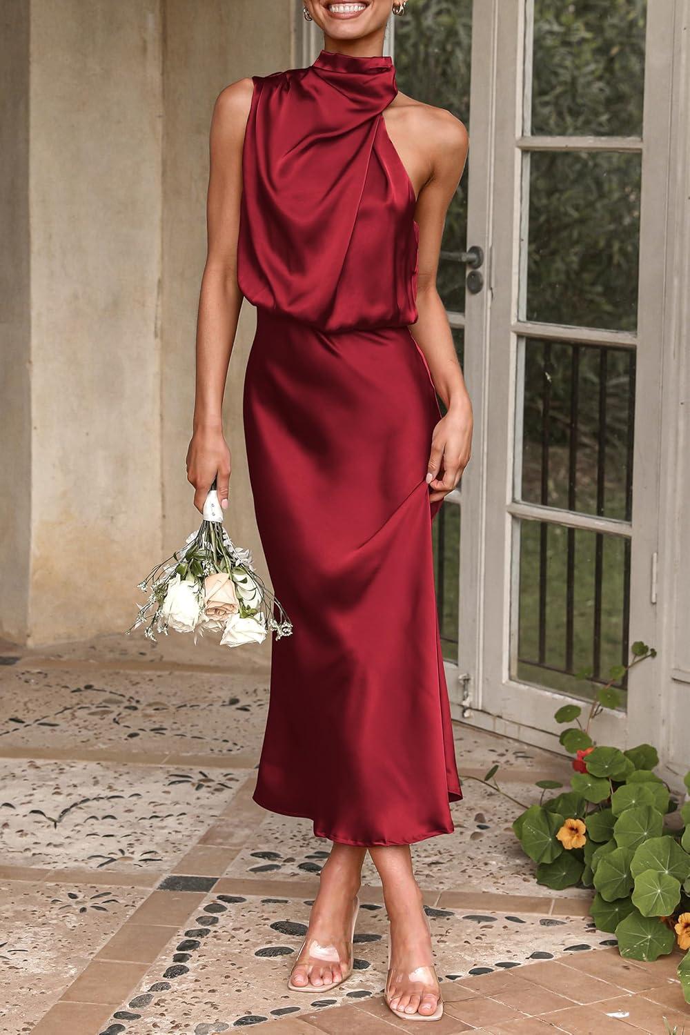 PRETTYGARDEN Women’s 2025 Summer Satin Dress Elegant Sleeveless Mock Neck Cocktail Party Maxi Dresses(Deep Red)
