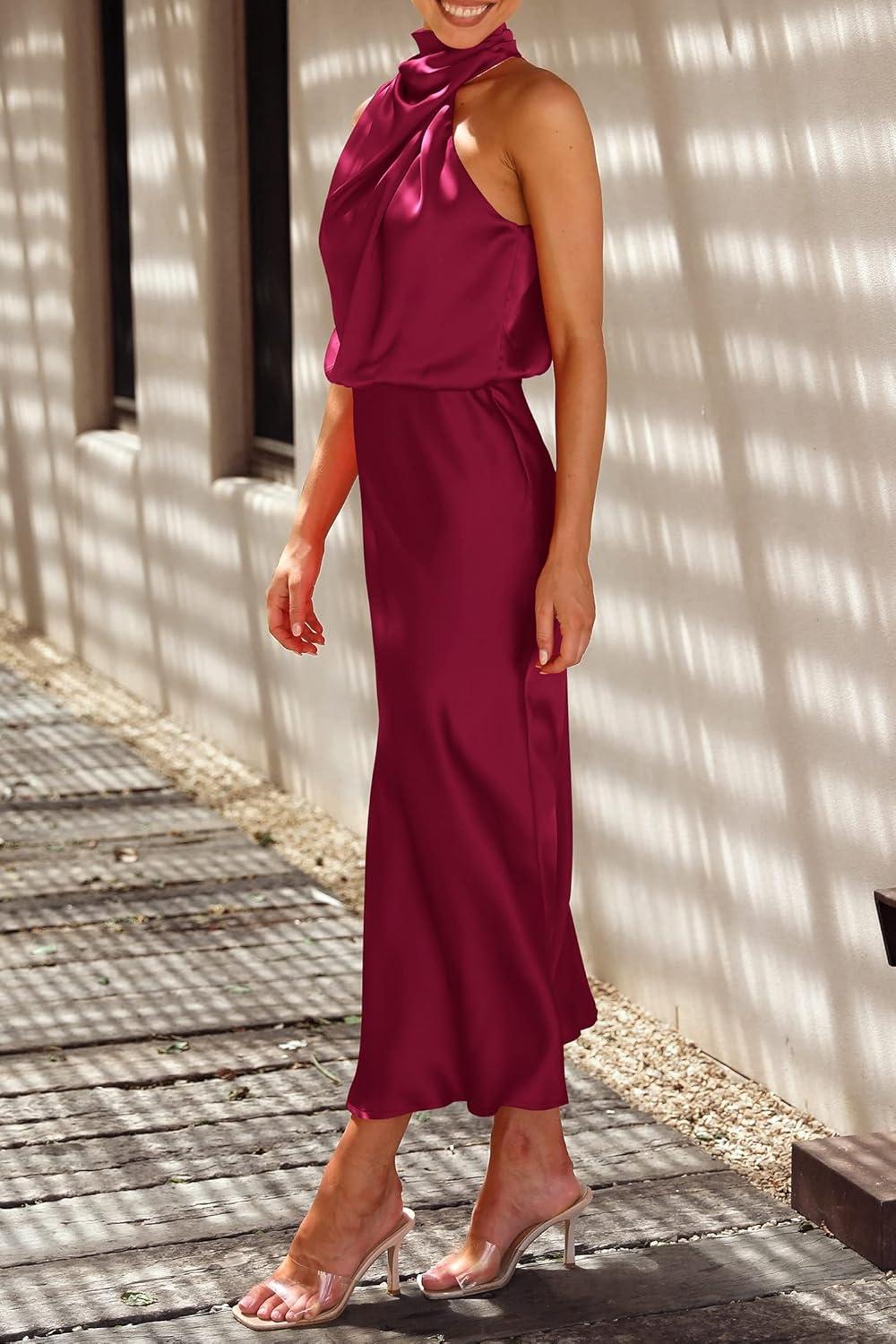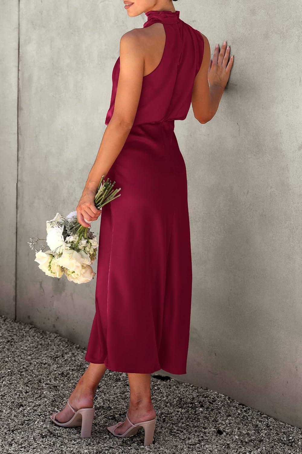 PRETTYGARDEN Women’s 2025 Summer Satin Dress Elegant Sleeveless Mock Neck Cocktail Party Maxi Dresses(Deep Red)