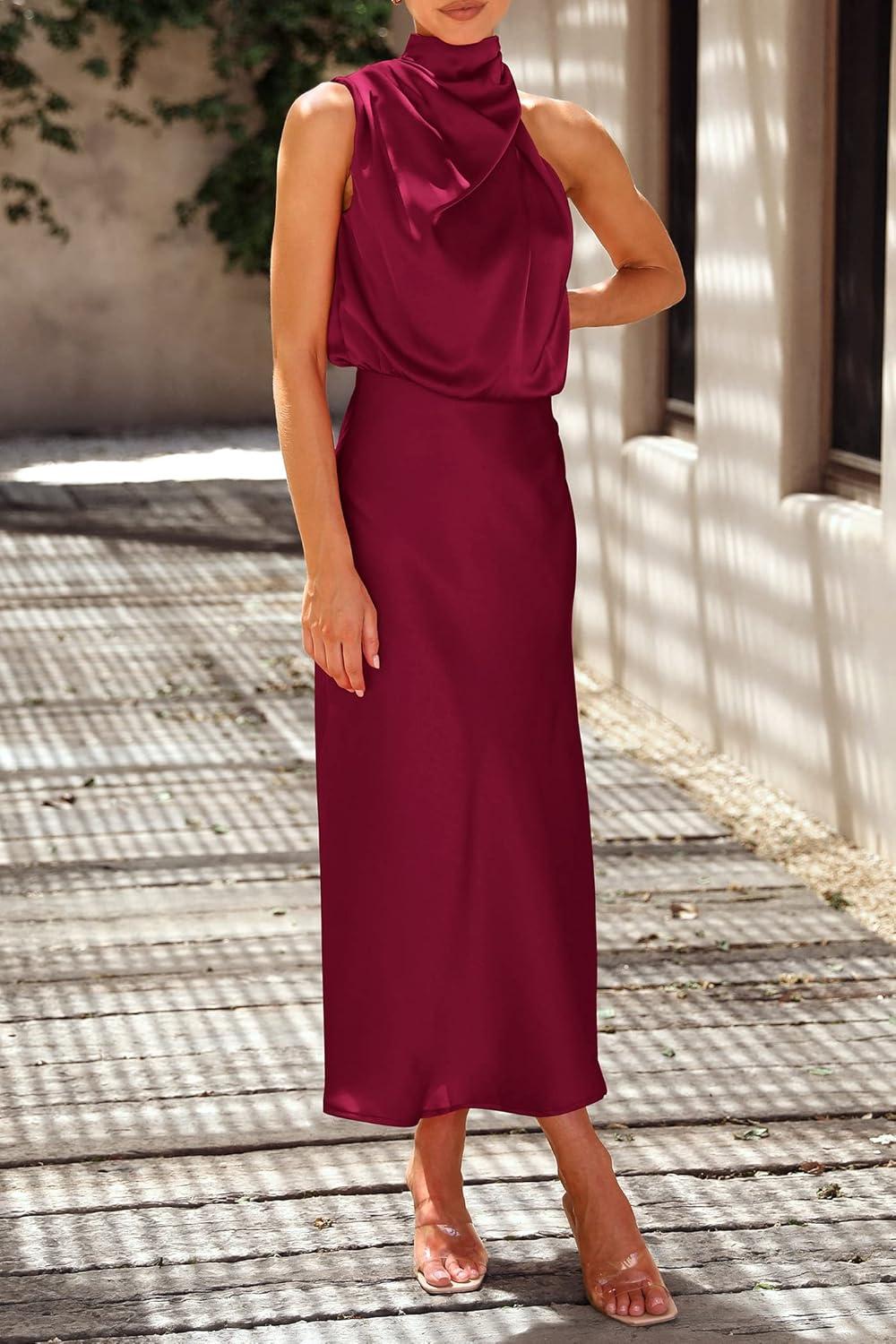 PRETTYGARDEN Women’s 2025 Summer Satin Dress Elegant Sleeveless Mock Neck Cocktail Party Maxi Dresses(Dark Wine Red)
