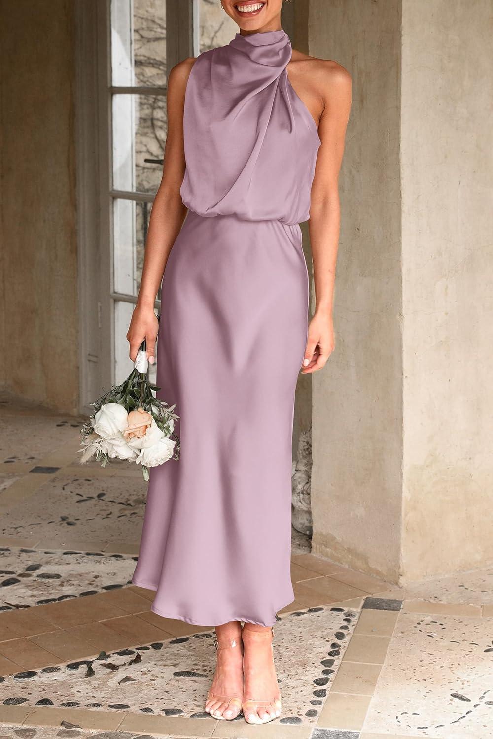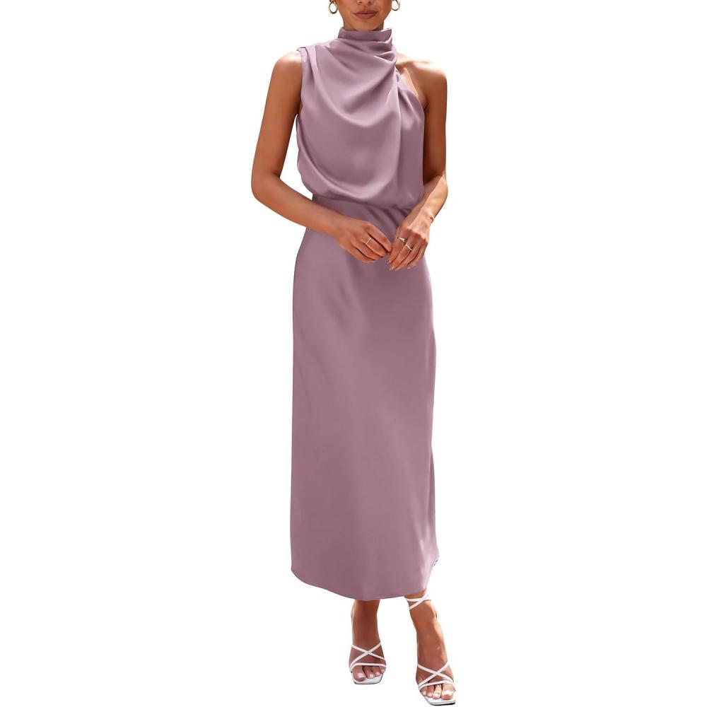 PRETTYGARDEN Women’s 2025 Summer Satin Dress Elegant Sleeveless Mock Neck Cocktail Party Maxi Dresses(Dusty Pink)