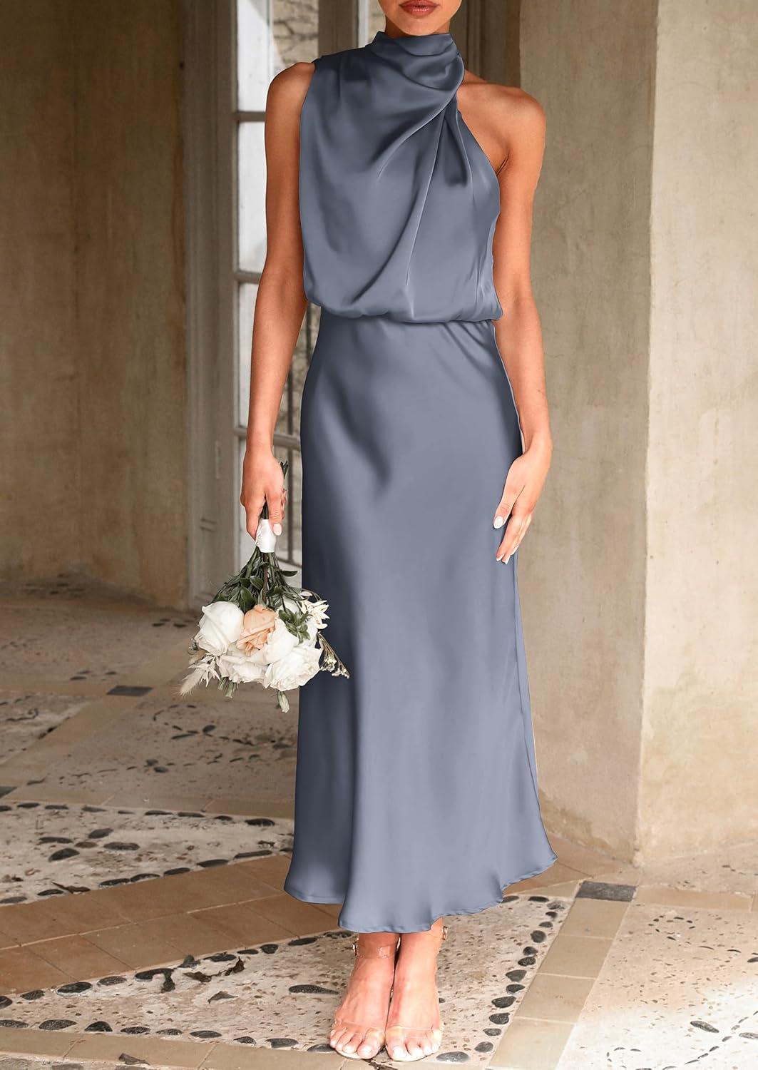 PRETTYGARDEN Women’s 2025 Summer Satin Dress Elegant Sleeveless Mock Neck Cocktail Party Maxi Dresses(Grey Blue)