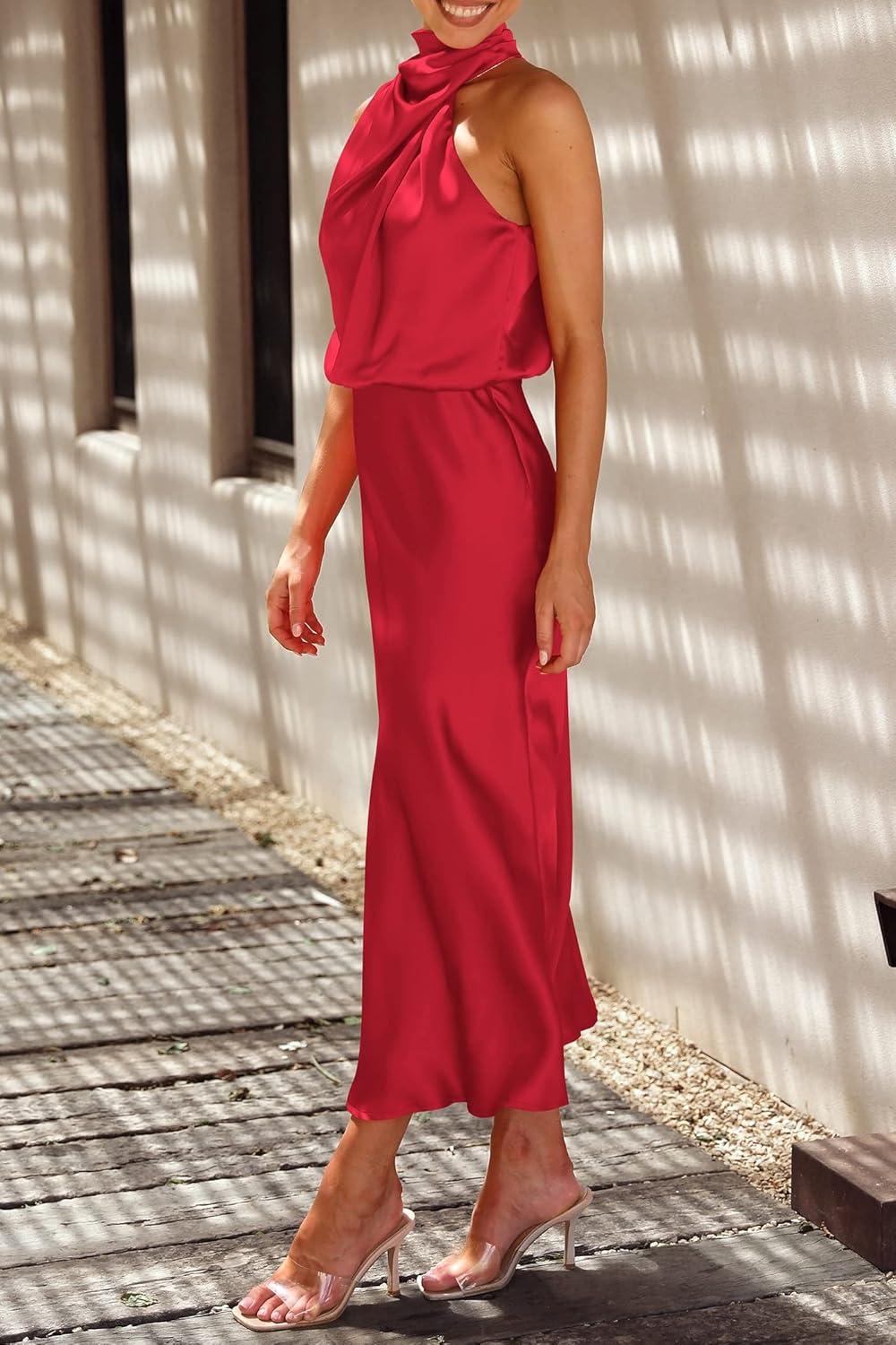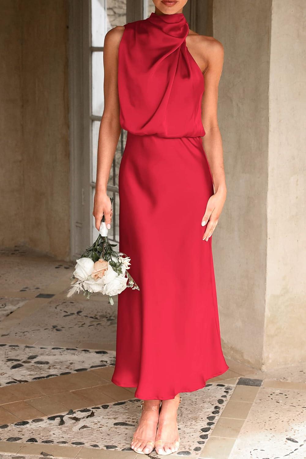 PRETTYGARDEN Women's 2025 Summer Satin Dress Elegant Sleeveless Mock Neck Cocktail Party Maxi Dresses(Red)