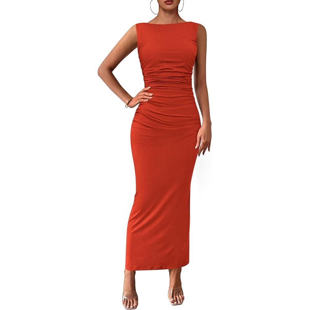 PRETTYGARDEN Women’s 2025 Summer Semi Formal Midi Dresses Sleeveless Ruched Bodycon Long Elegant Cocktail Wedding Guest Dress(Brick Red)