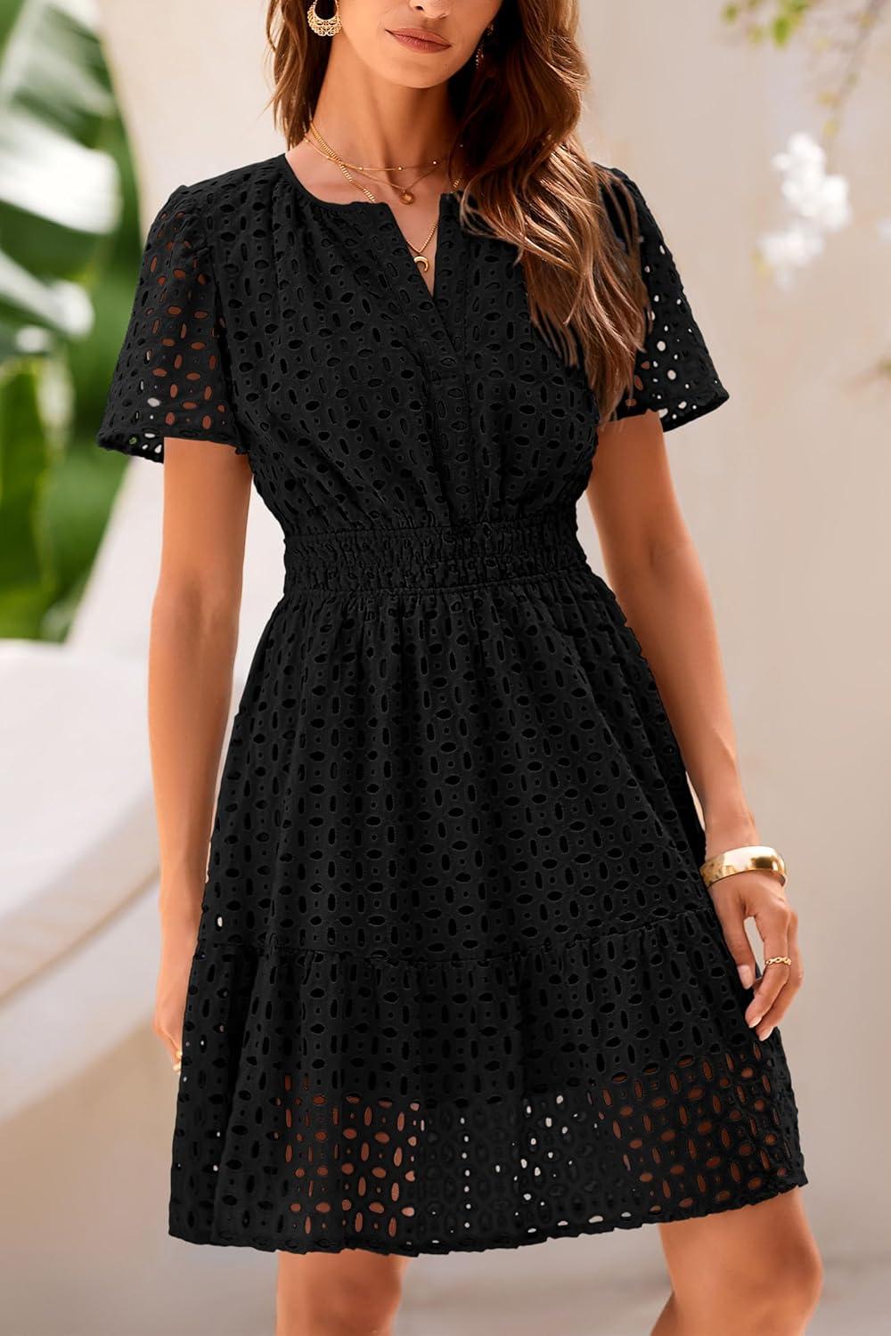 PRETTYGARDEN Womens 2025 Summer Short Dress V Neck Short Sleeve A Line Hollow Out Lace Ruffle Cute Casual Beach Party Dresses(Black)