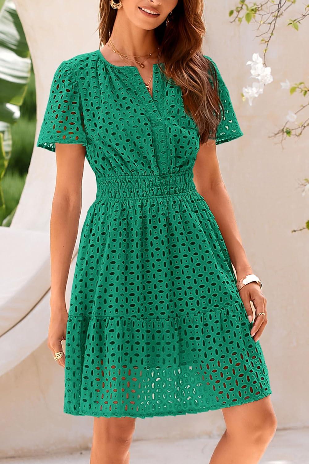 PRETTYGARDEN Womens 2025 Summer Short Dress V Neck Short Sleeve A Line Hollow Out Lace Ruffle Cute Casual Beach Party Dresses(Green)