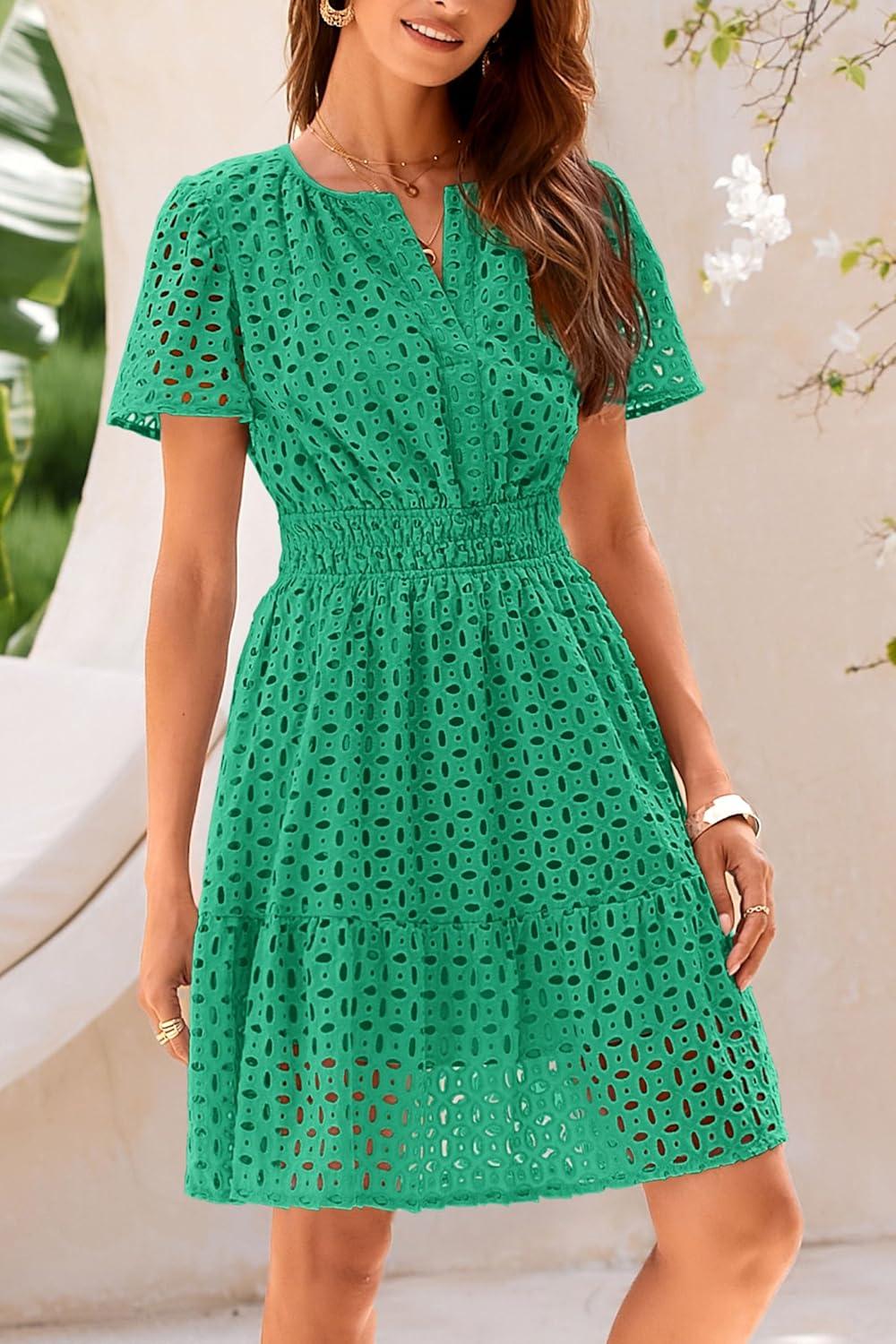 PRETTYGARDEN Womens 2025 Summer Short Dress V Neck Short Sleeve A Line Hollow Out Lace Ruffle Cute Casual Beach Party Dresses(Green)