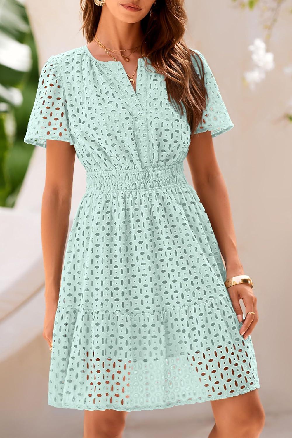 PRETTYGARDEN Womens 2025 Summer Short Dress V Neck Short Sleeve A Line Hollow Out Lace Ruffle Cute Casual Beach Party Dresses(Light Green)