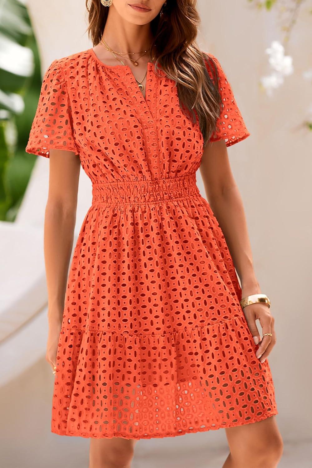 PRETTYGARDEN Womens 2025 Summer Short Dress V Neck Short Sleeve A Line Hollow Out Lace Ruffle Cute Casual Beach Party Dresses(Orange)
