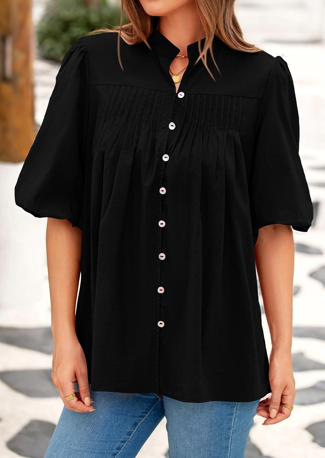 PRETTYGARDEN Women's 2025 Summer Short Lantern Sleeve Tops Loose Fit Button Down Shirt Pleated V Neck Blouses Trendy Clothes(Black)