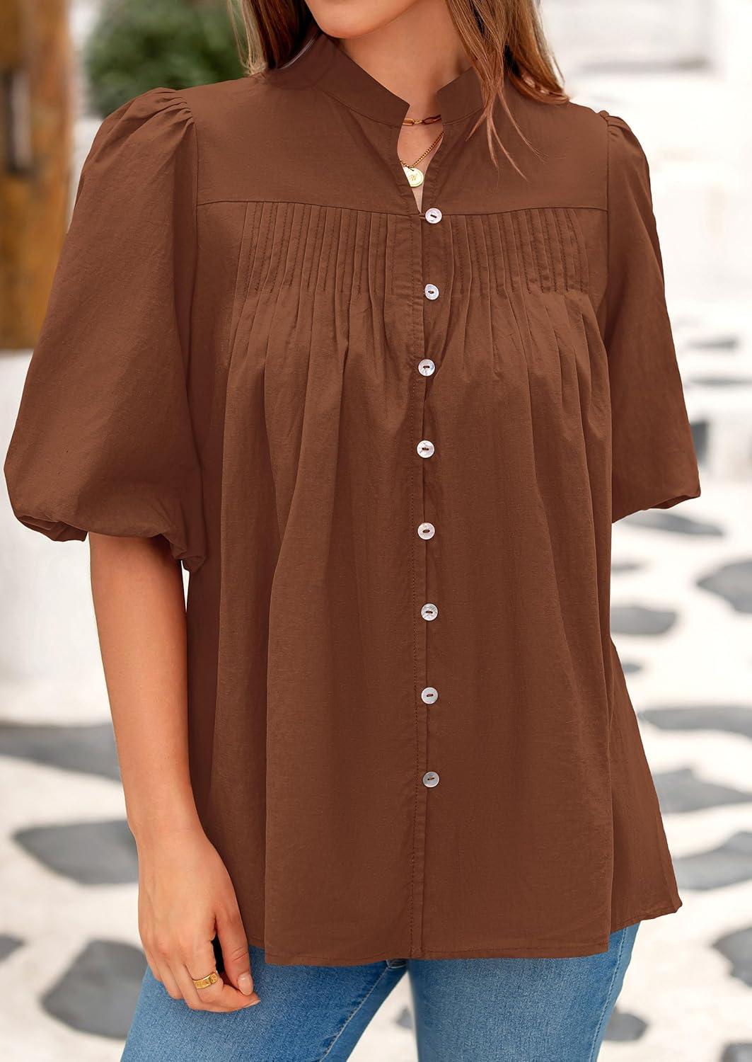 PRETTYGARDEN Women's 2025 Summer Short Lantern Sleeve Tops Loose Fit Button Down Shirt Pleated V Neck Blouses Trendy Clothes(Brown)