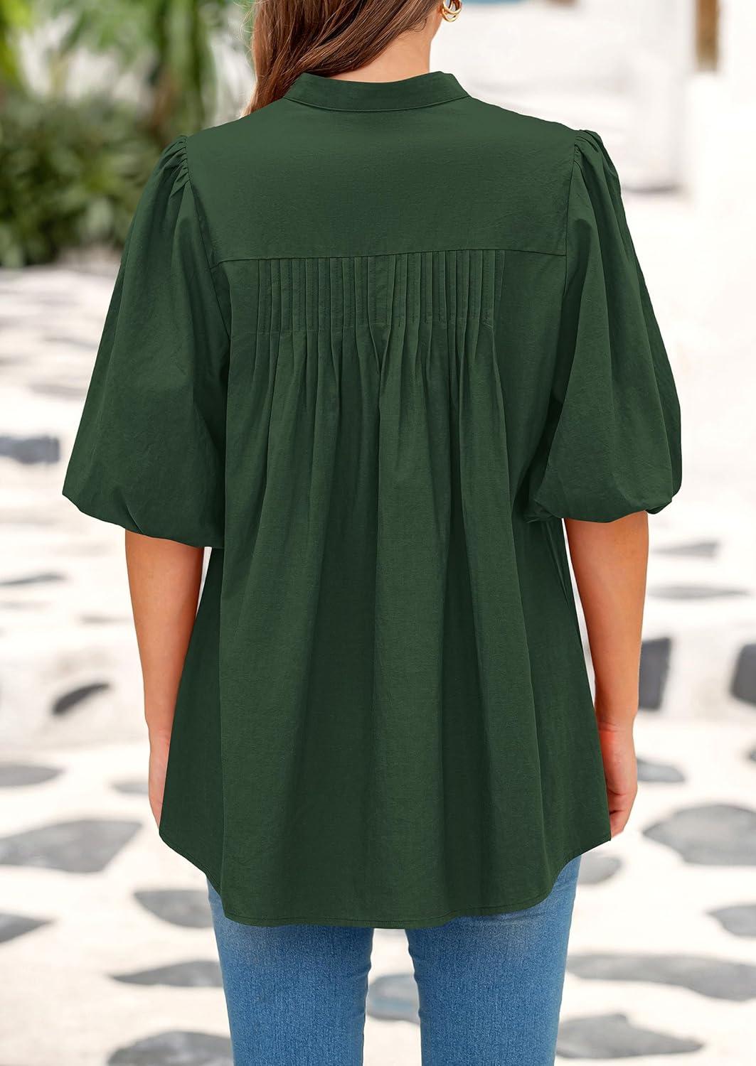 PRETTYGARDEN Women's 2025 Summer Short Lantern Sleeve Tops Loose Fit Button Down Shirt Pleated V Neck Blouses Trendy Clothes(Dark Green)