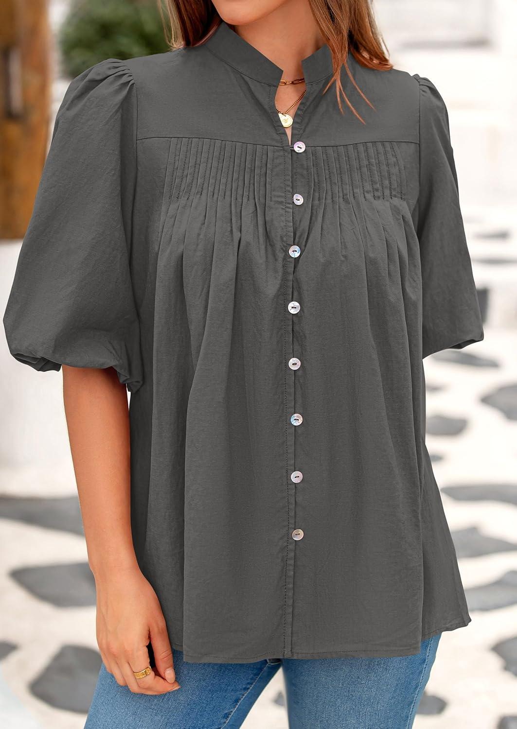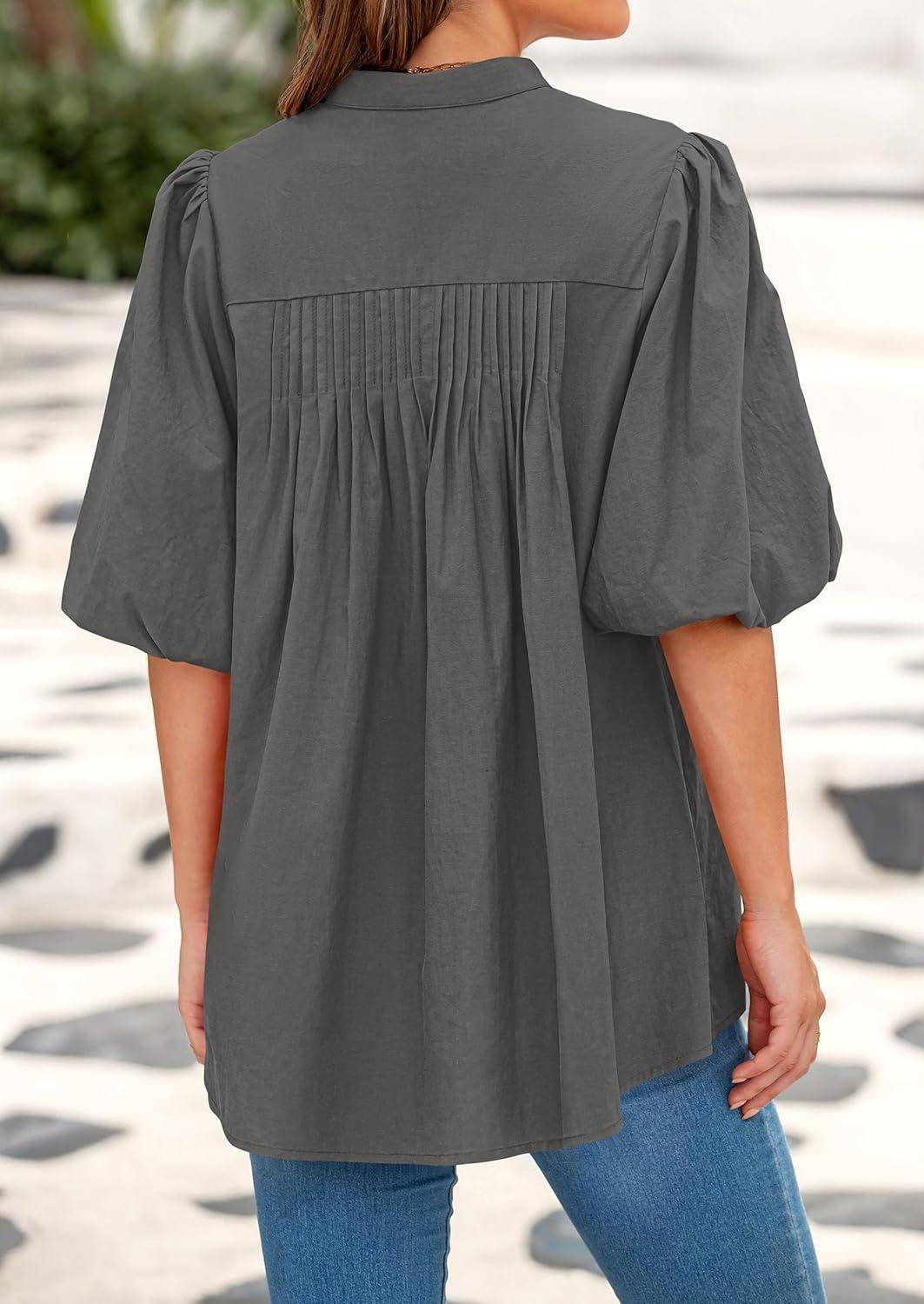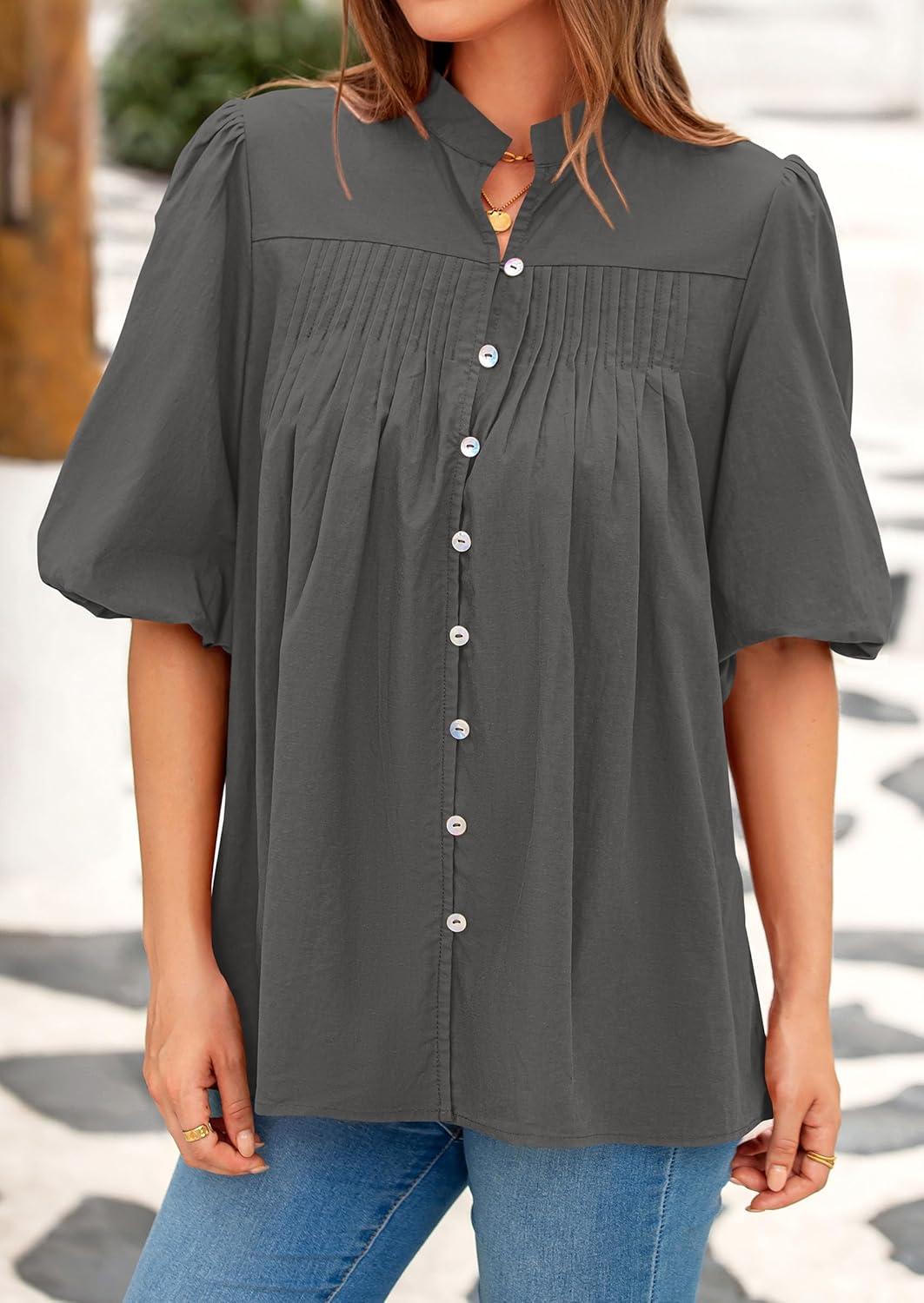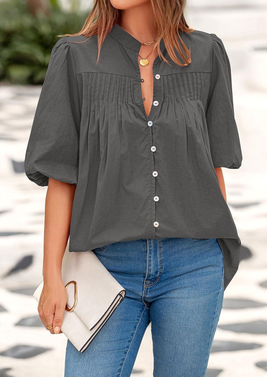 PRETTYGARDEN Women's 2025 Summer Short Lantern Sleeve Tops Loose Fit Button Down Shirt Pleated V Neck Blouses Trendy Clothes(Grey)