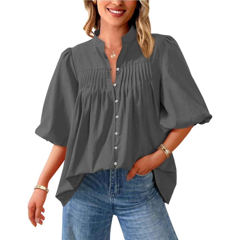 PRETTYGARDEN Women’s 2025 Summer Short Lantern Sleeve Tops Loose Fit Button Down Shirt Pleated V Neck Blouses Trendy Clothes(Grey)