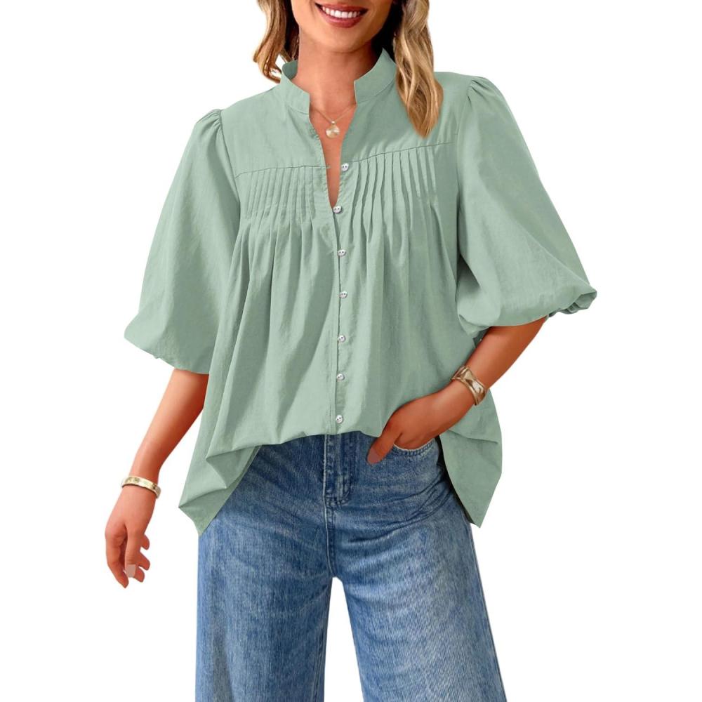PRETTYGARDEN Women's 2025 Summer Short Lantern Sleeve Tops Loose Fit Button Down Shirt Pleated V Neck Blouses Trendy Clothes(Light Green)